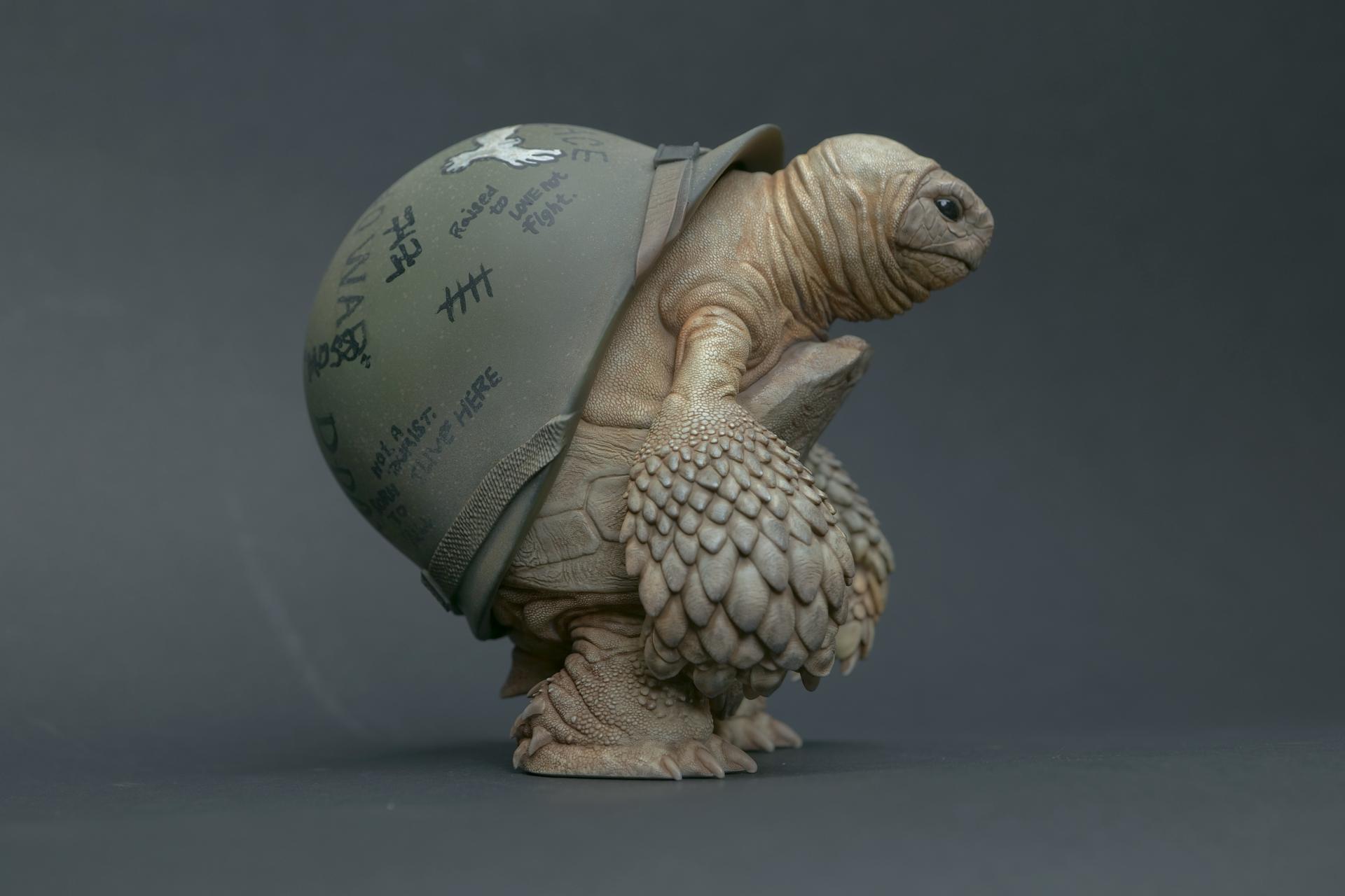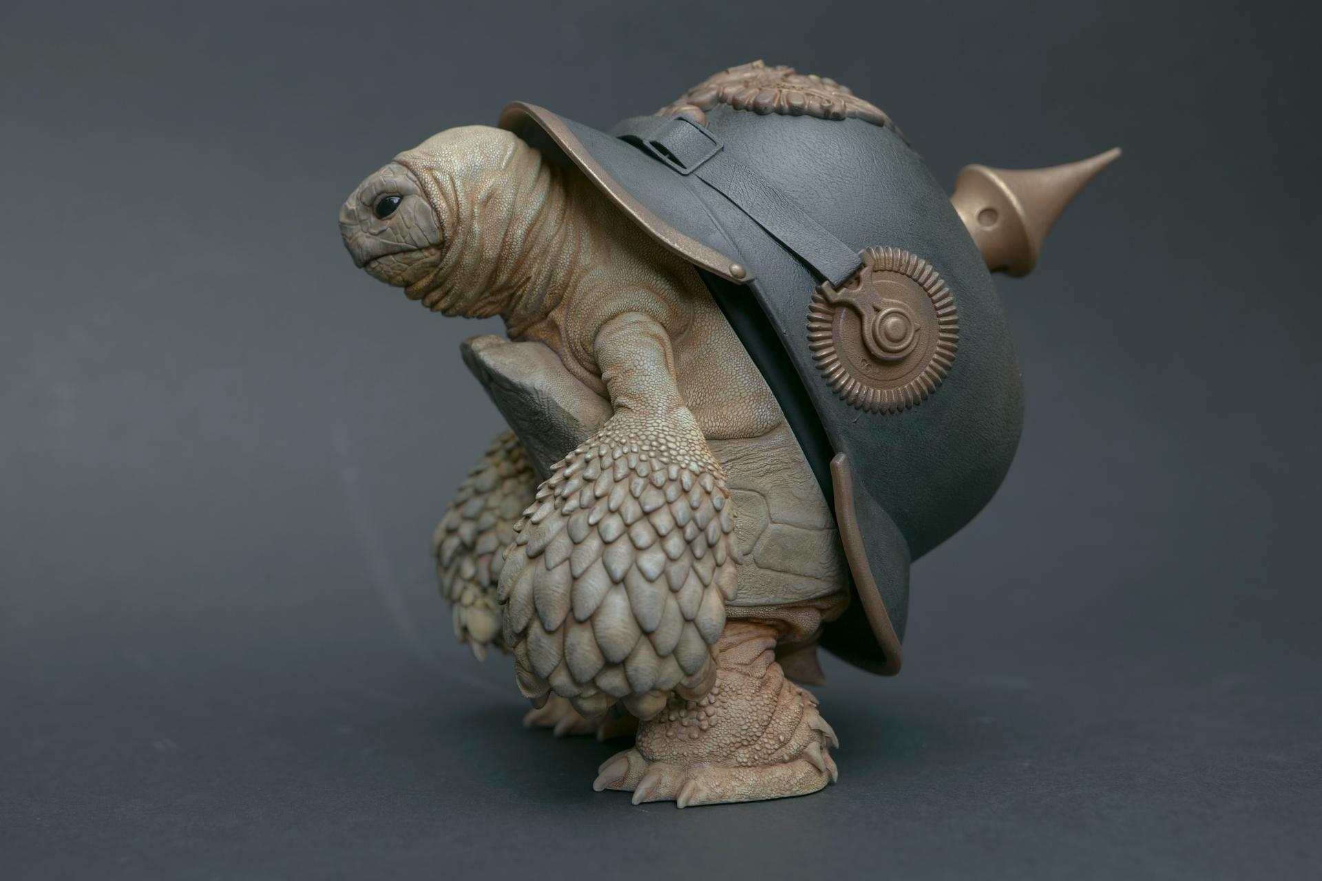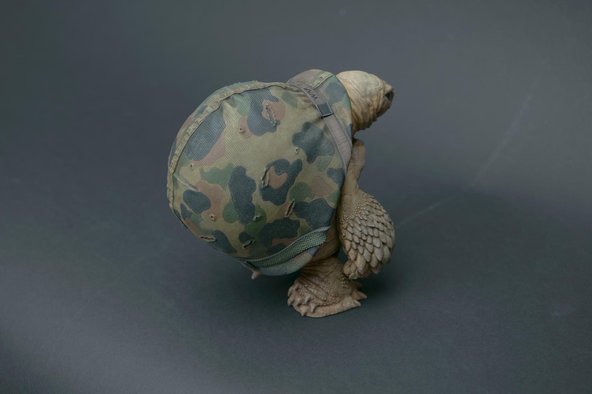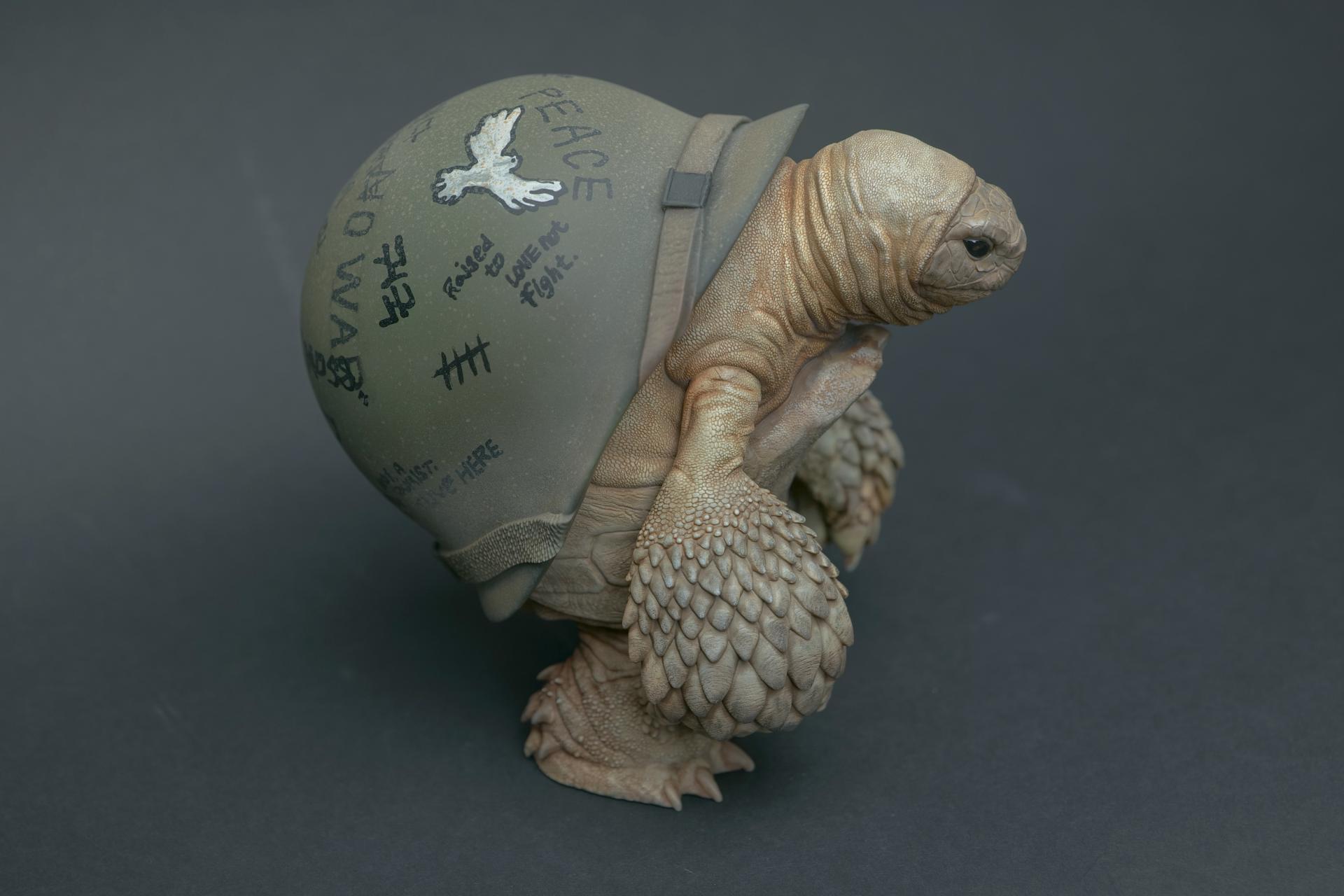 海龟佩戴的头盔象征着精神稳定和身体保护,但它们也传达了关于人类恐惧和焦虑的信息。