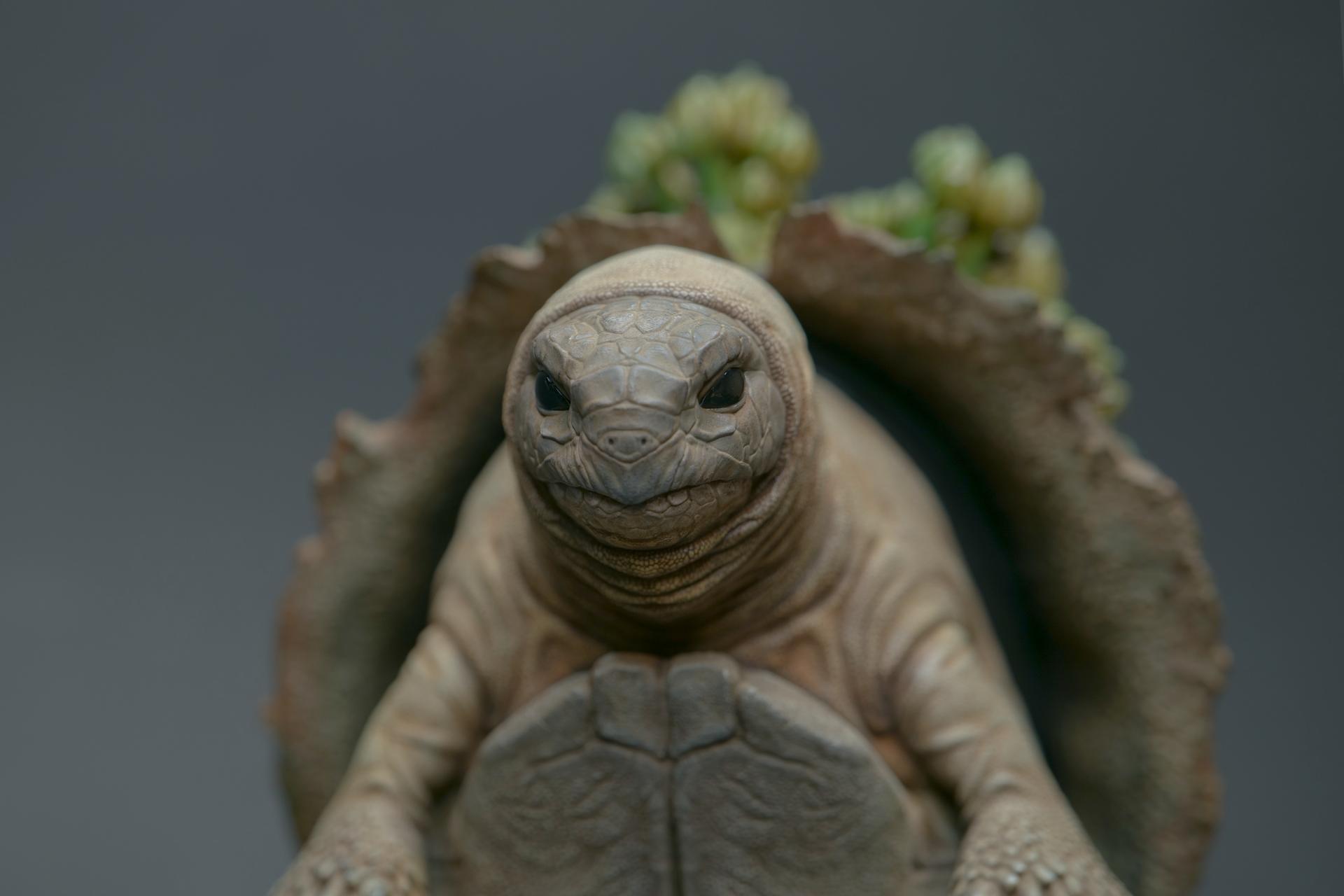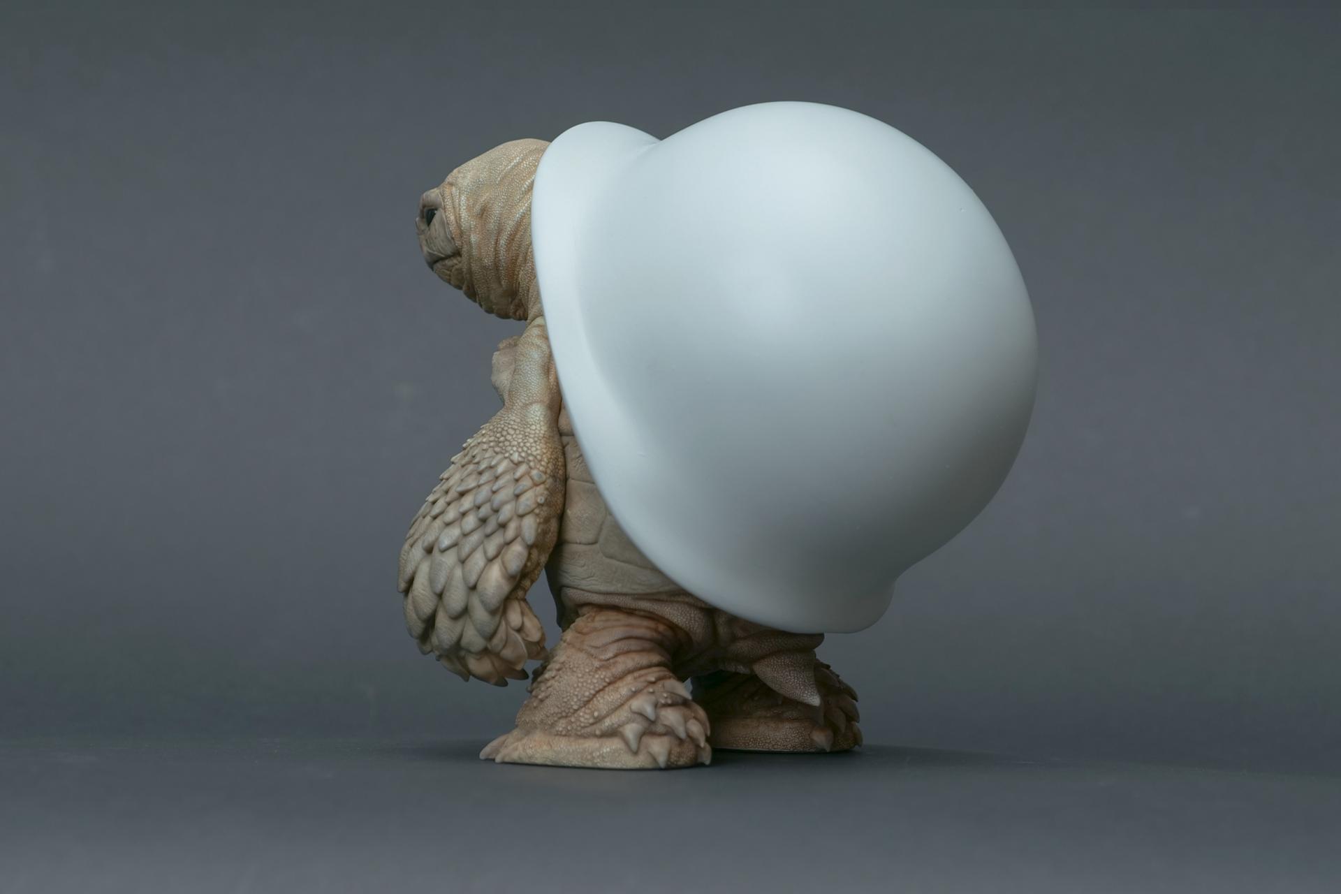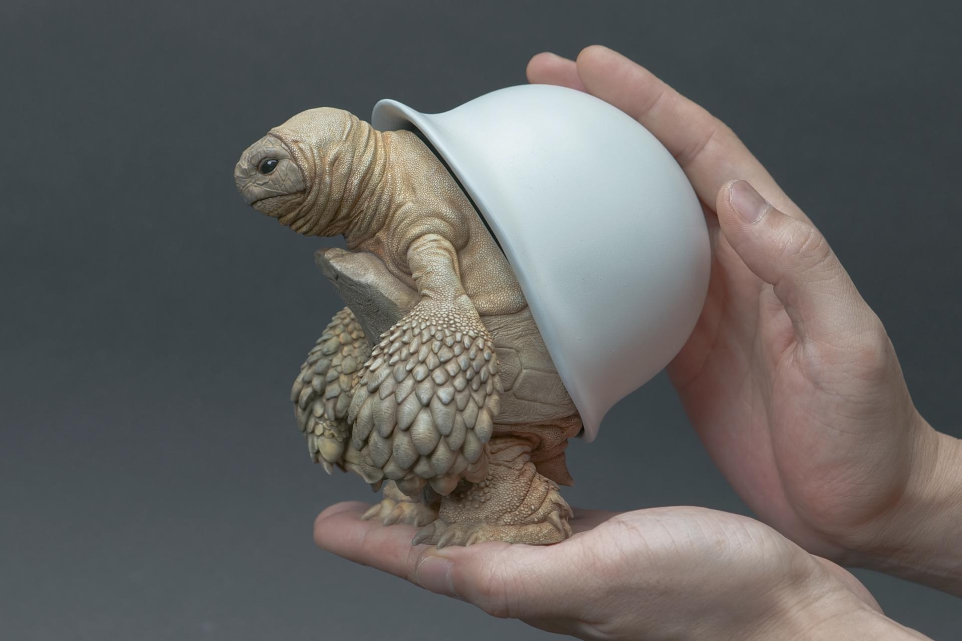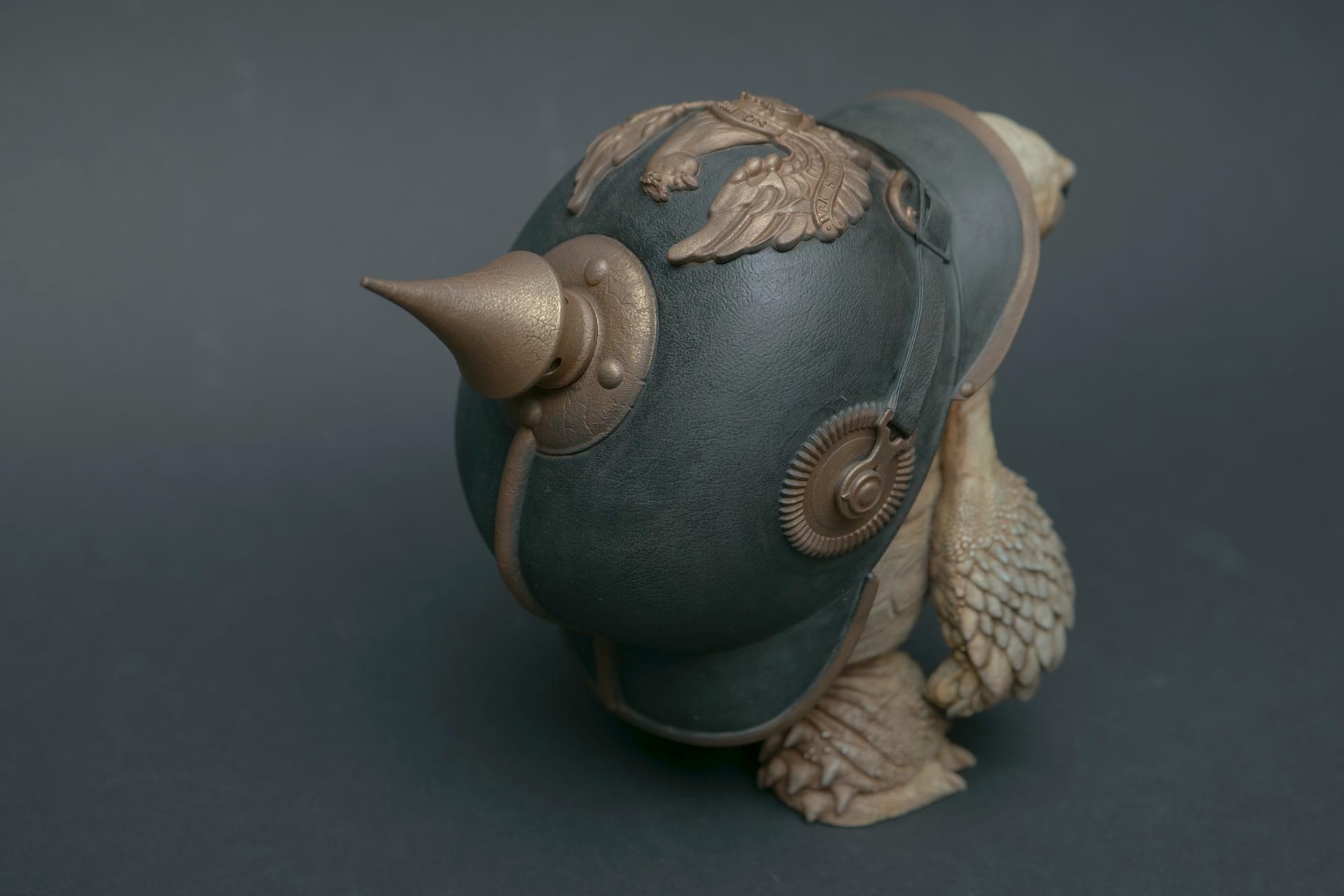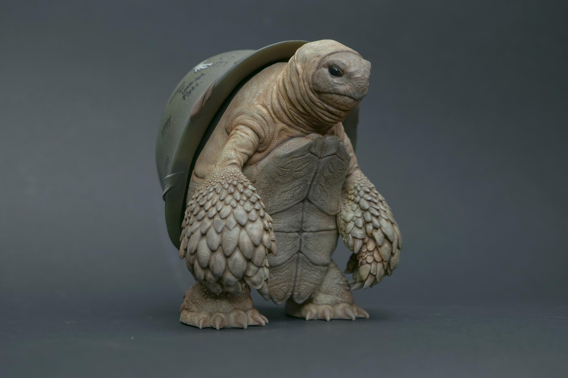 海龟佩戴的头盔象征着精神稳定和身体保护,但它们也传达了关于人类恐惧和焦虑的信息。