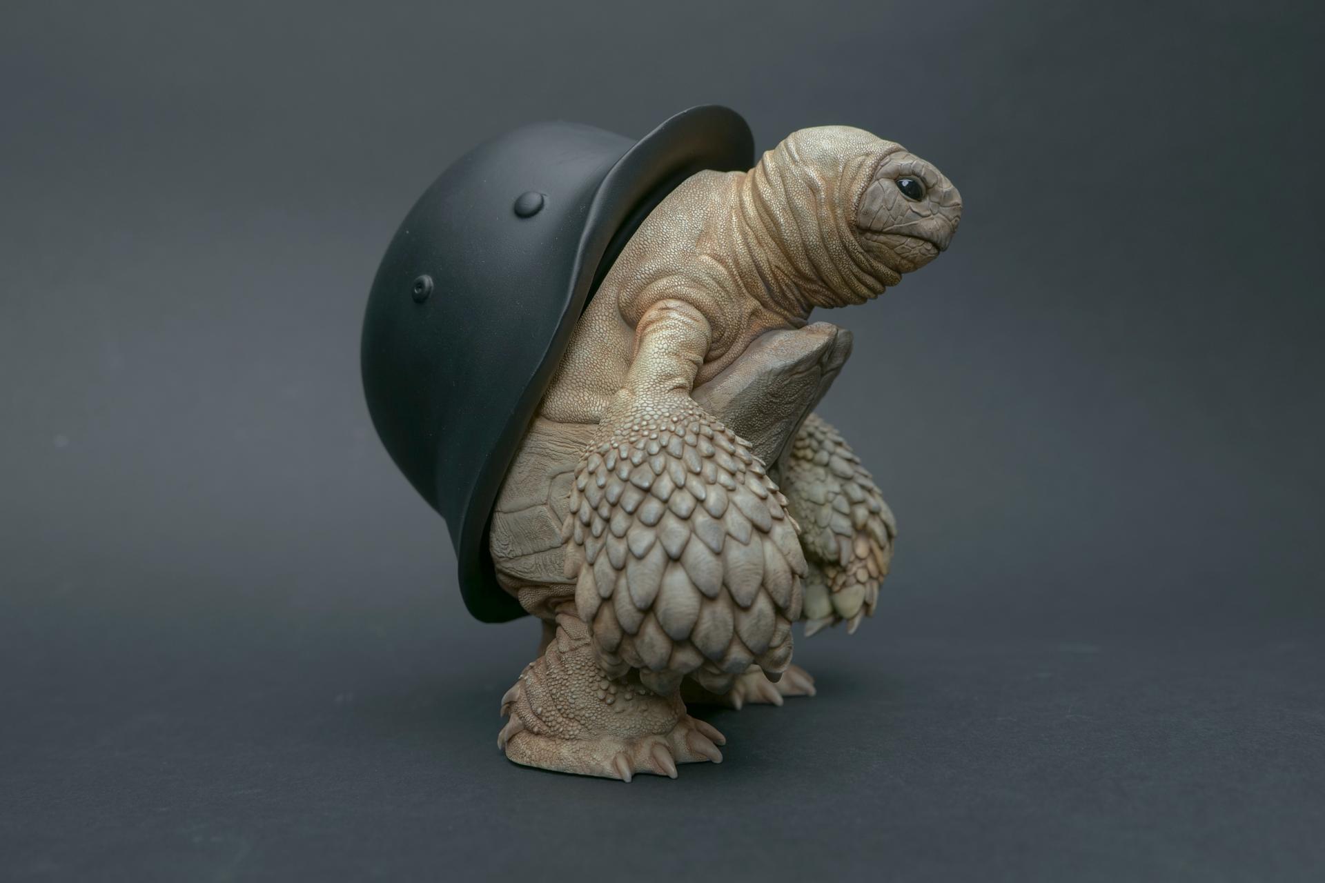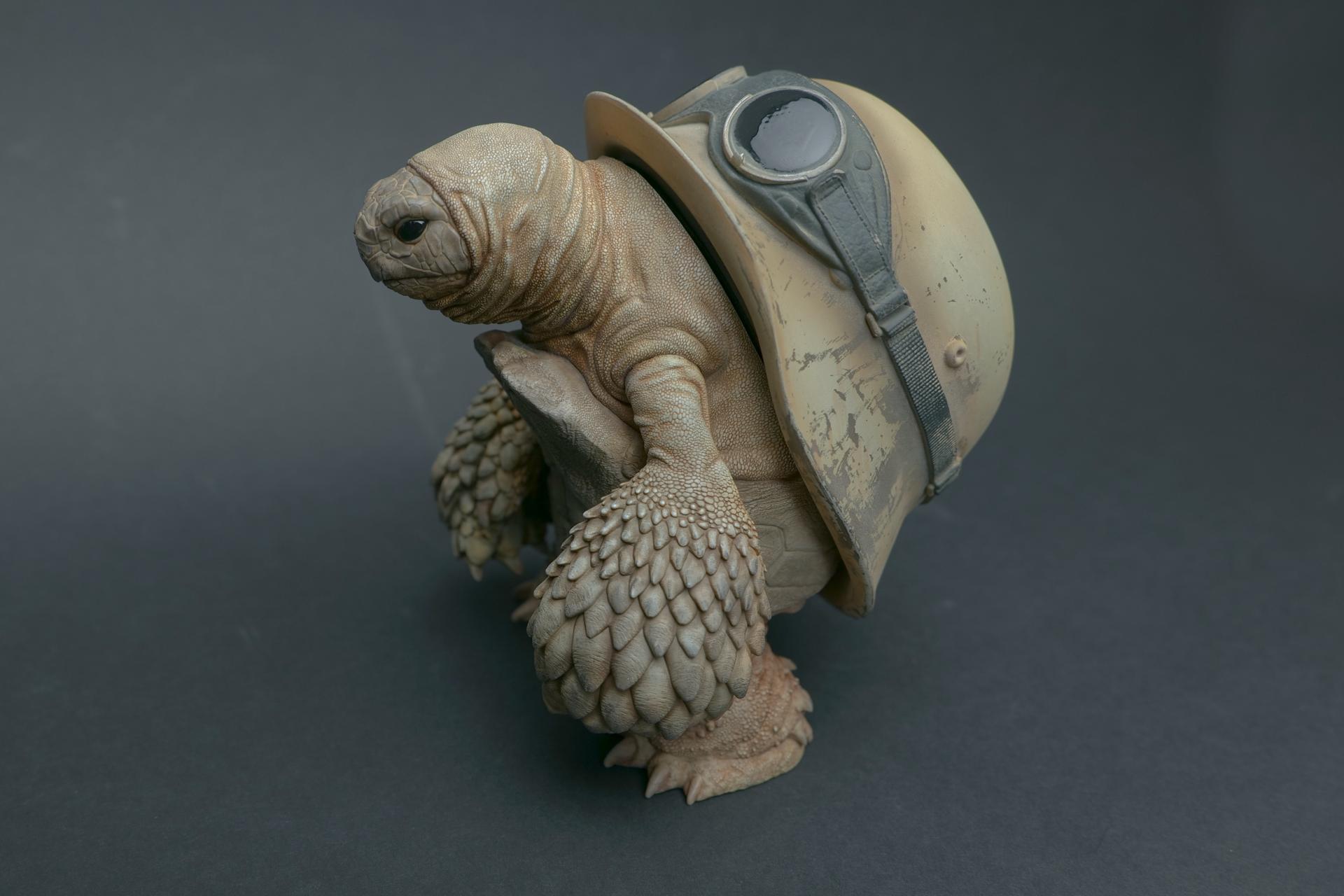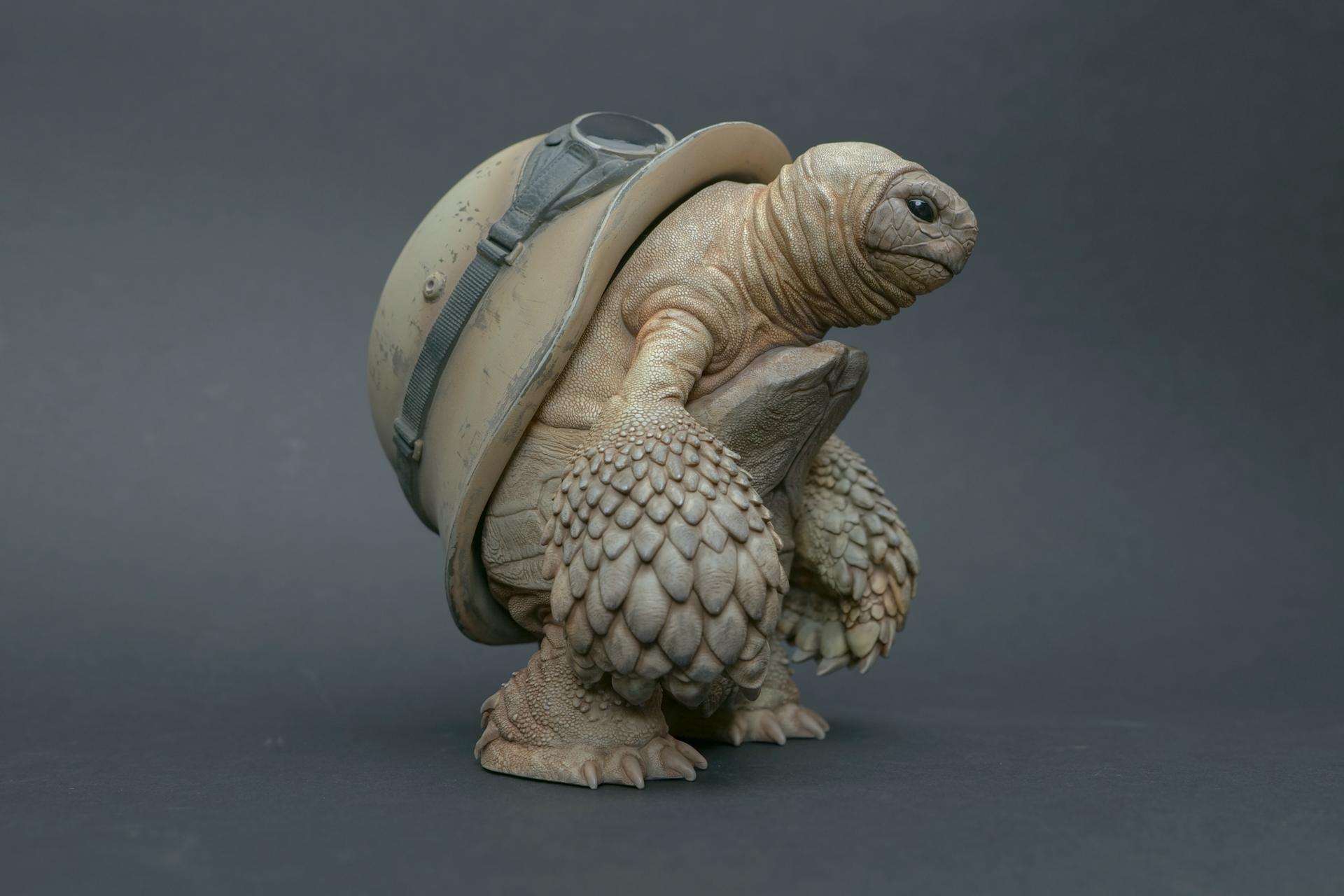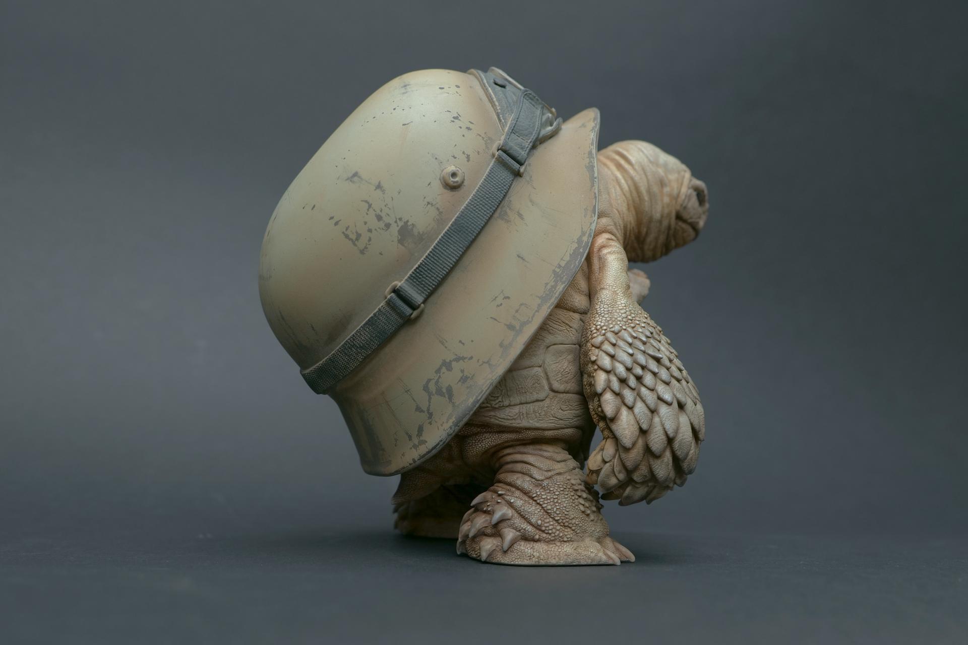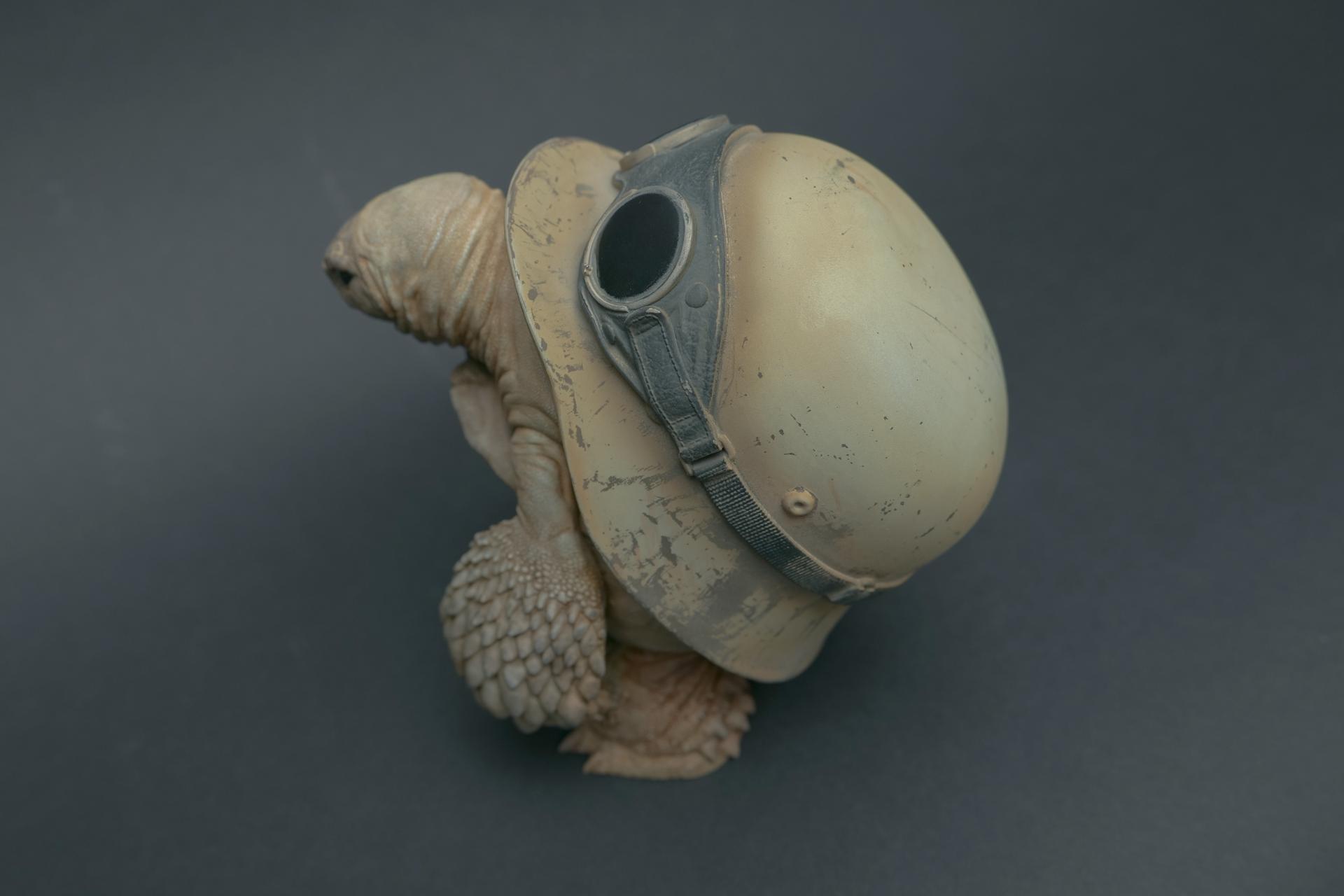 カメが身に着けているヘルメットは、物理的な保護とともに精神的安定を象徴しますが、同時に人間の恐怖や不安に対するメッセージを伝えることもあります。