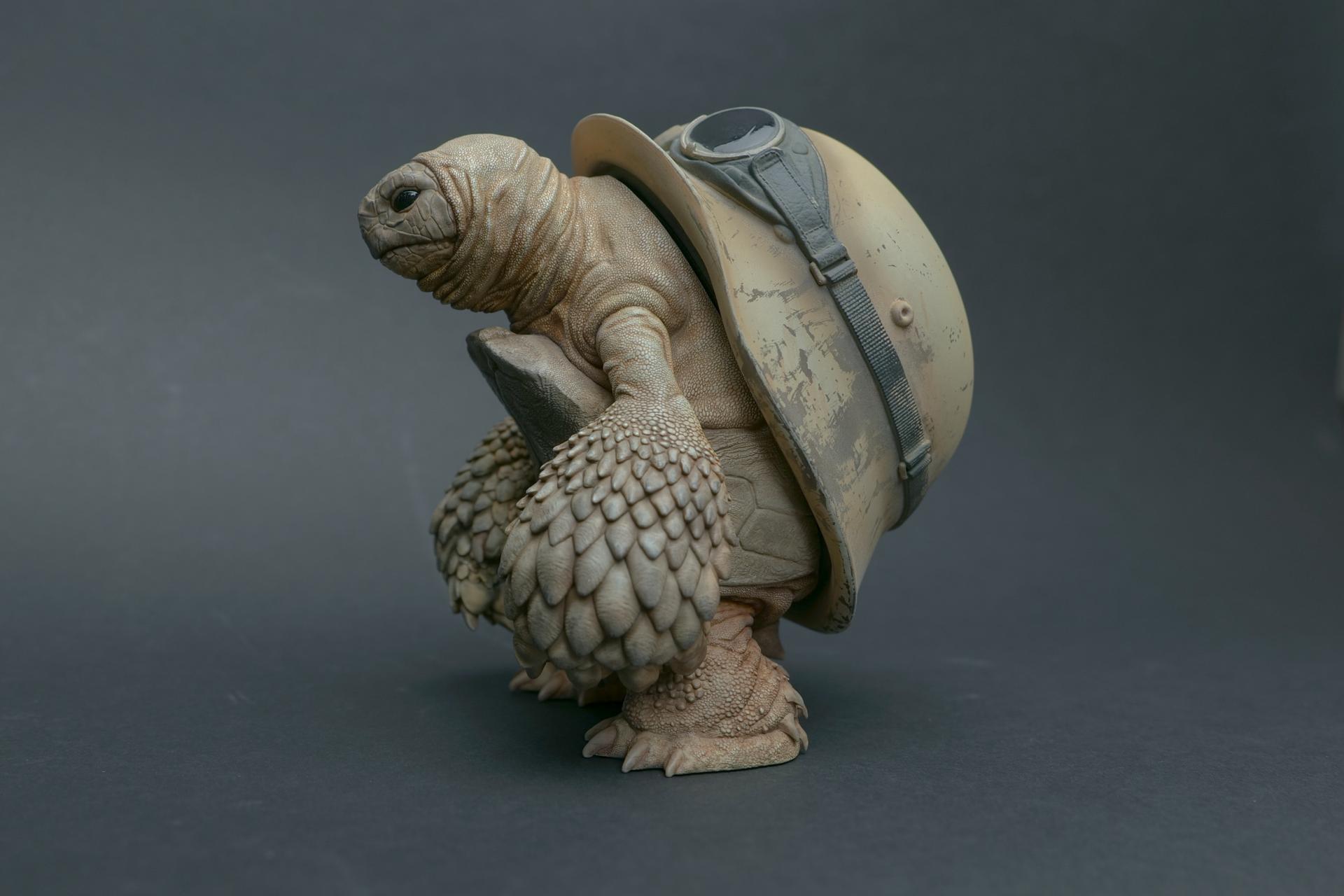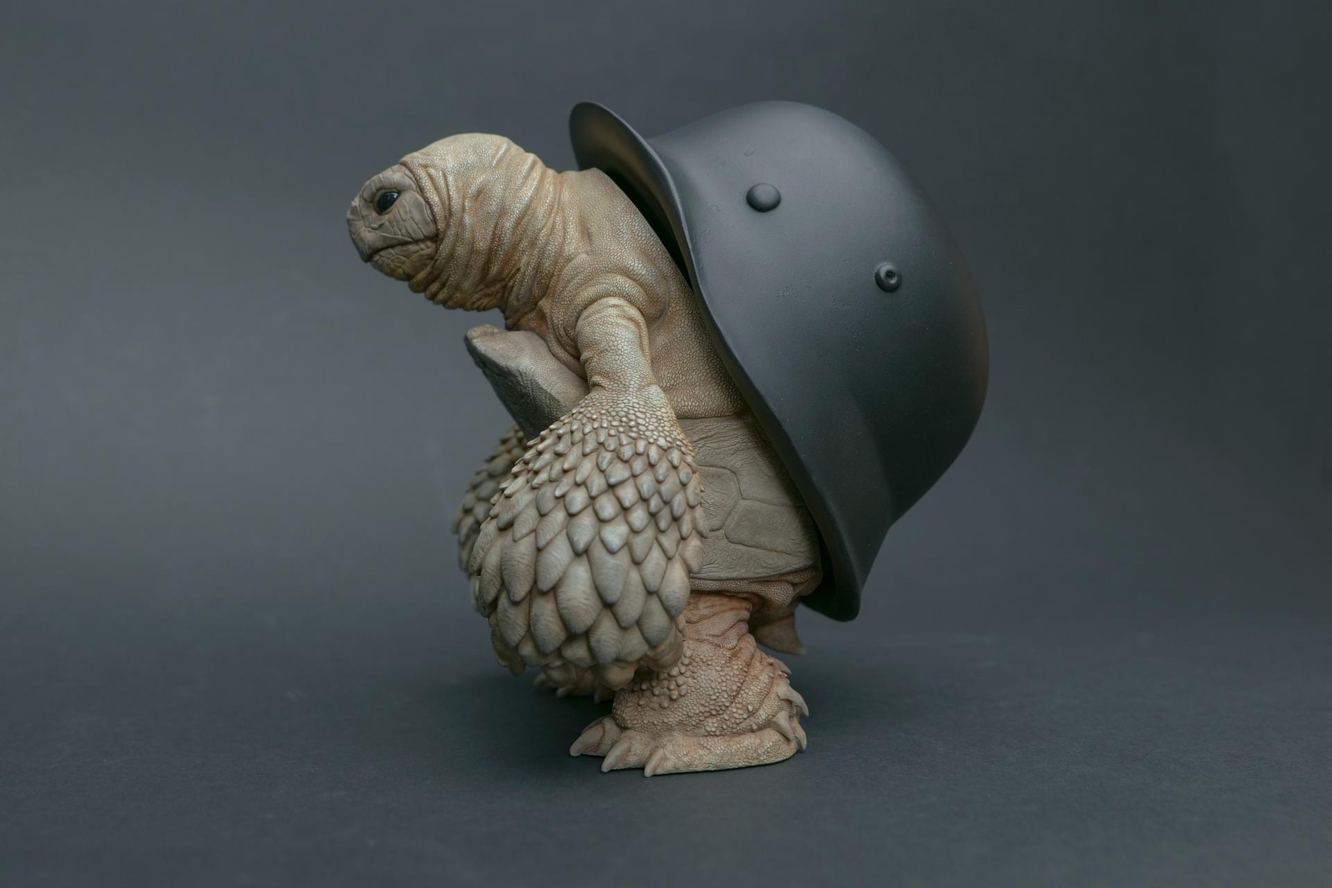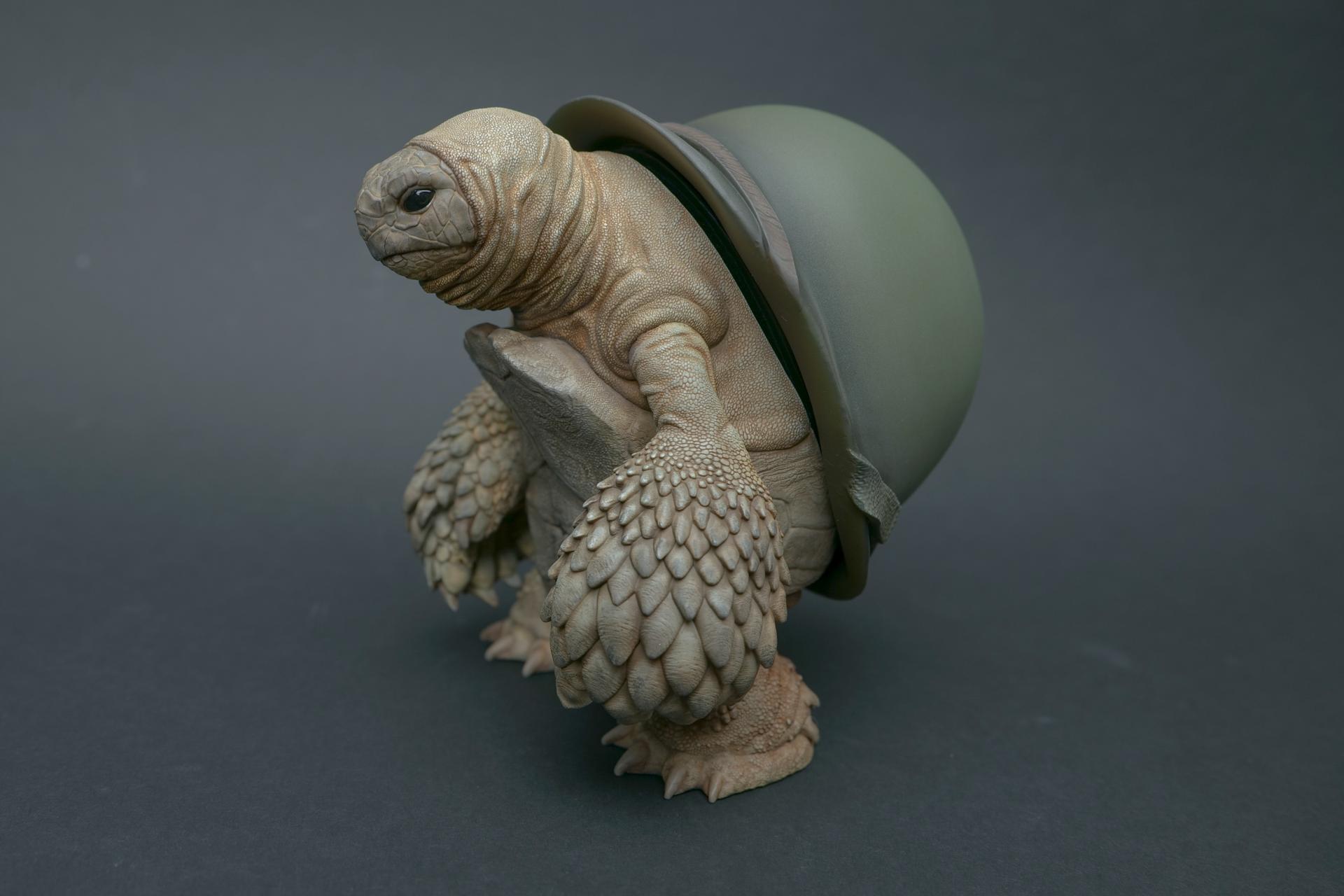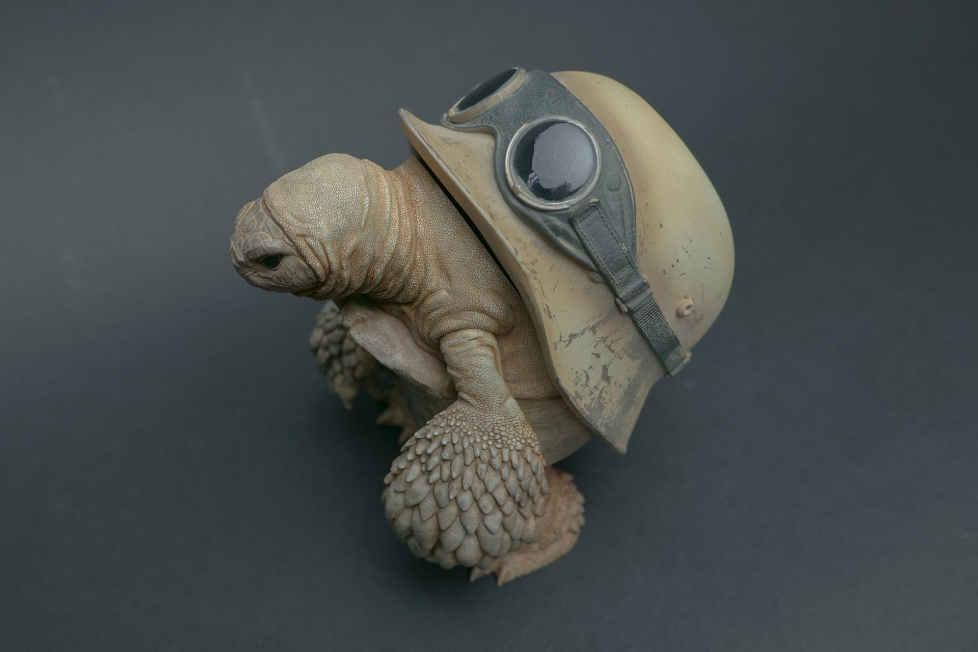 カメが身に着けているヘルメットは、物理的な保護とともに精神的安定を象徴しますが、同時に人間の恐怖や不安に対するメッセージを伝えることもあります。
