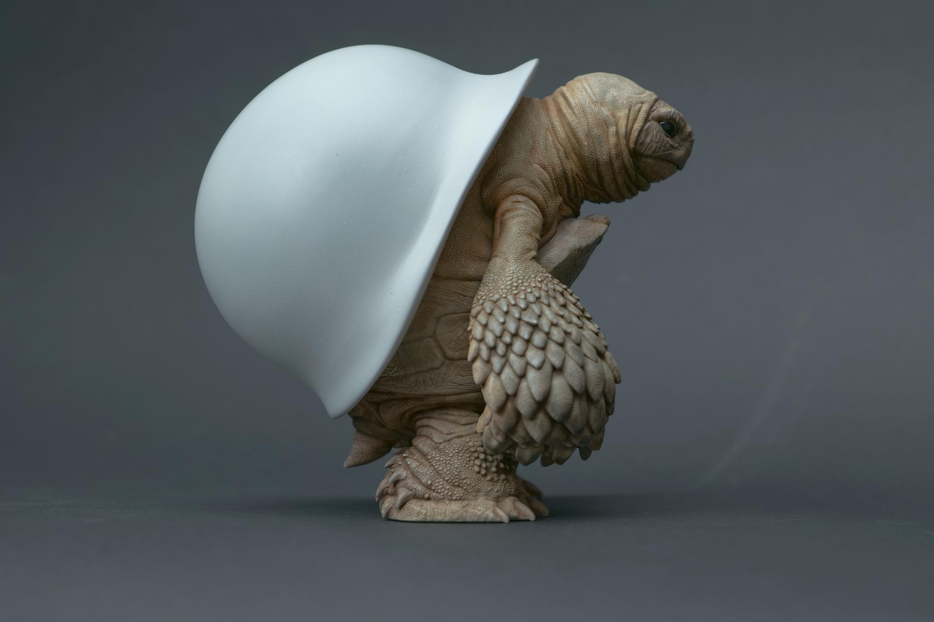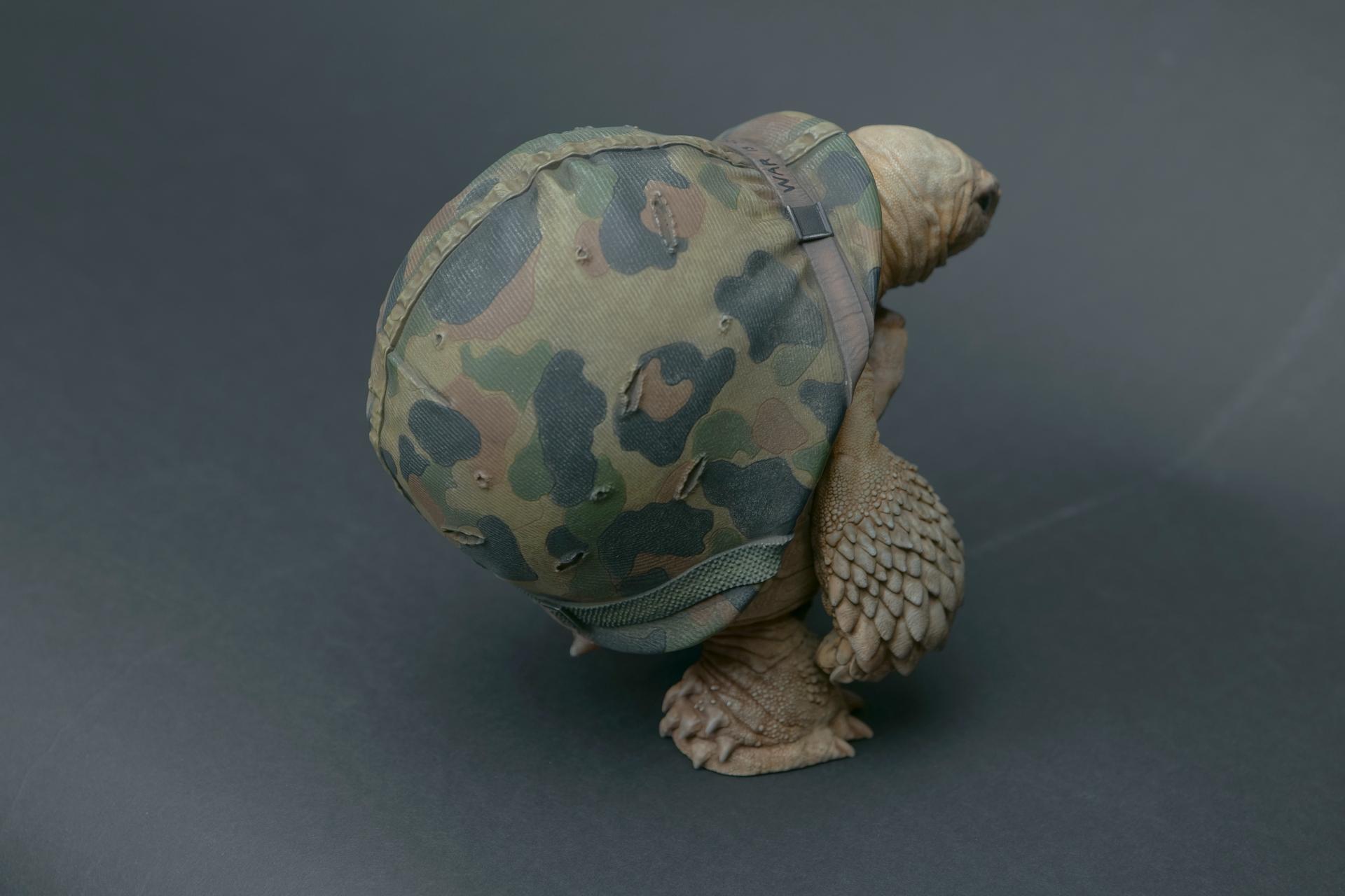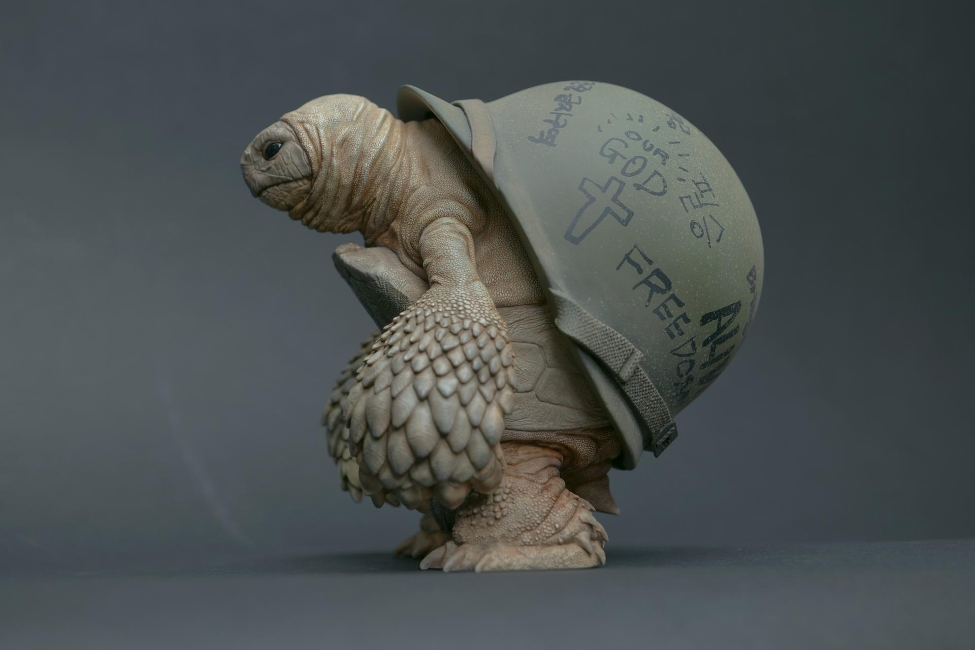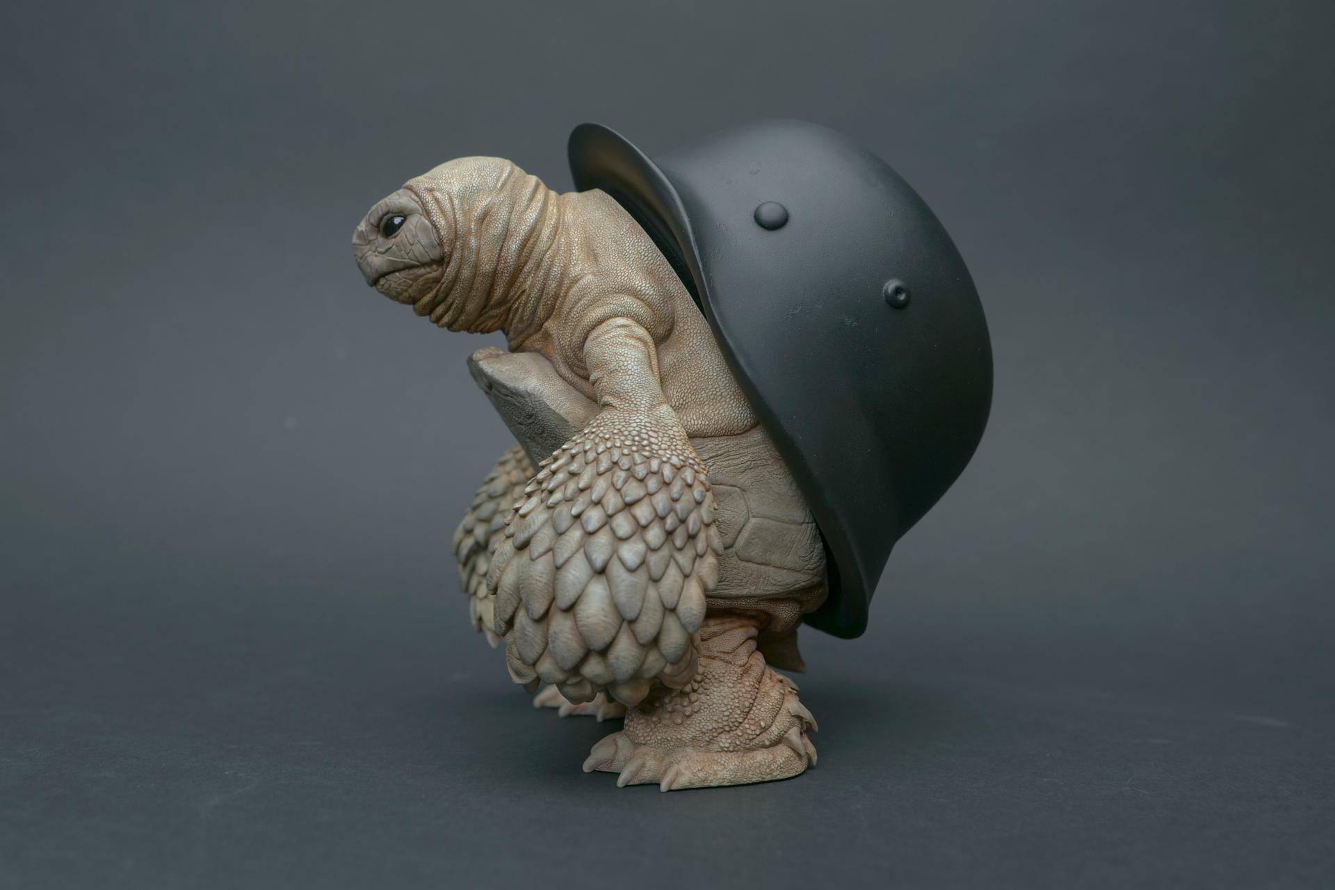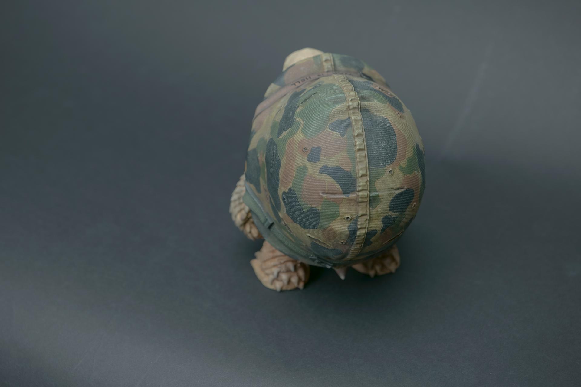 カメが身に着けているヘルメットは、物理的な保護とともに精神的安定を象徴しますが、同時に人間の恐怖や不安に対するメッセージを伝えることもあります。