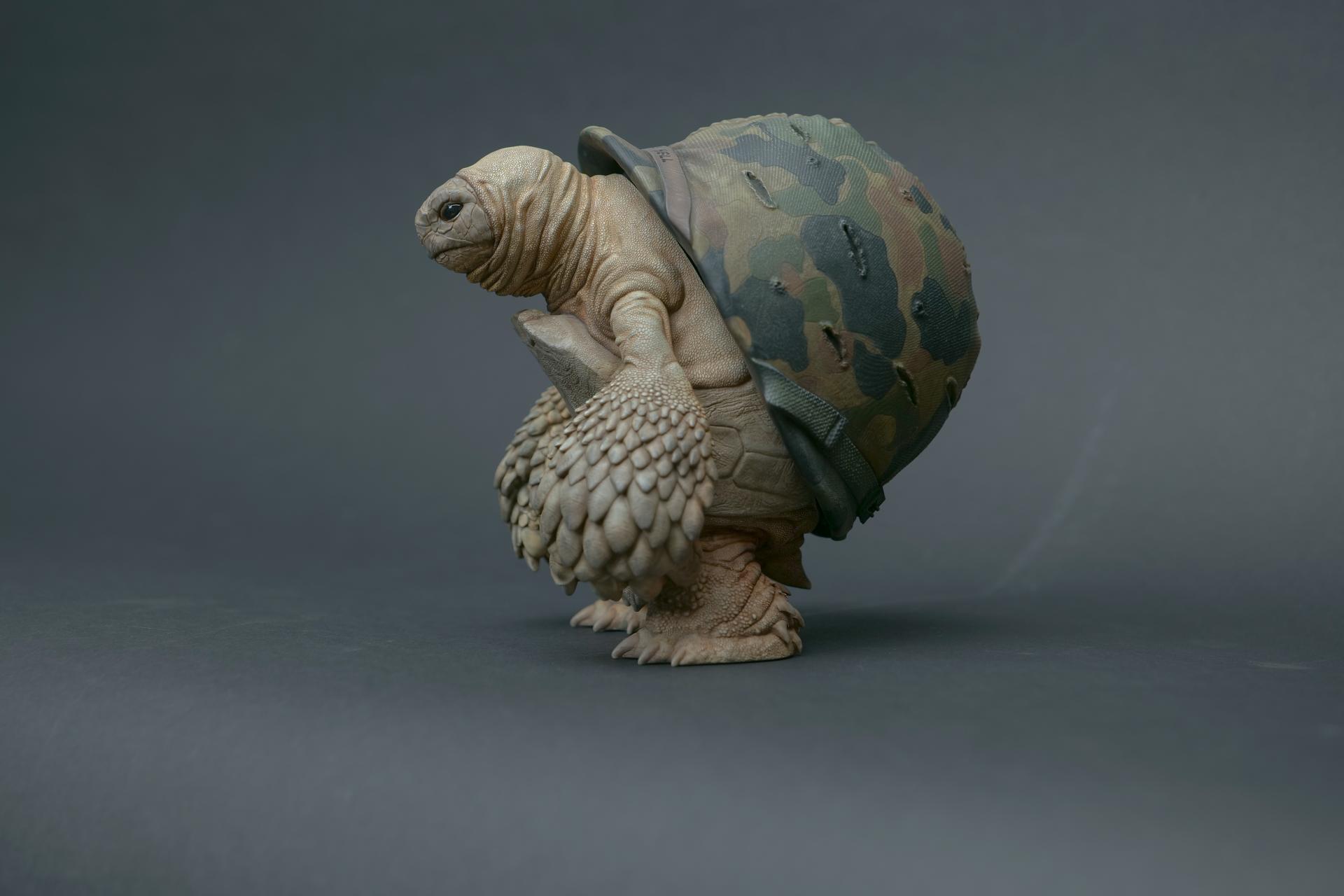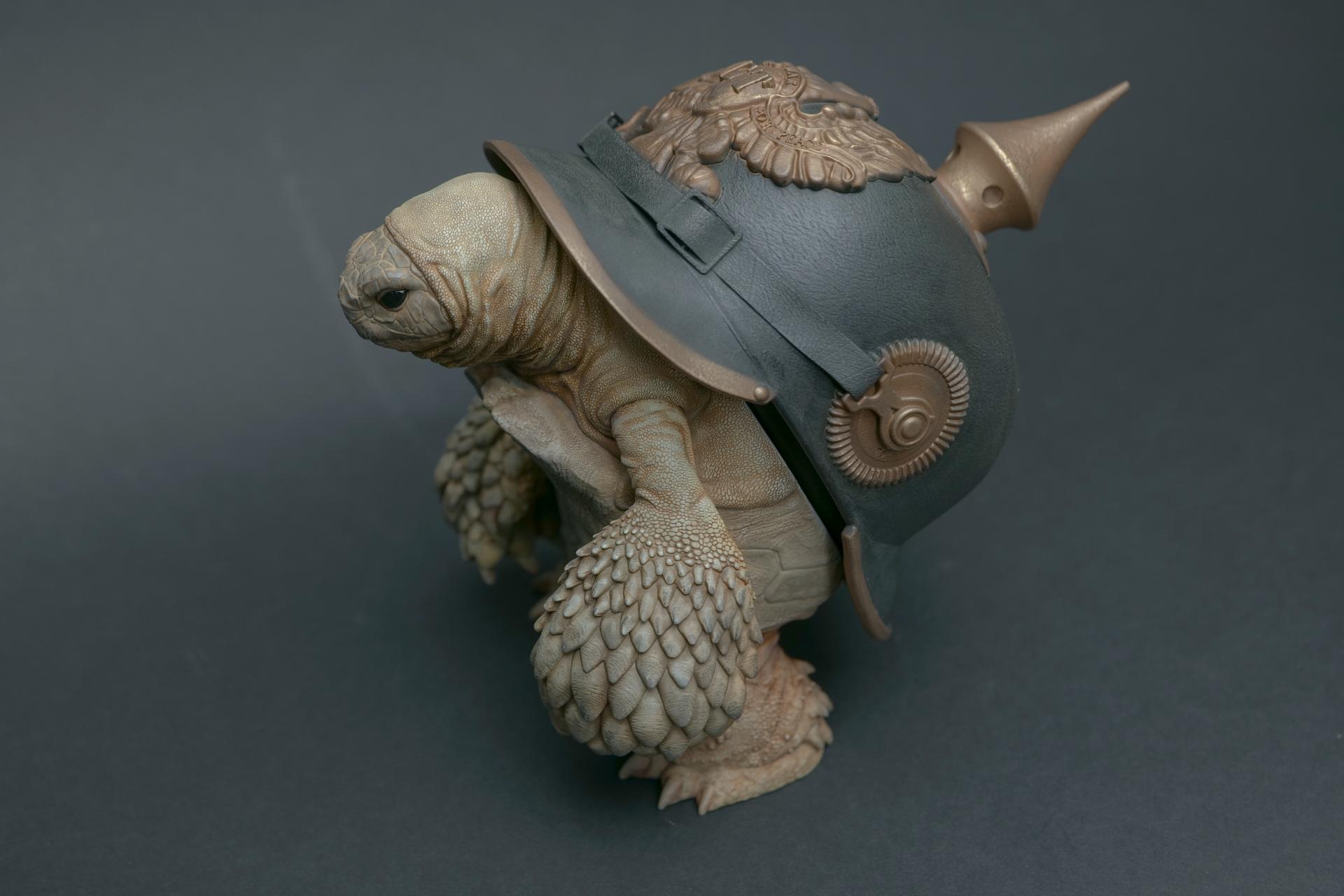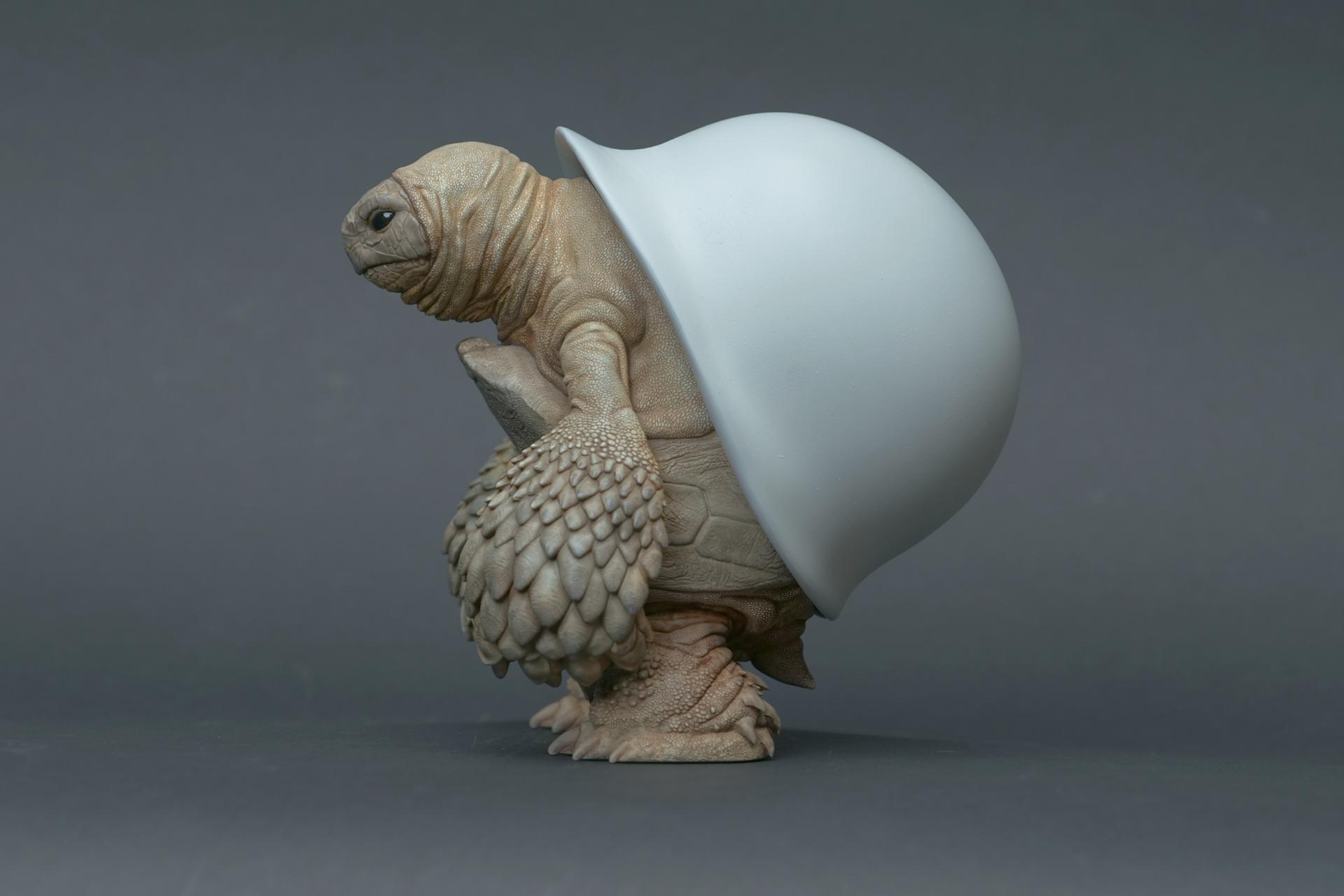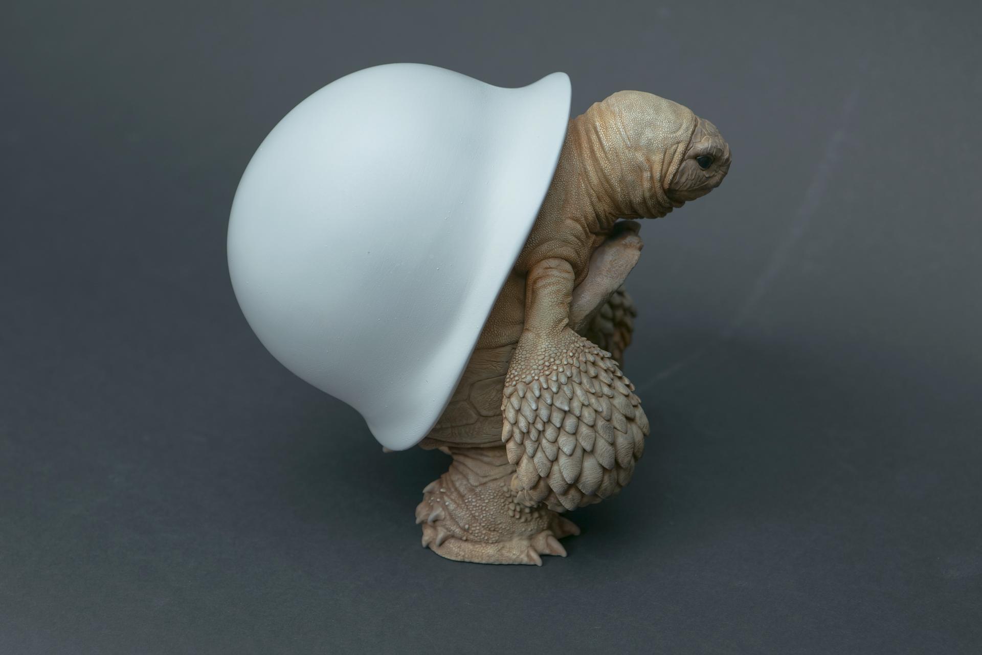 カメが身に着けているヘルメットは、物理的な保護とともに精神的安定を象徴しますが、同時に人間の恐怖や不安に対するメッセージを伝えることもあります。