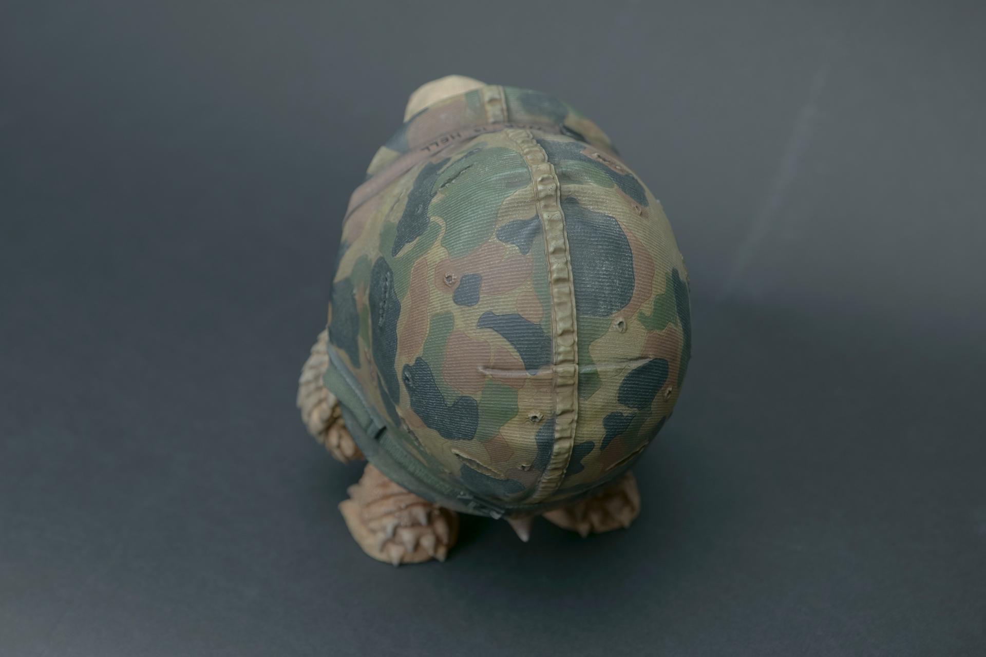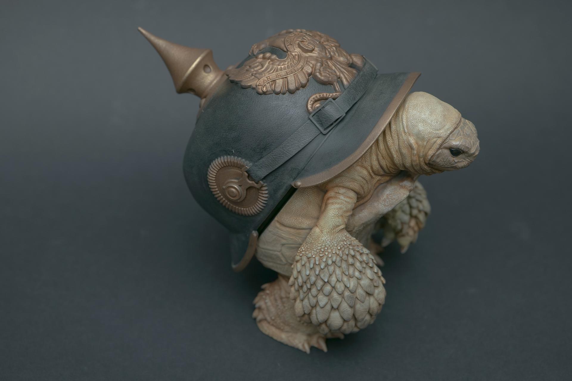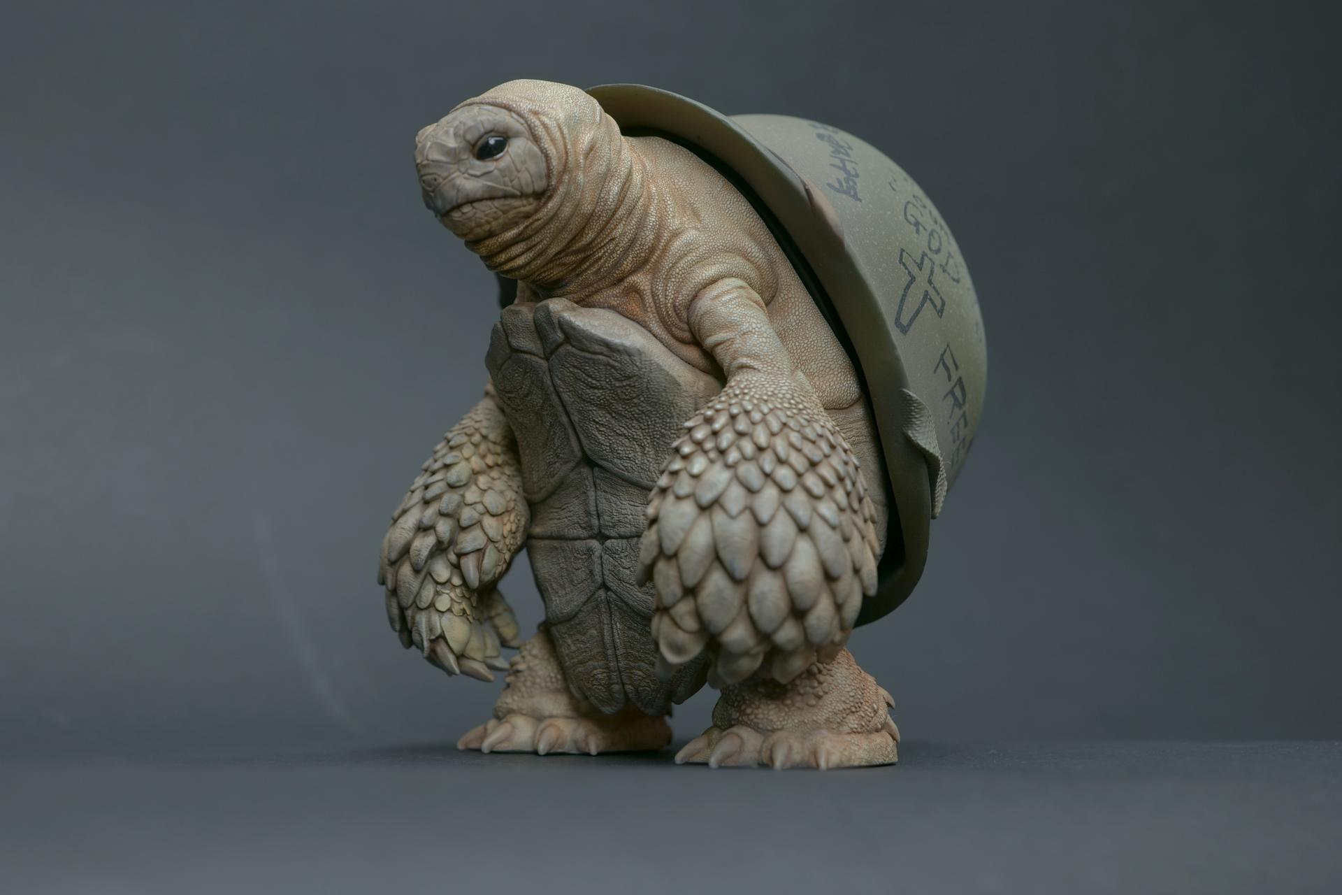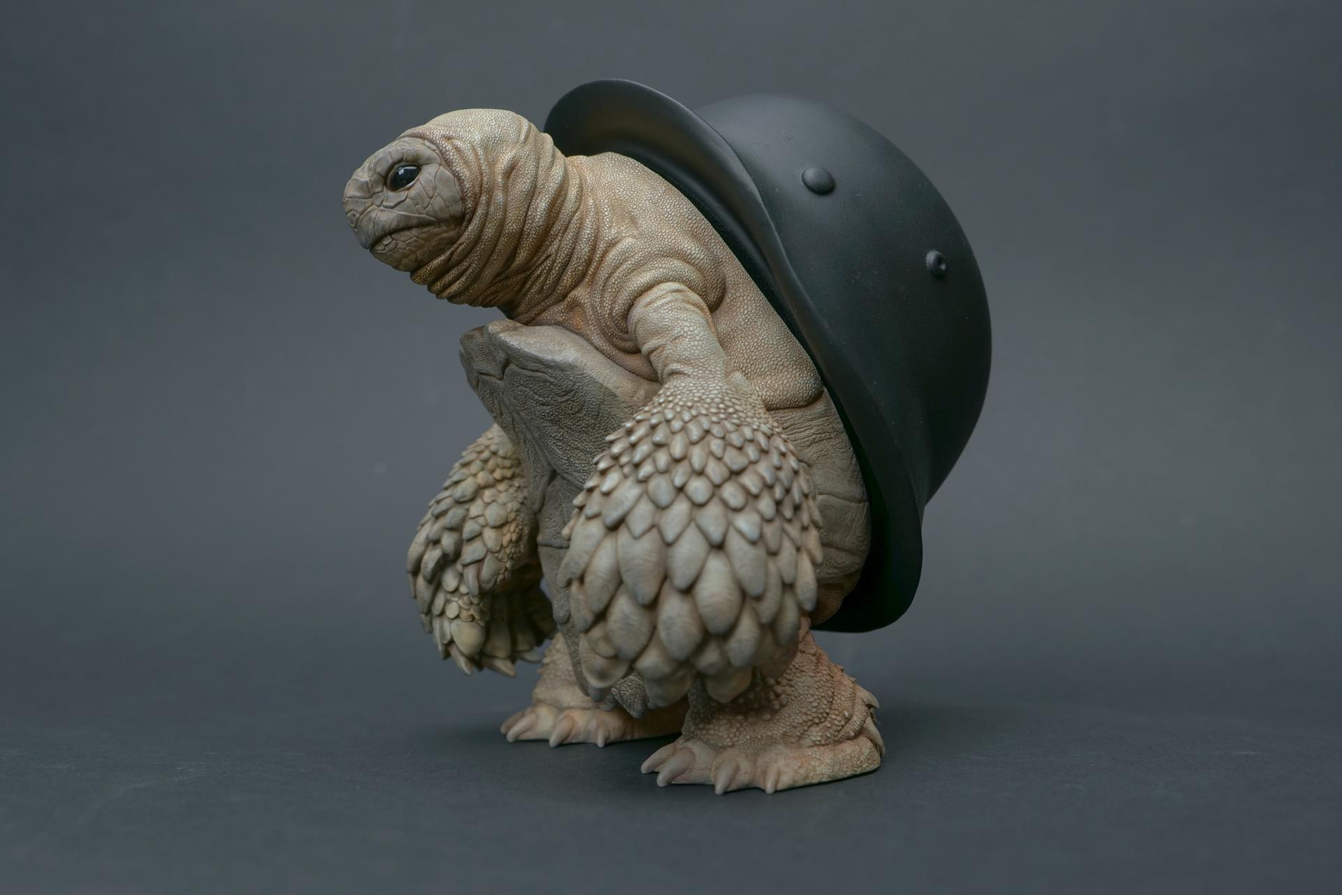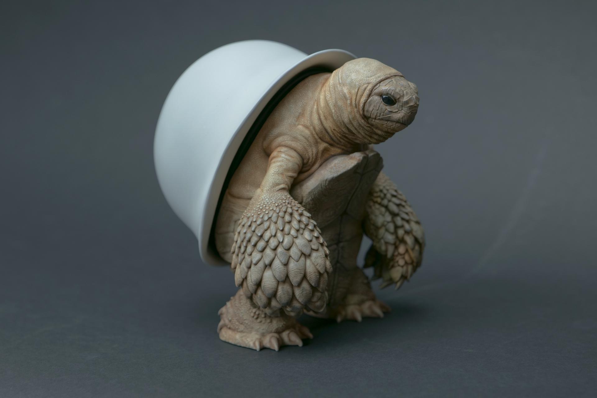 カメが身に着けているヘルメットは、物理的な保護とともに精神的安定を象徴しますが、同時に人間の恐怖や不安に対するメッセージを伝えることもあります。