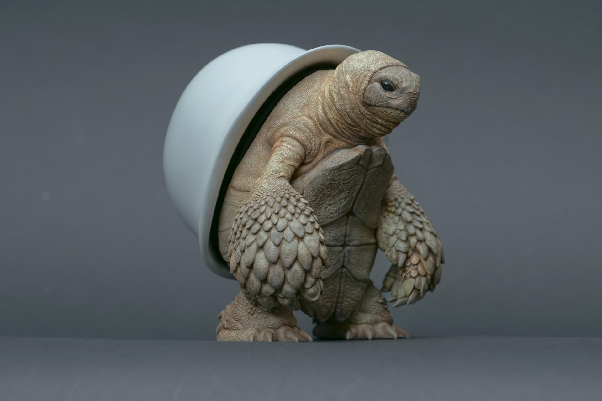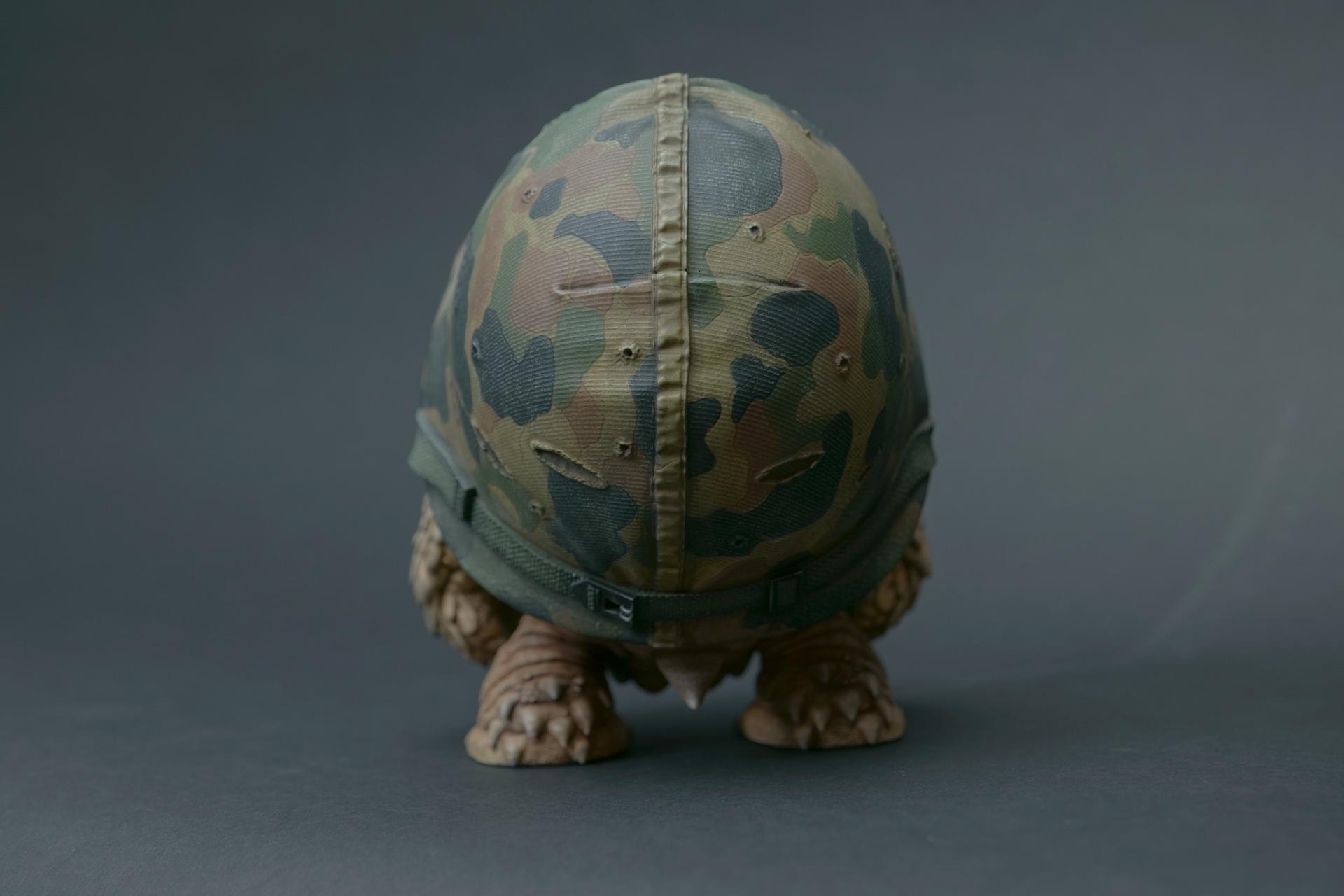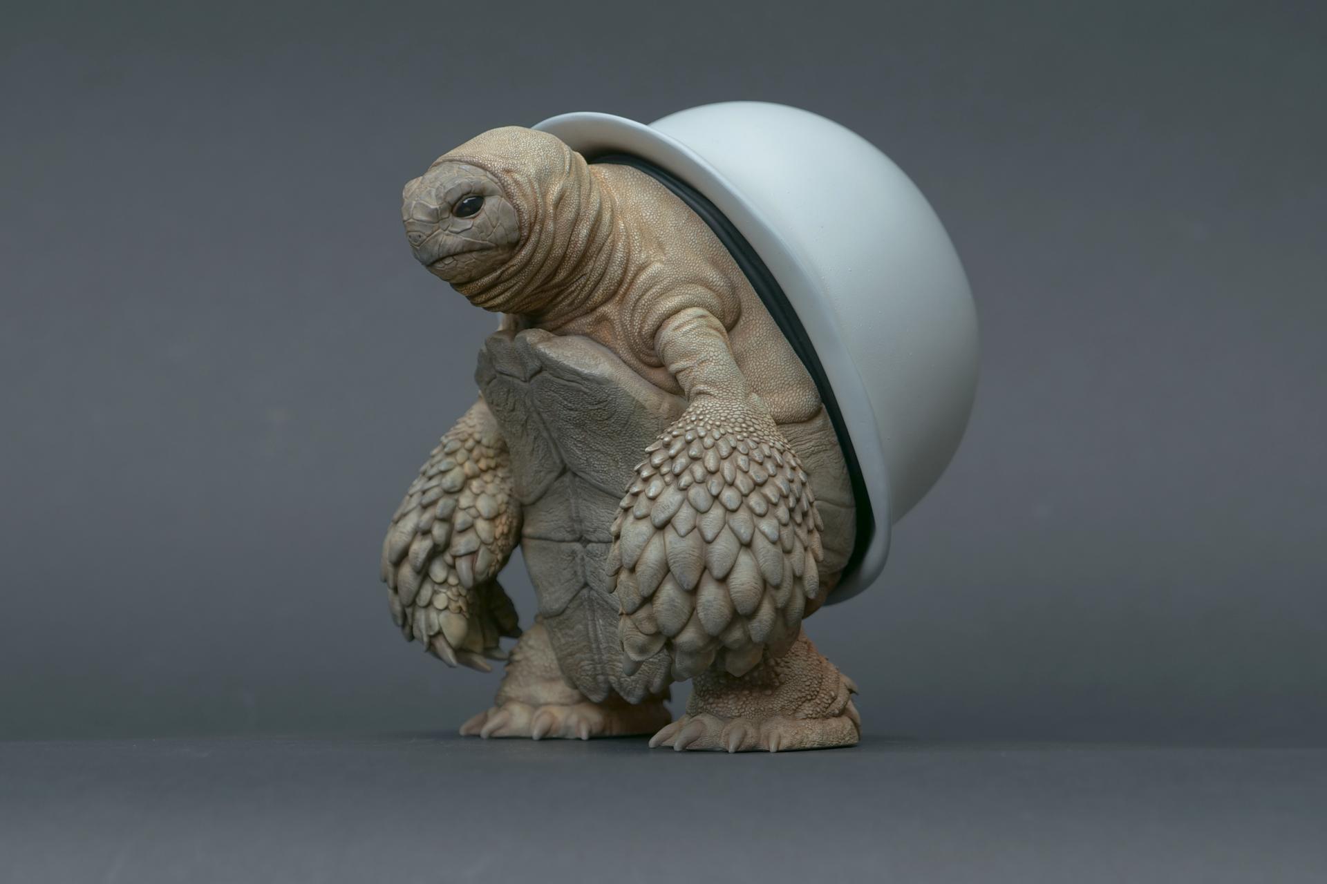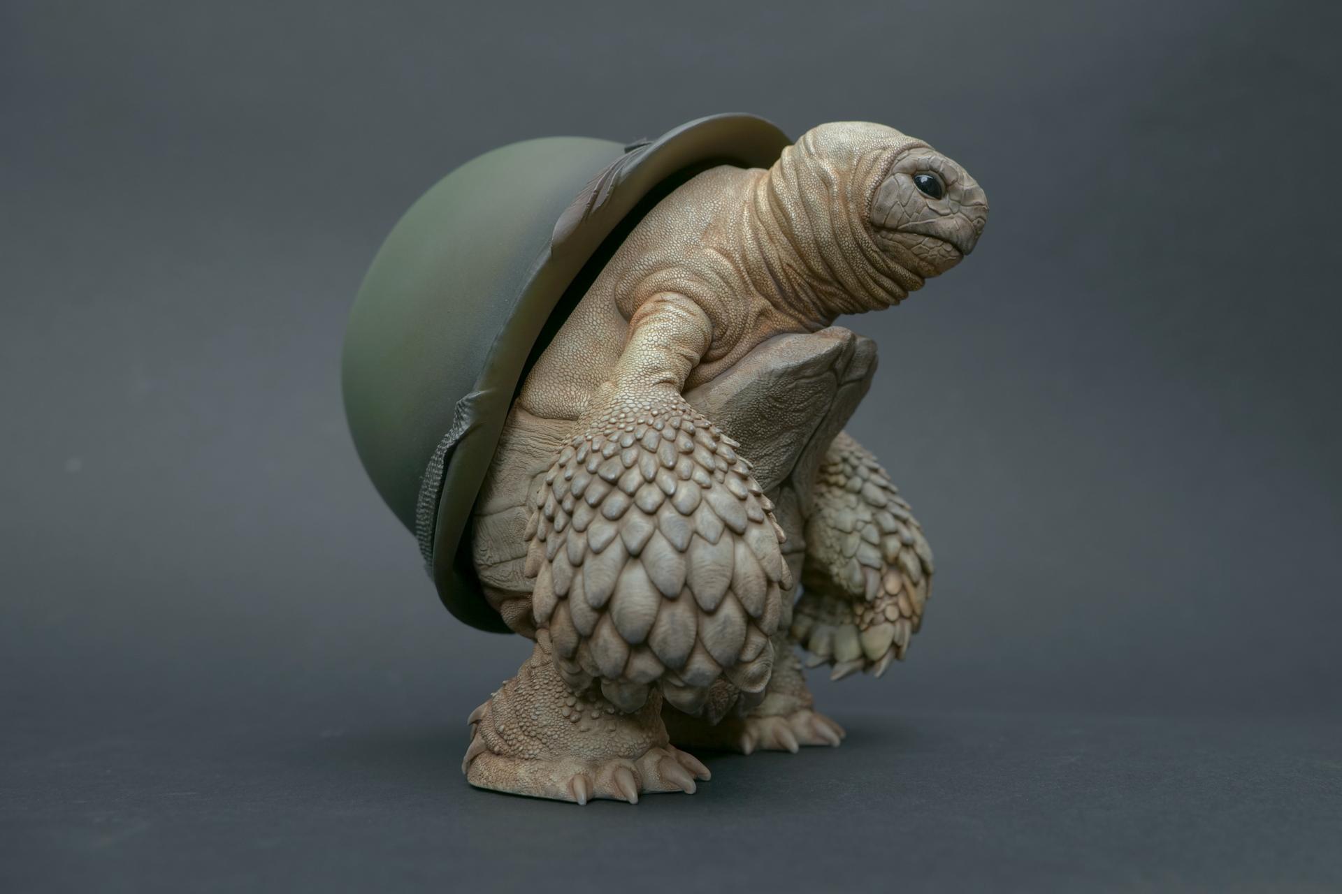 カメが身に着けているヘルメットは、物理的な保護とともに精神的安定を象徴しますが、同時に人間の恐怖や不安に対するメッセージを伝えることもあります。