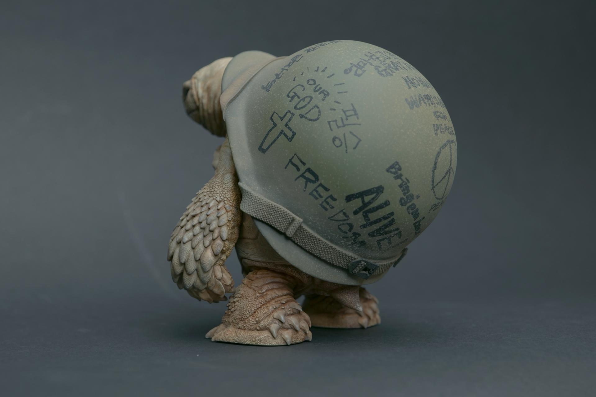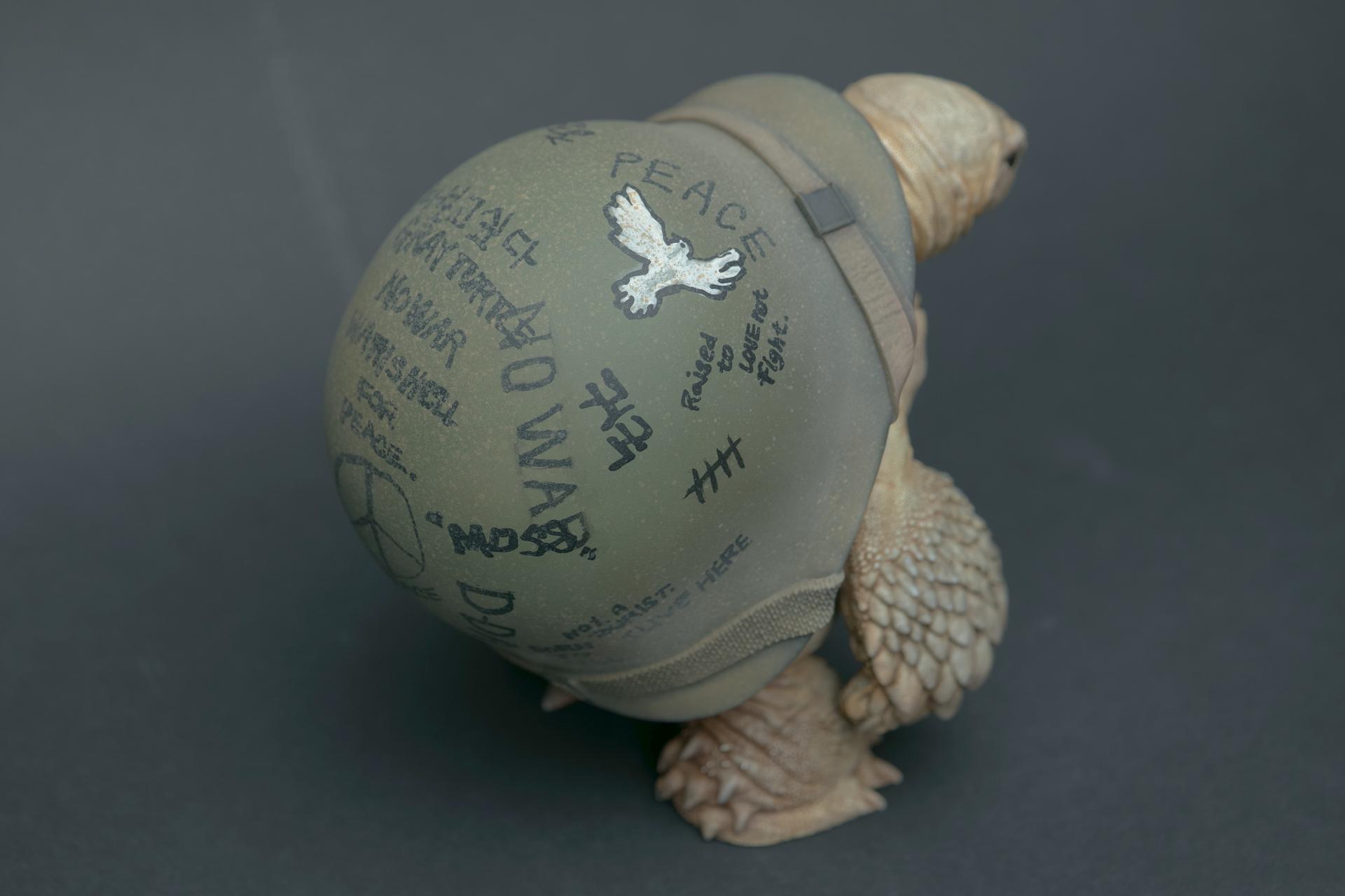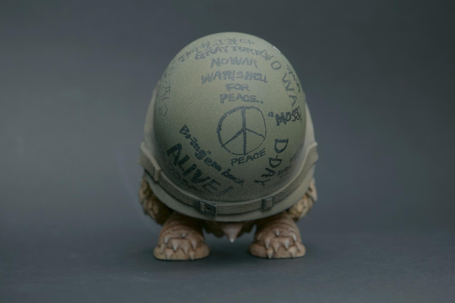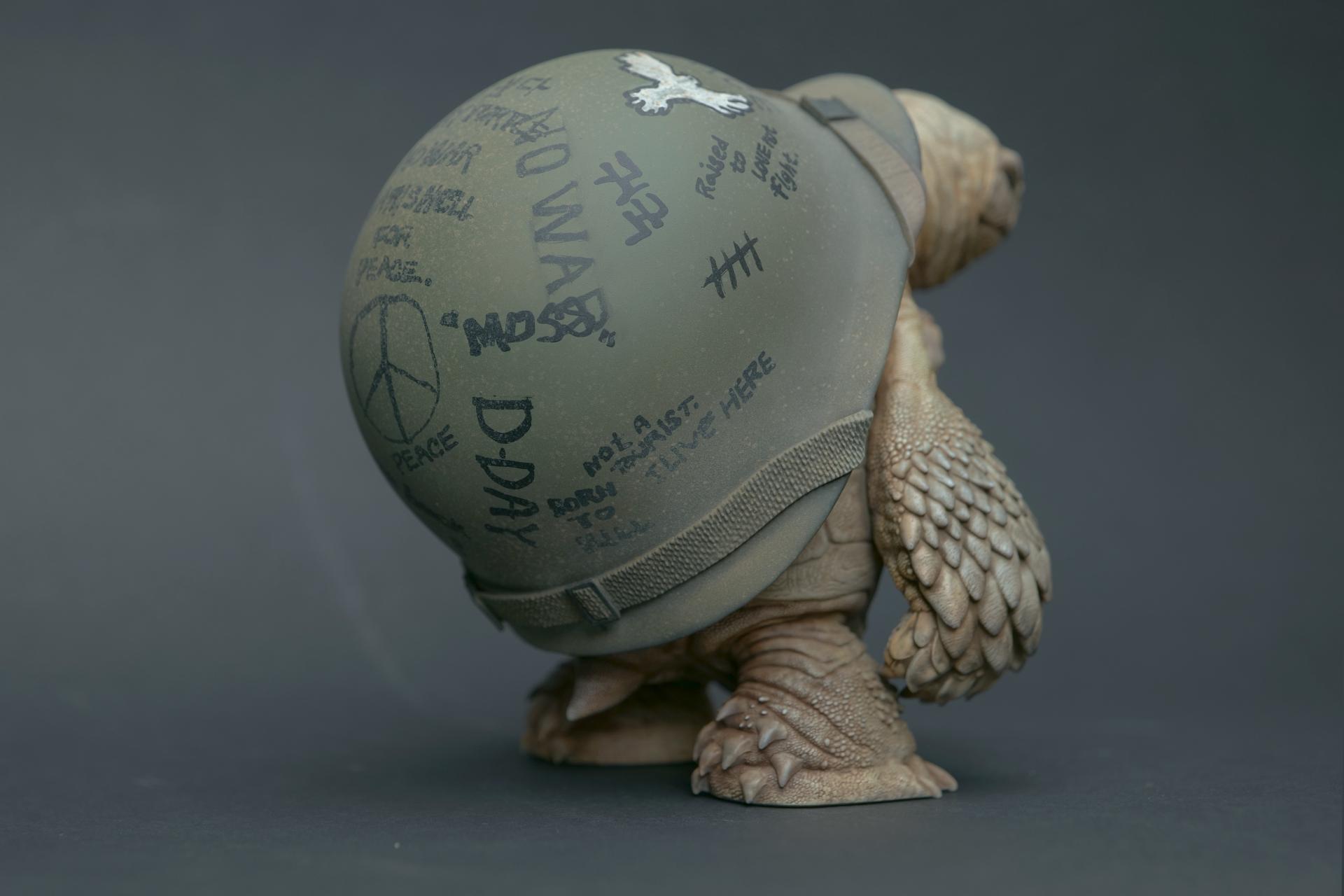 The helmets worn by the turtles symbolize not only physical protection but also convey a message of human fear and anxiety.