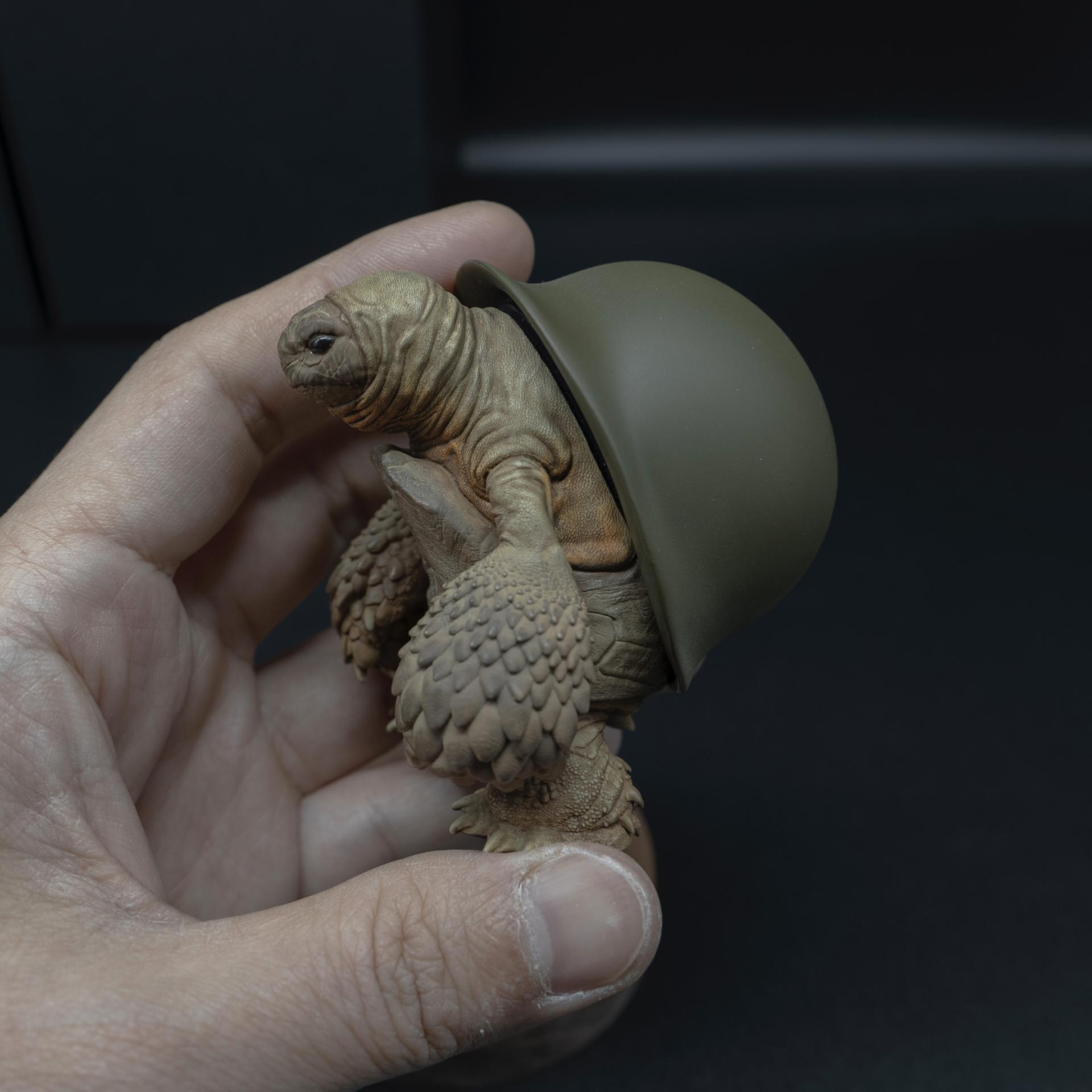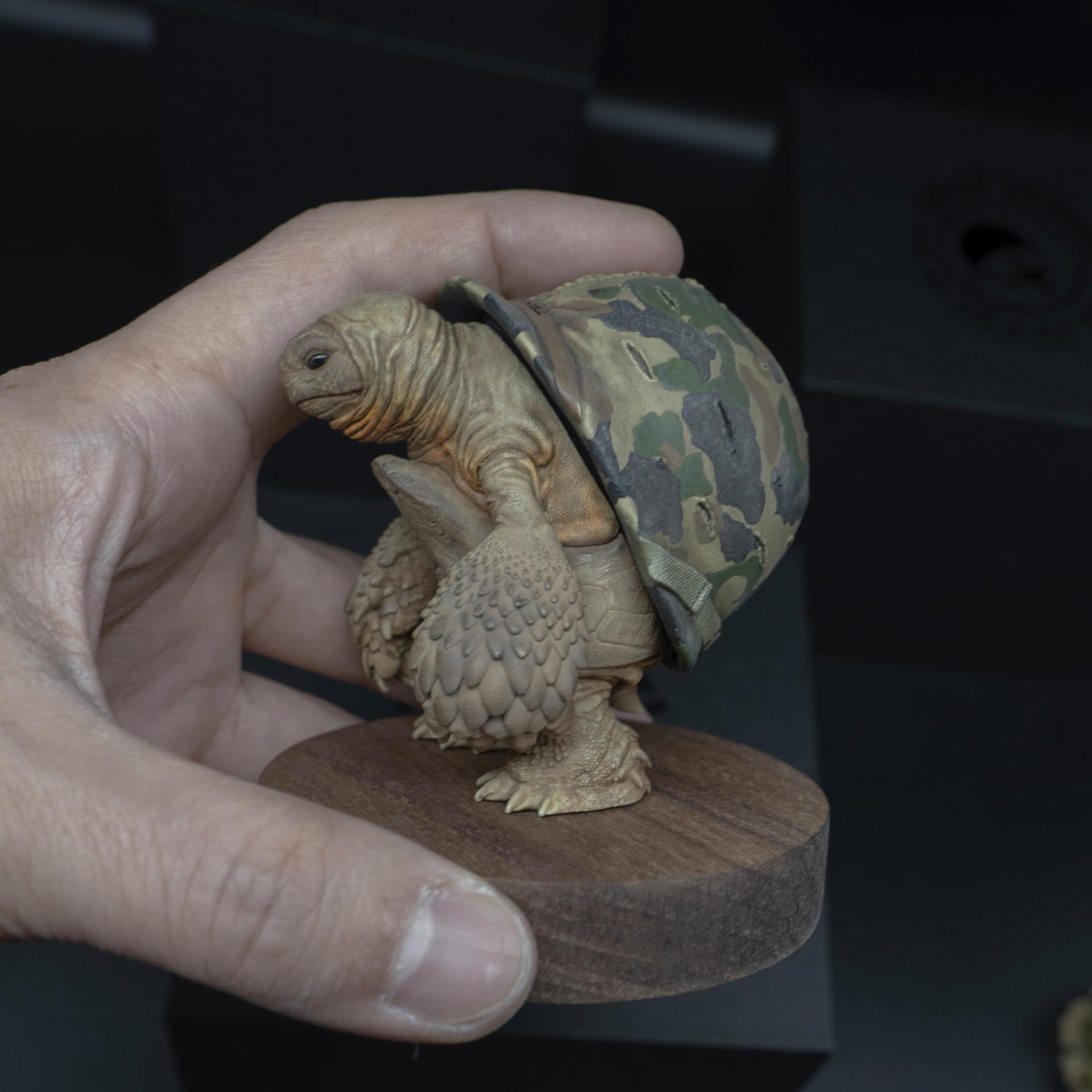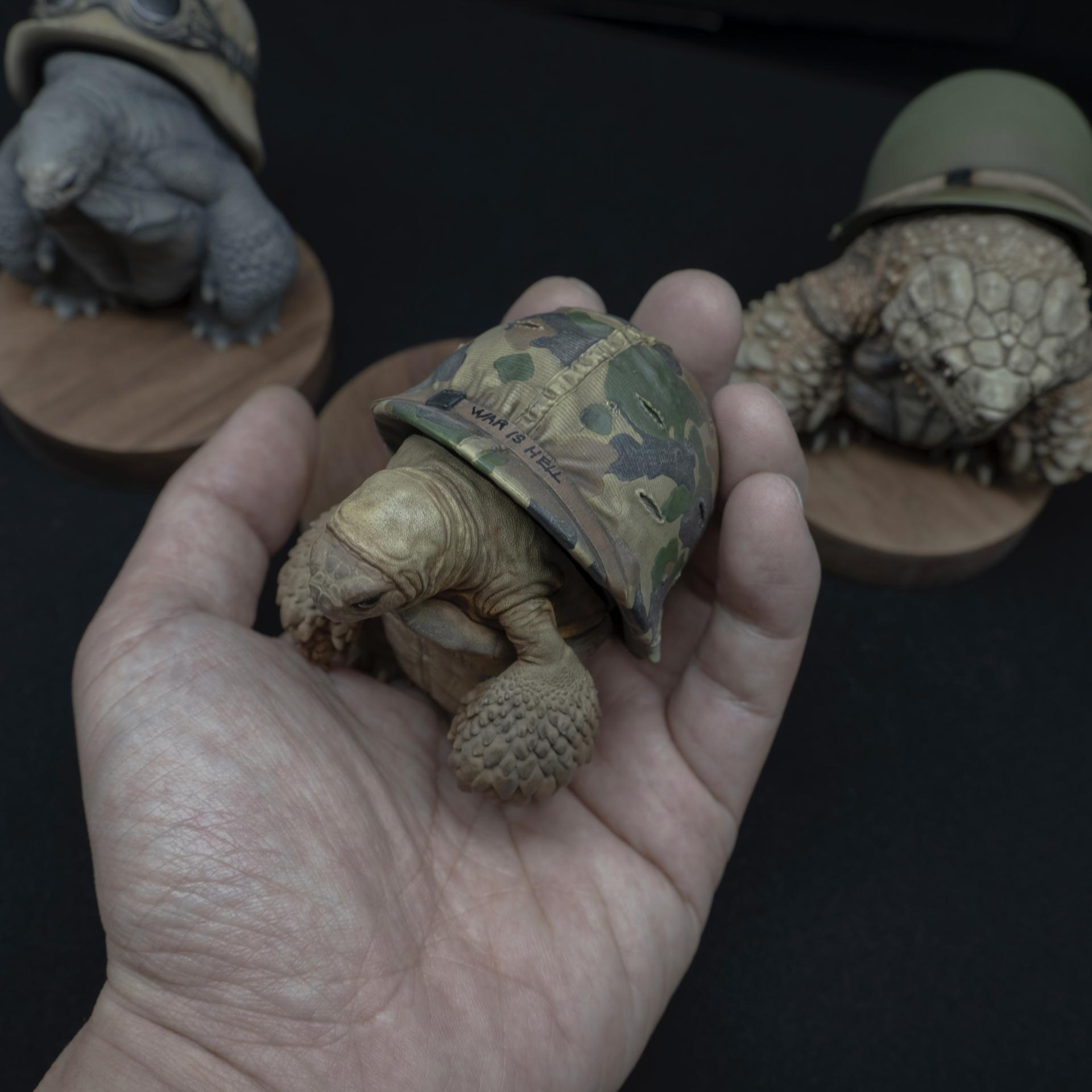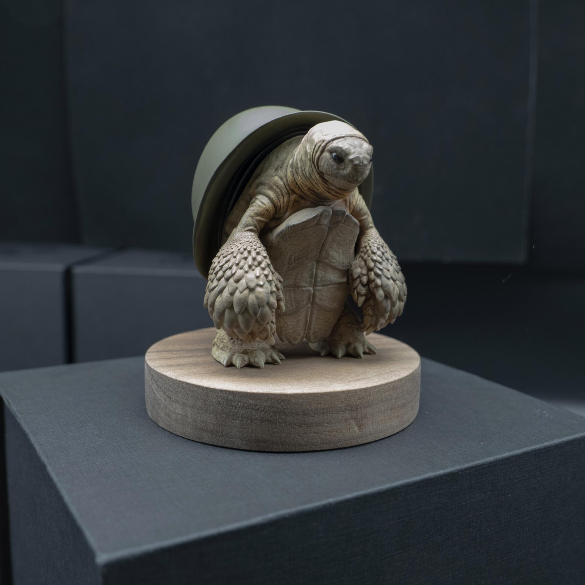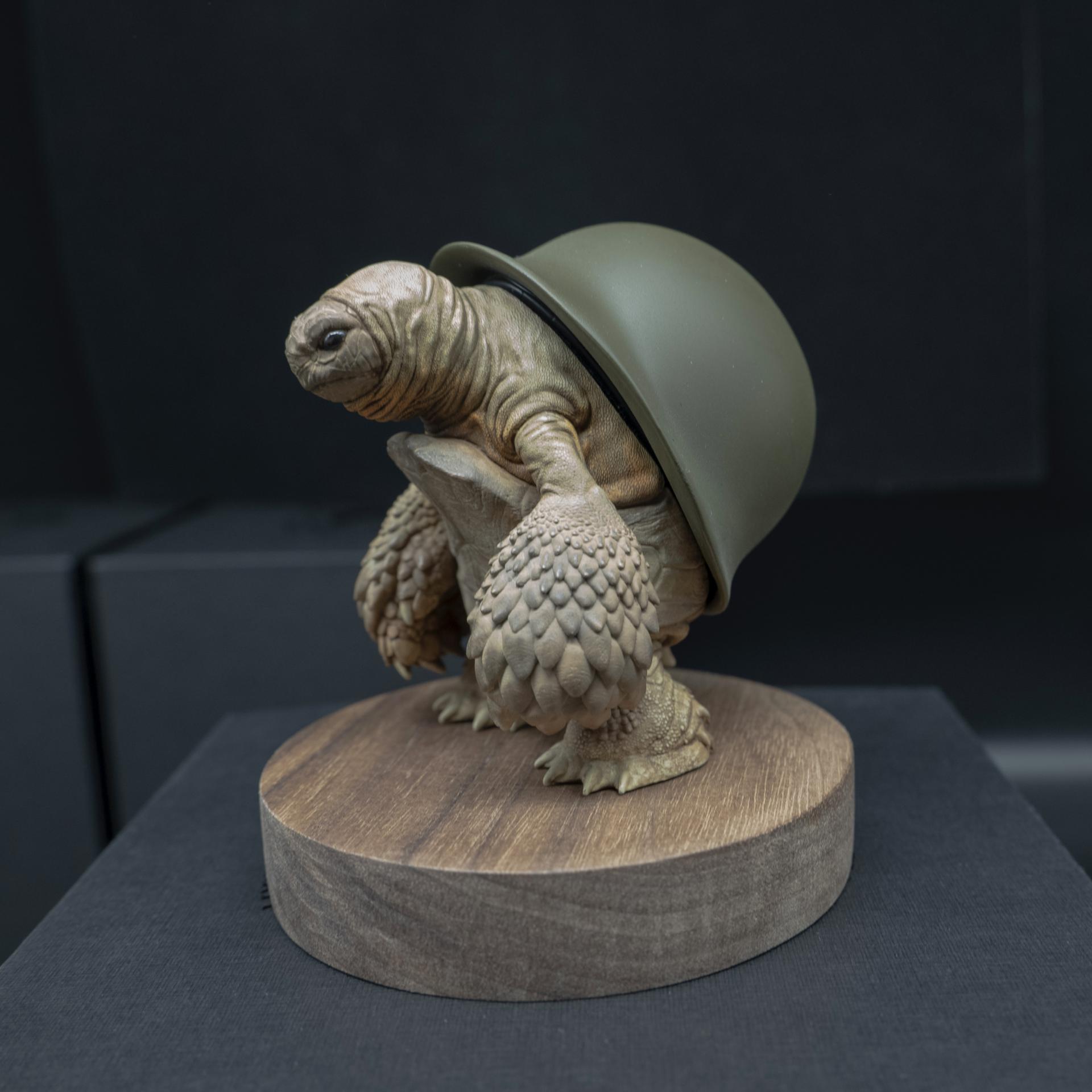 海龟佩戴的头盔象征着精神稳定和身体保护,但它们也传达了关于人类恐惧和焦虑的信息。