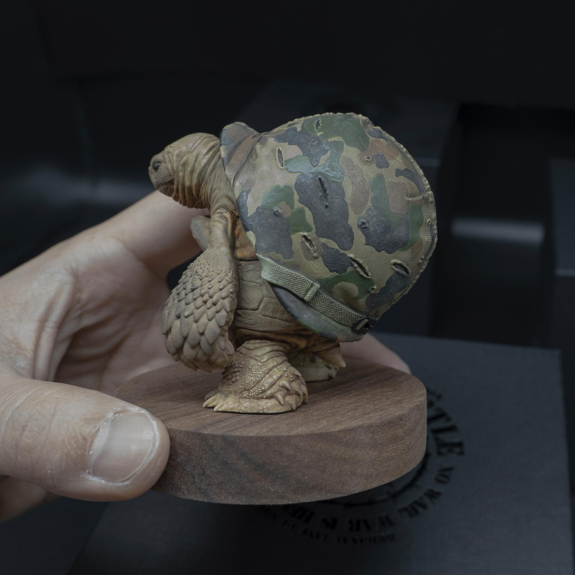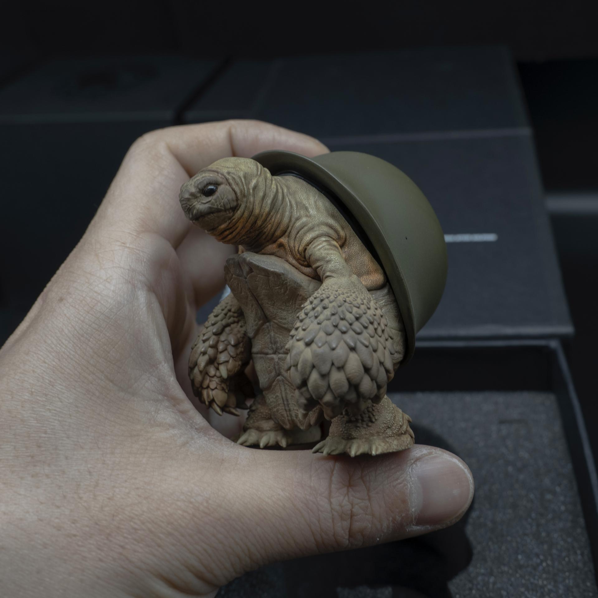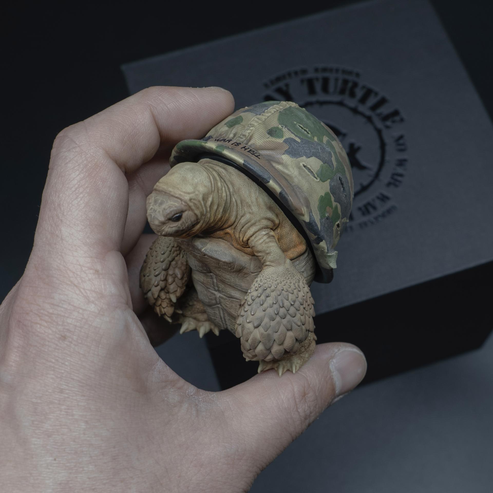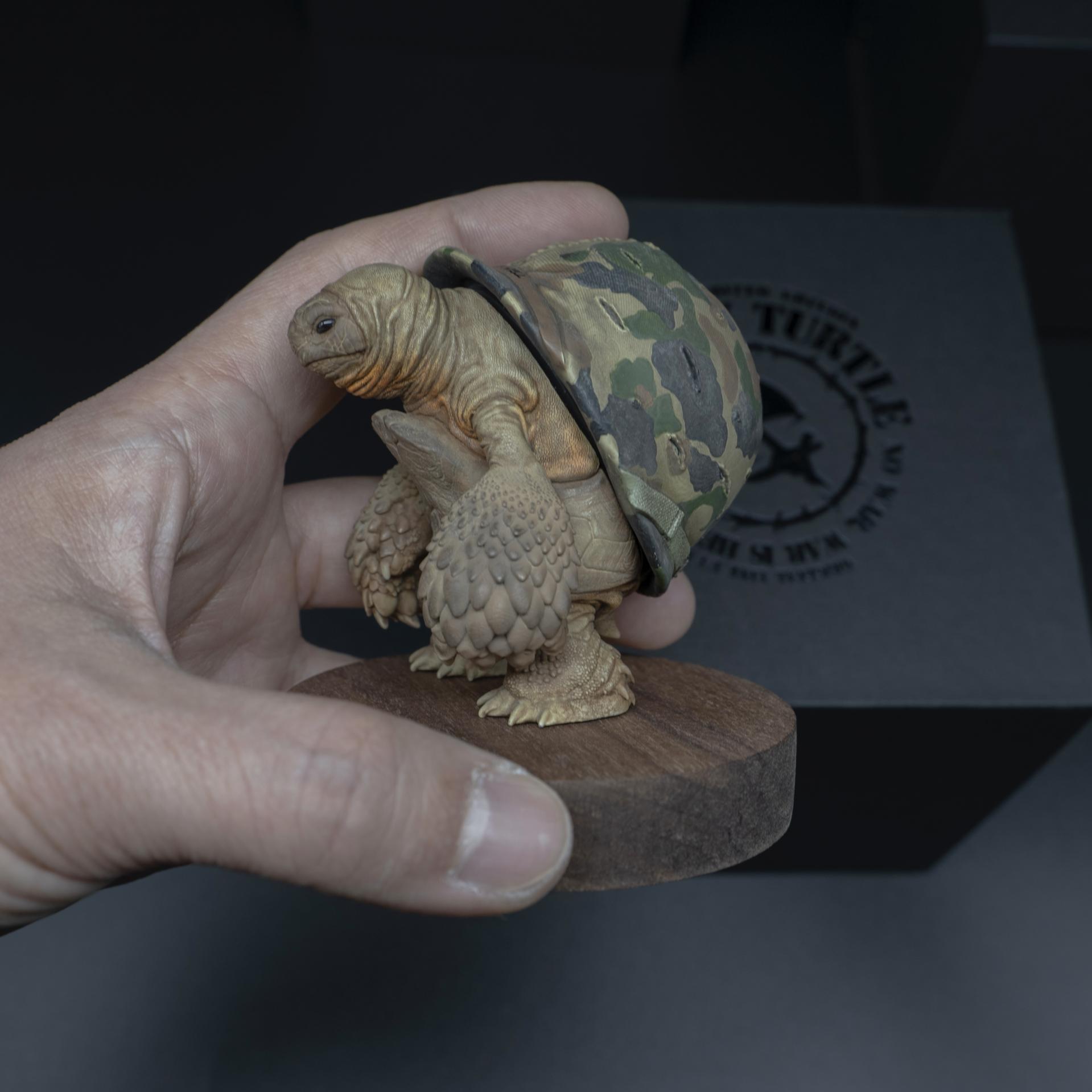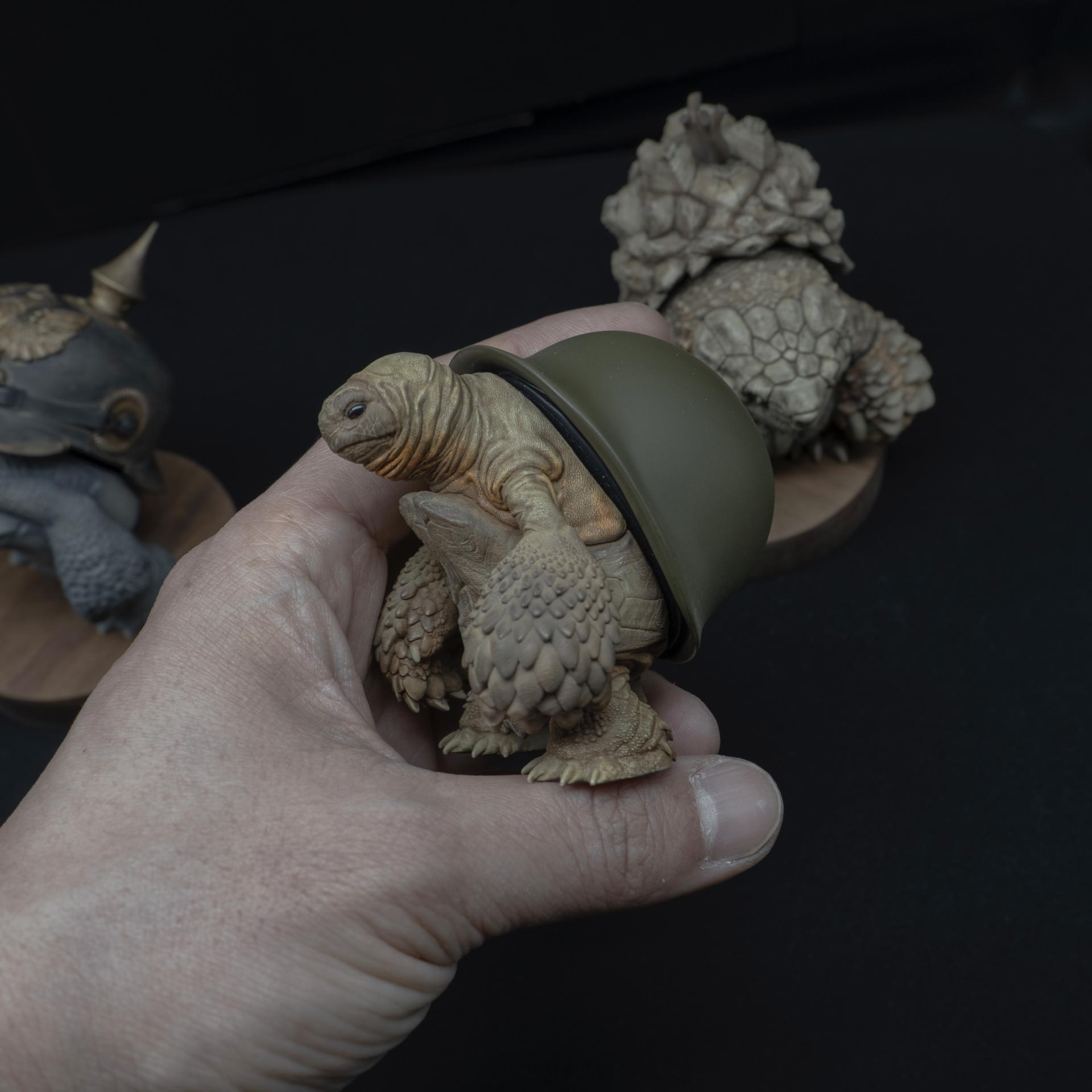 海龟佩戴的头盔象征着精神稳定和身体保护,但它们也传达了关于人类恐惧和焦虑的信息。