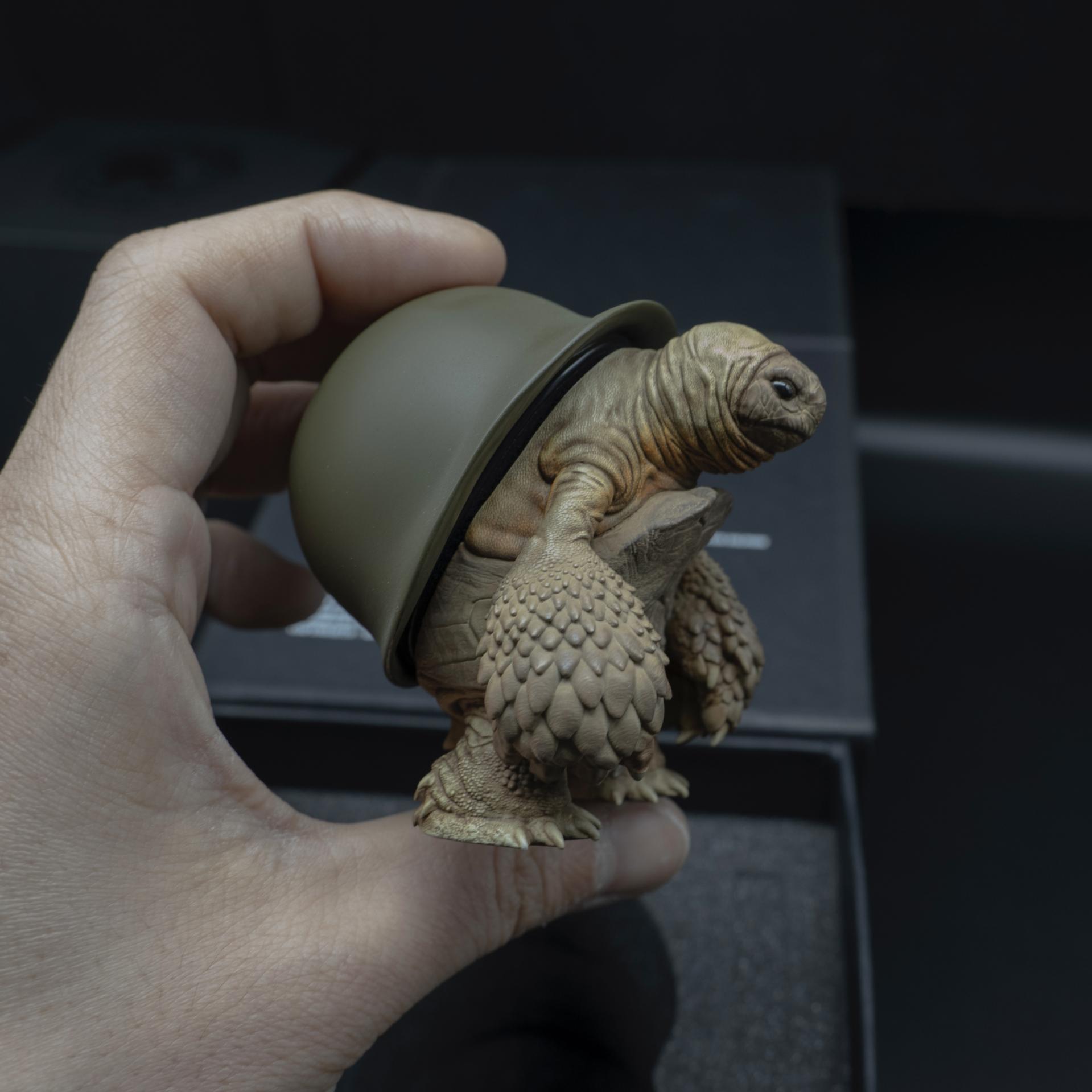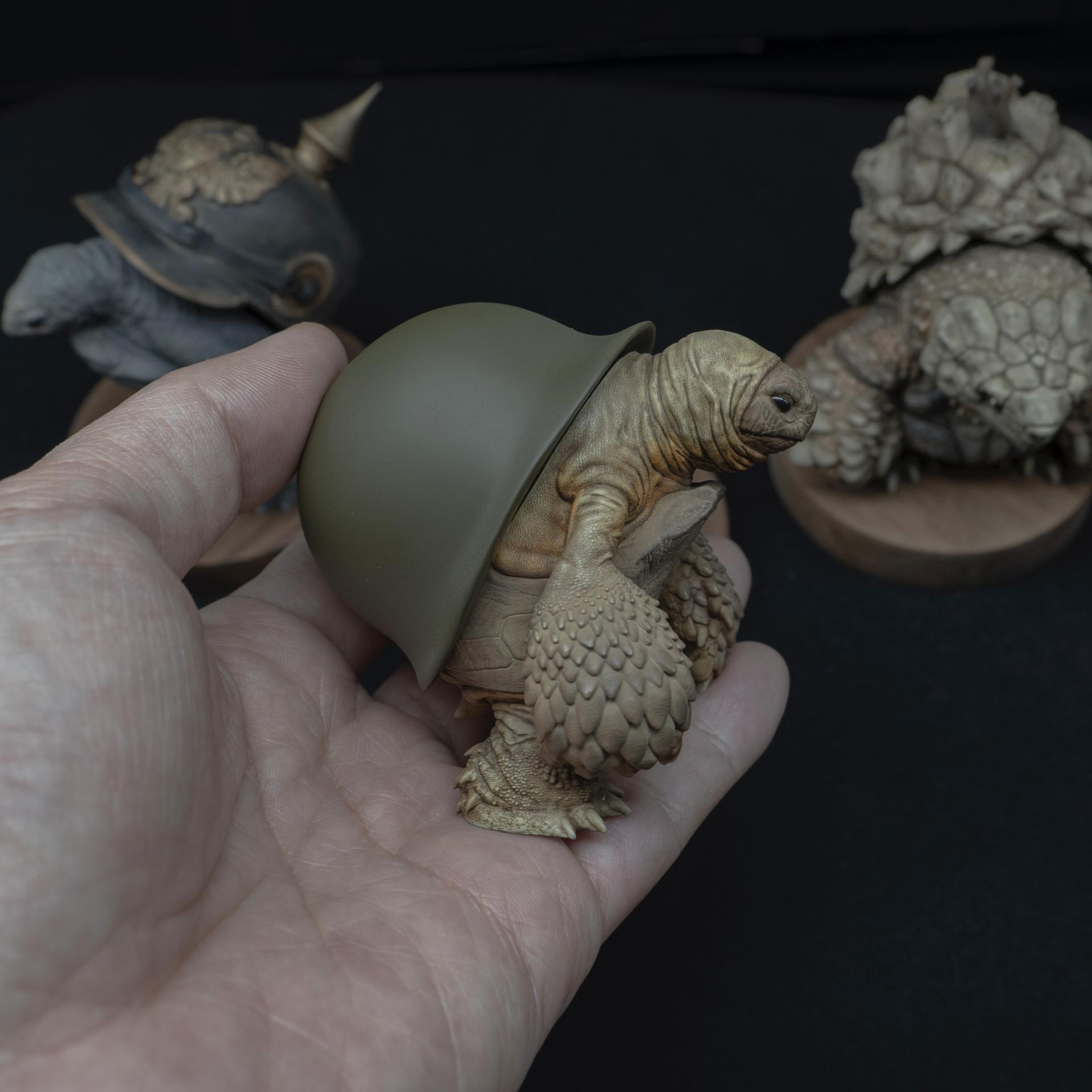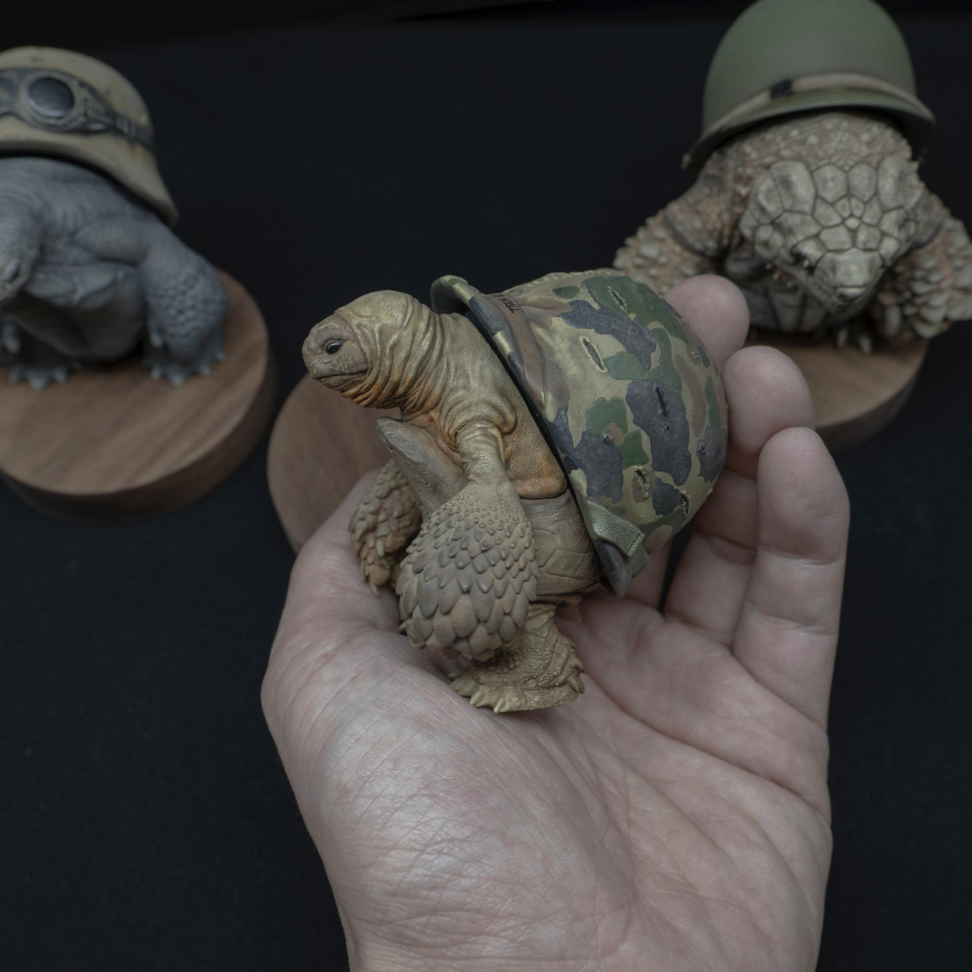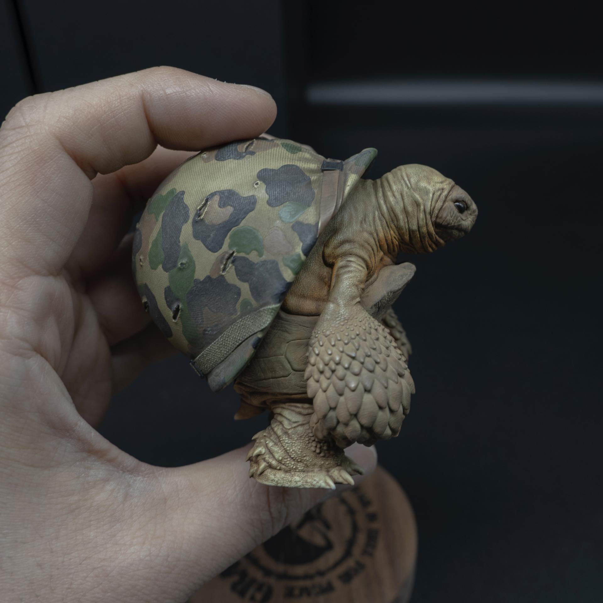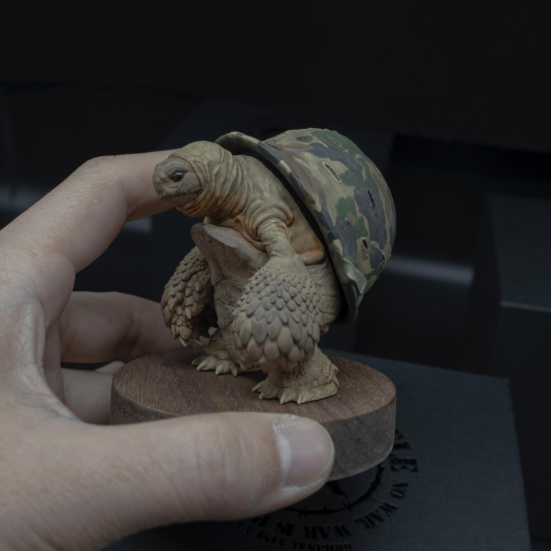 海龟佩戴的头盔象征着精神稳定和身体保护,但它们也传达了关于人类恐惧和焦虑的信息。