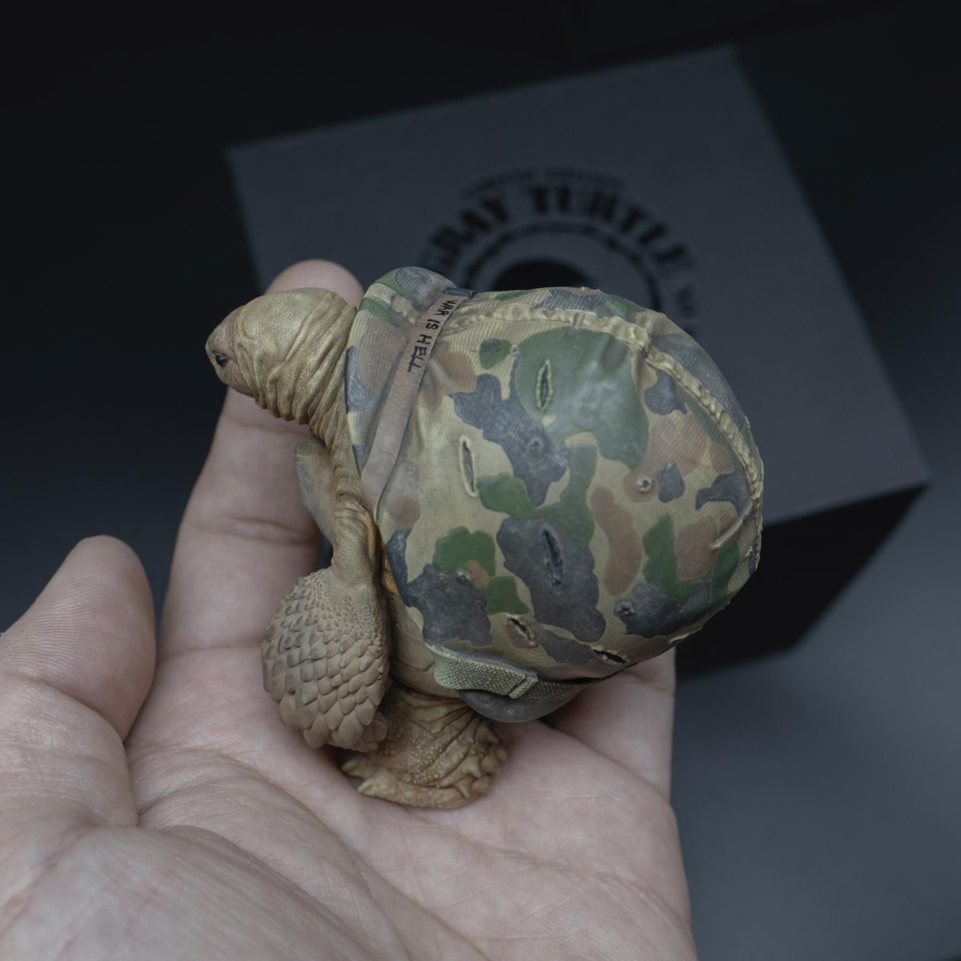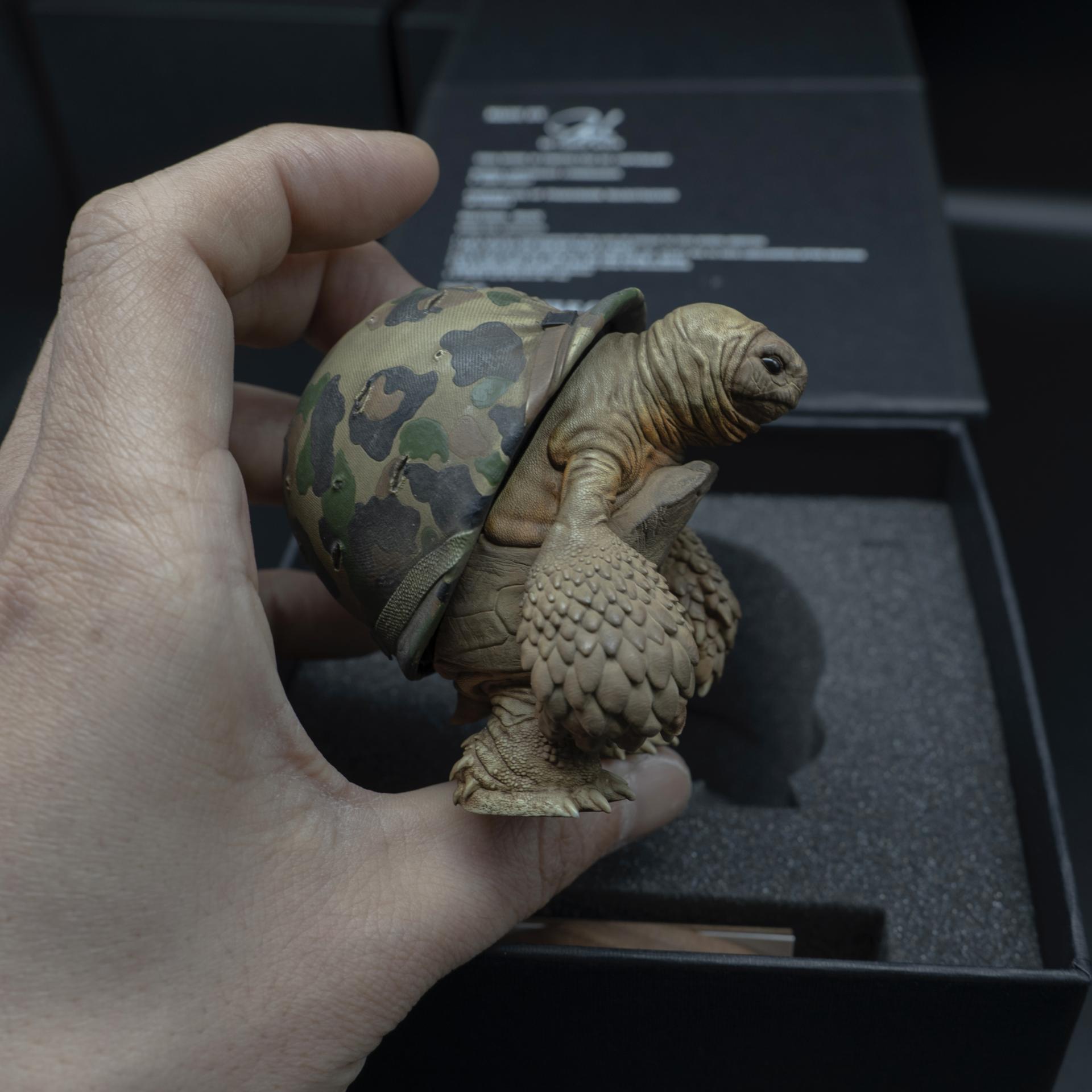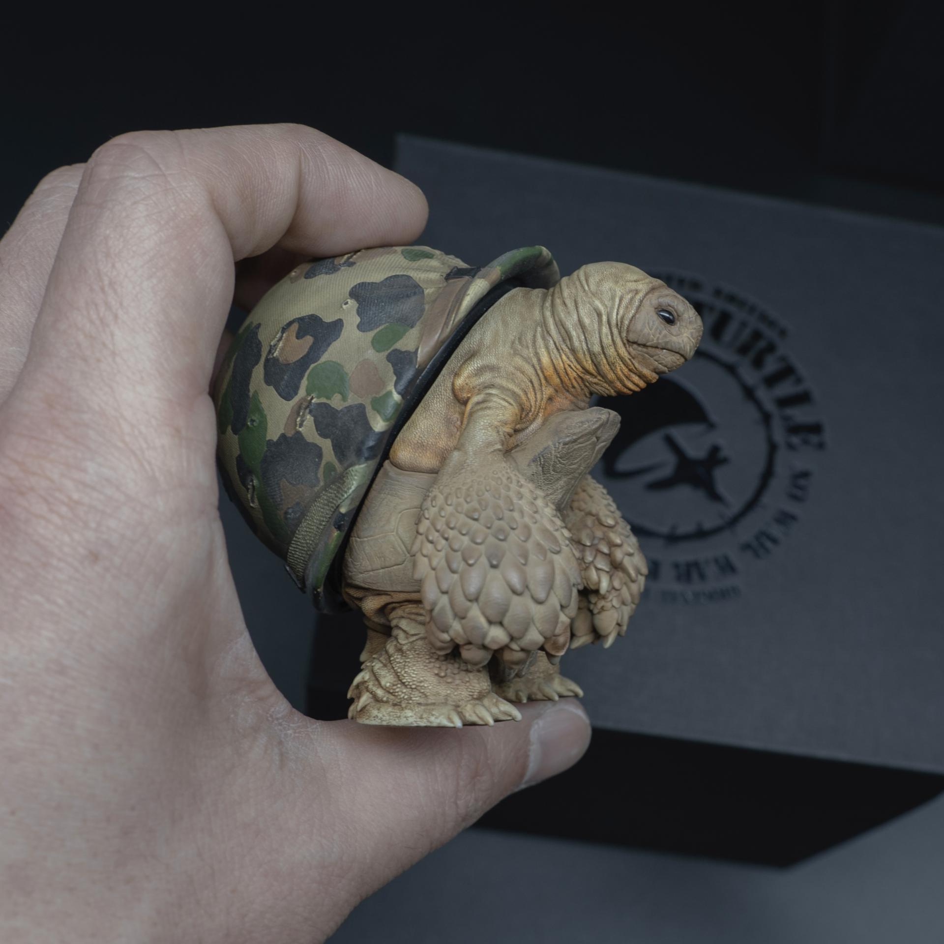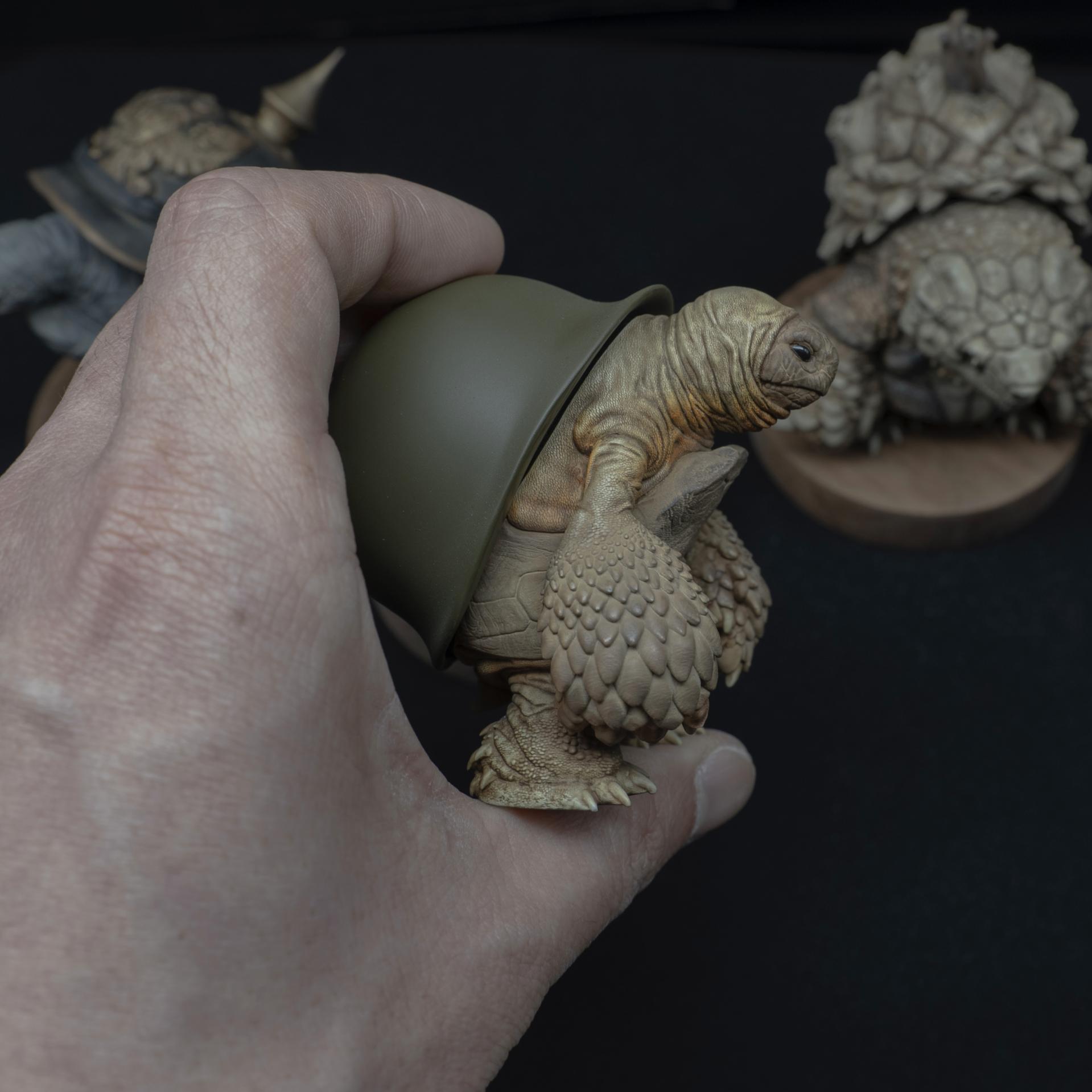 海龟佩戴的头盔象征着精神稳定和身体保护,但它们也传达了关于人类恐惧和焦虑的信息。