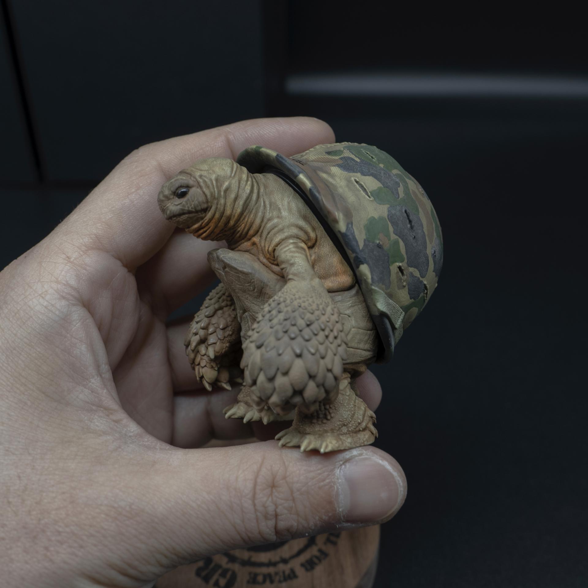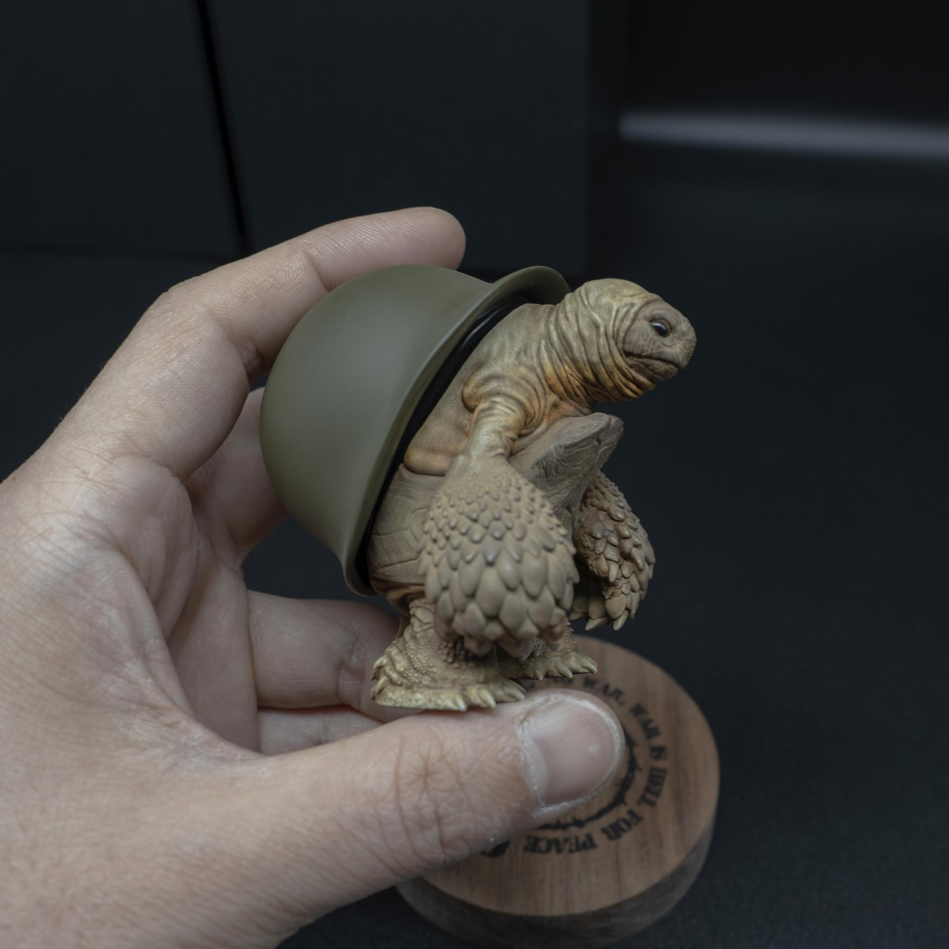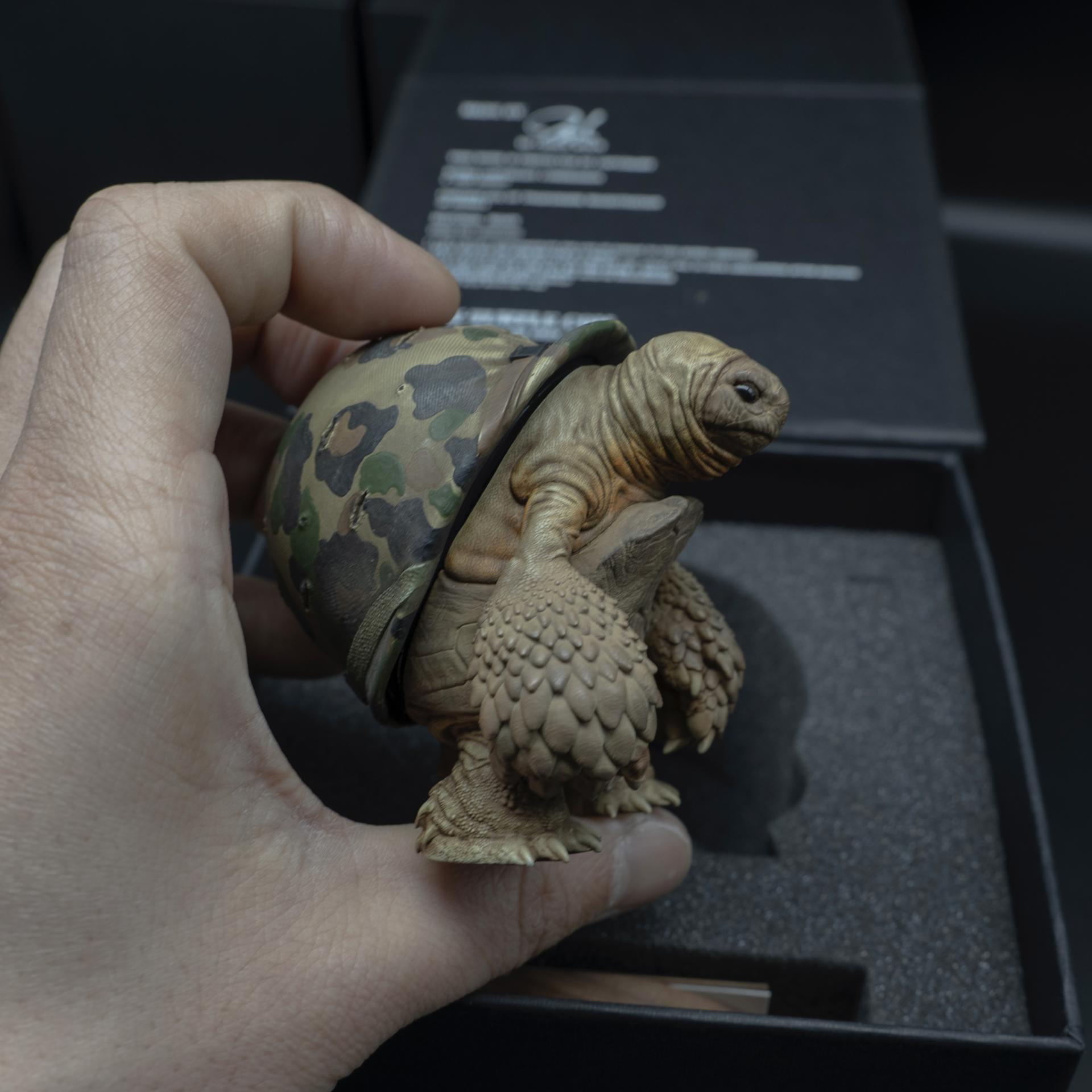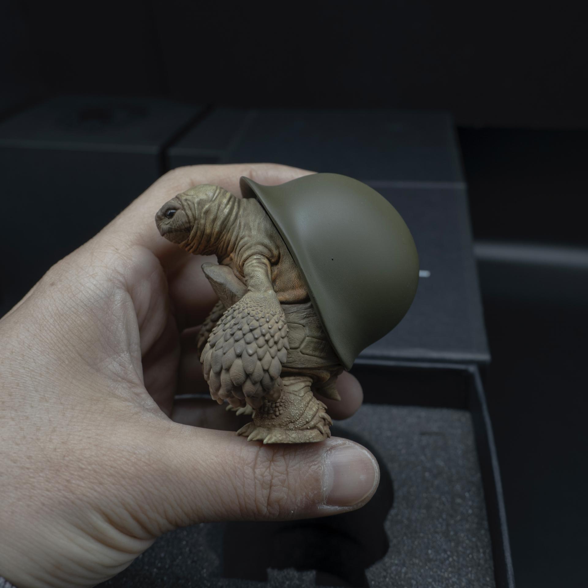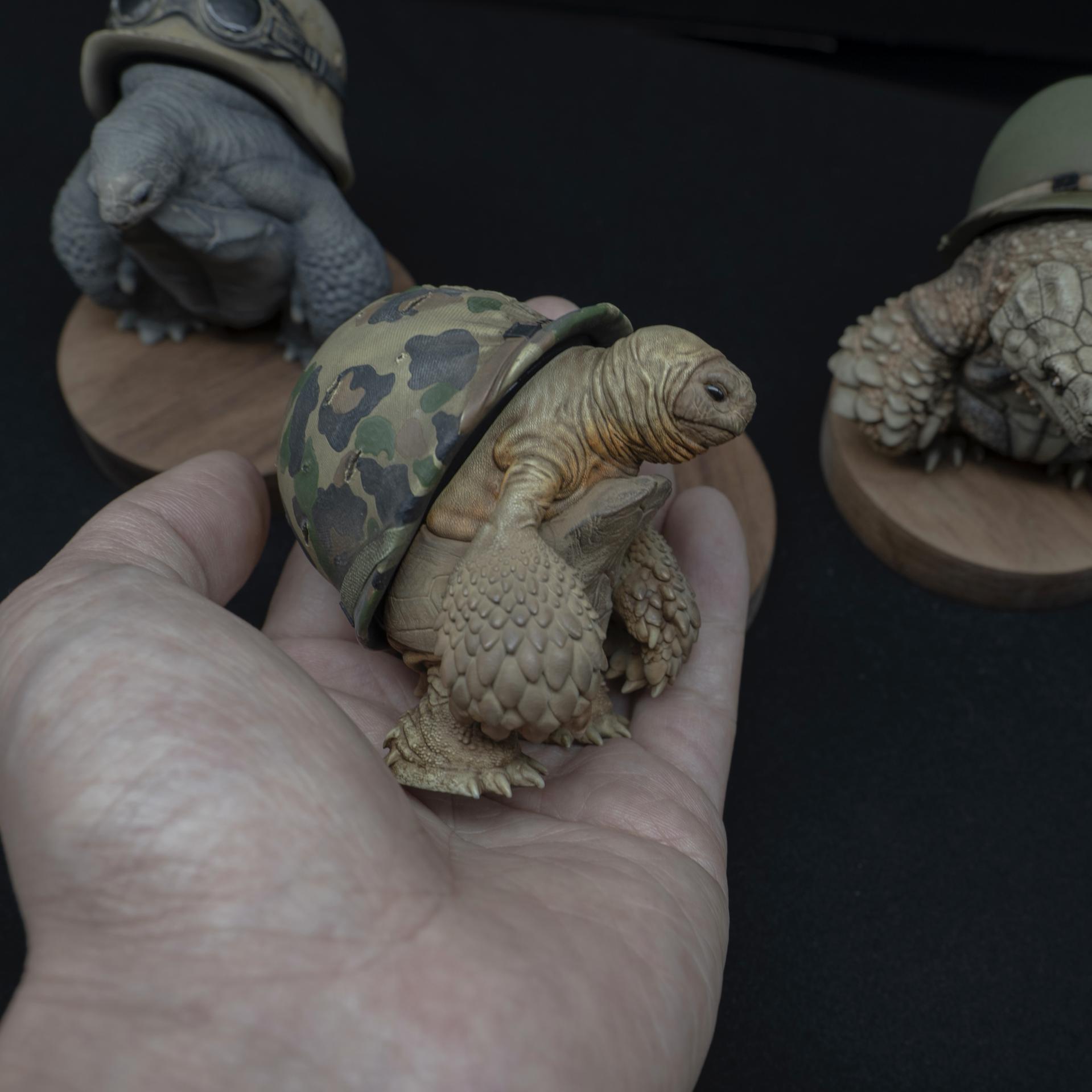 海龟佩戴的头盔象征着精神稳定和身体保护,但它们也传达了关于人类恐惧和焦虑的信息。