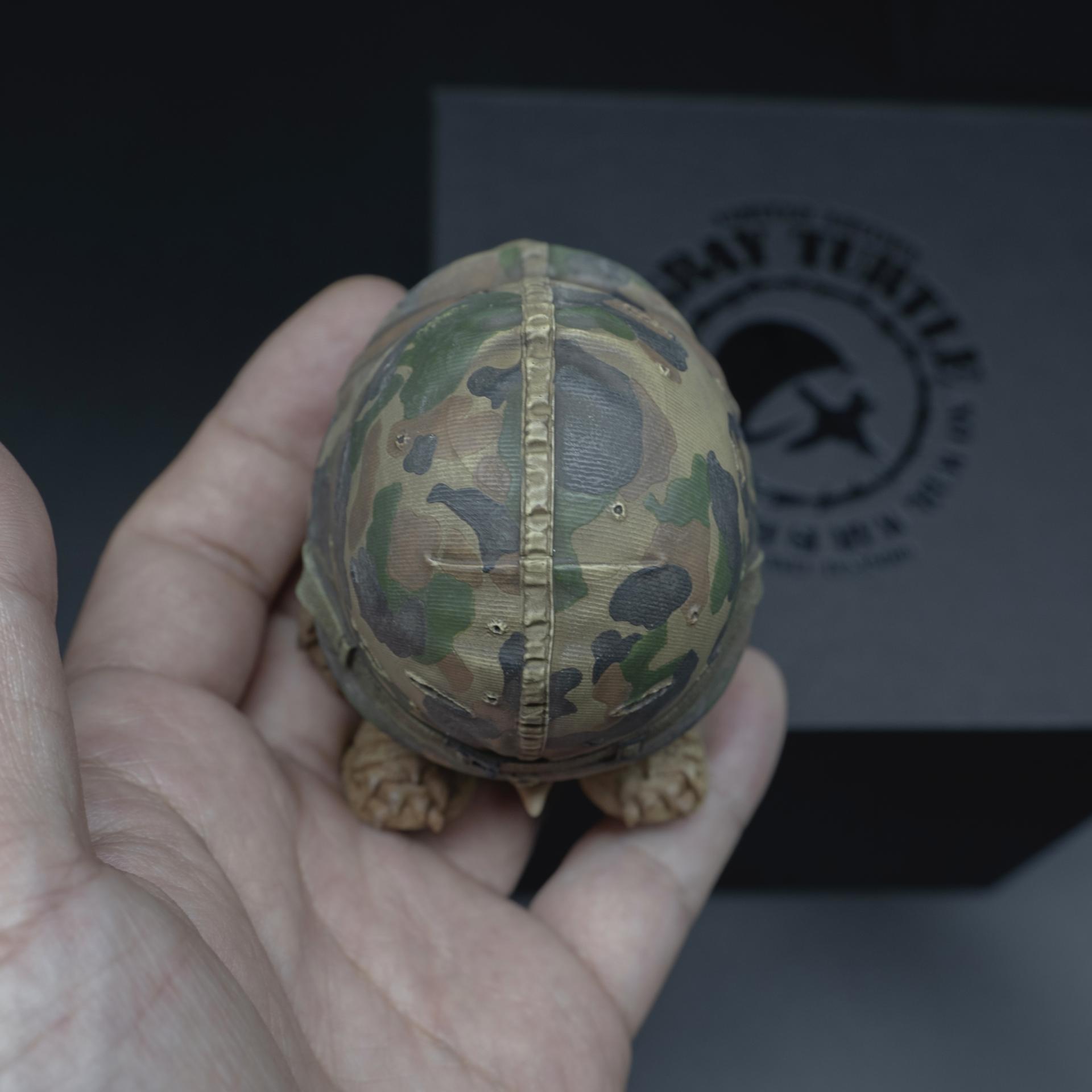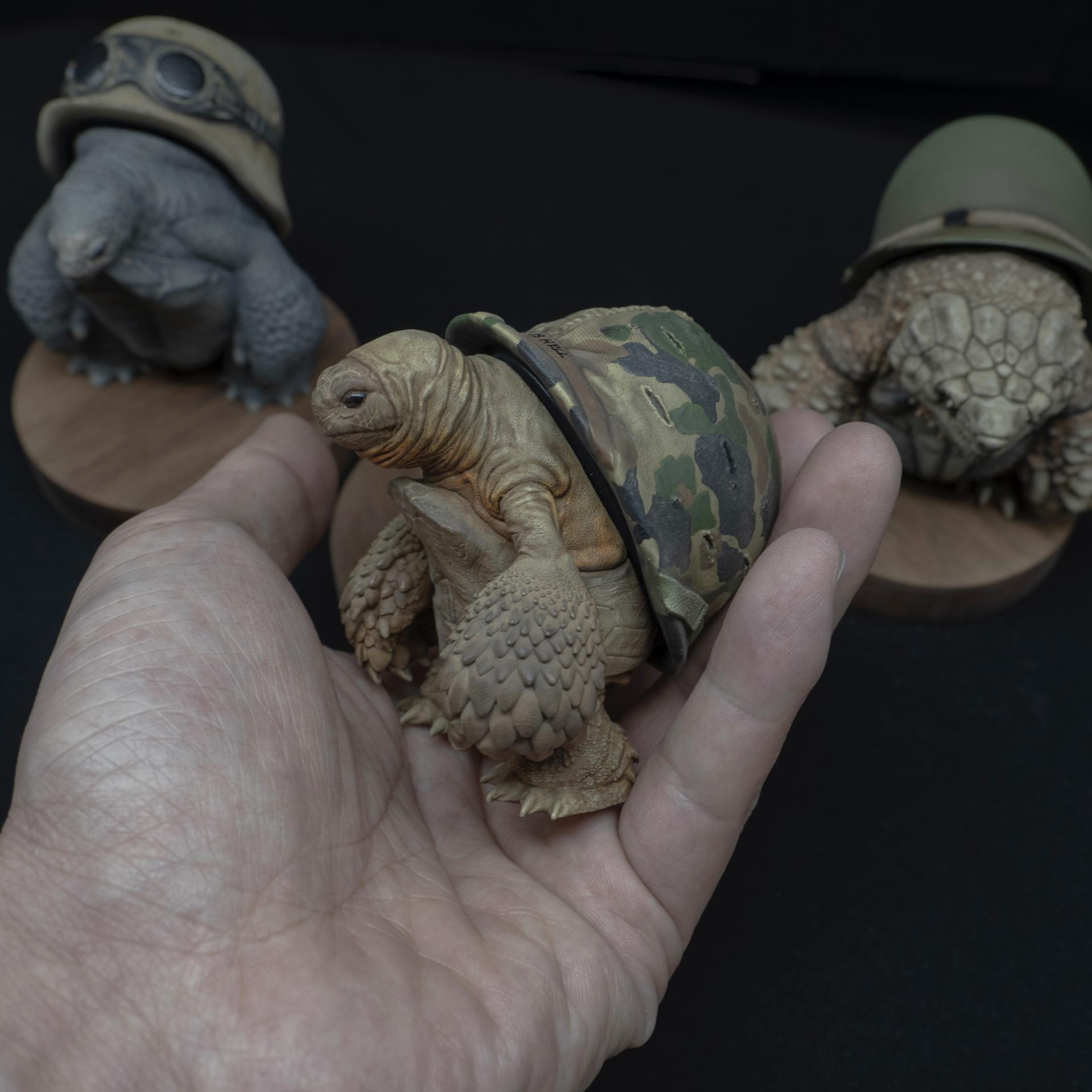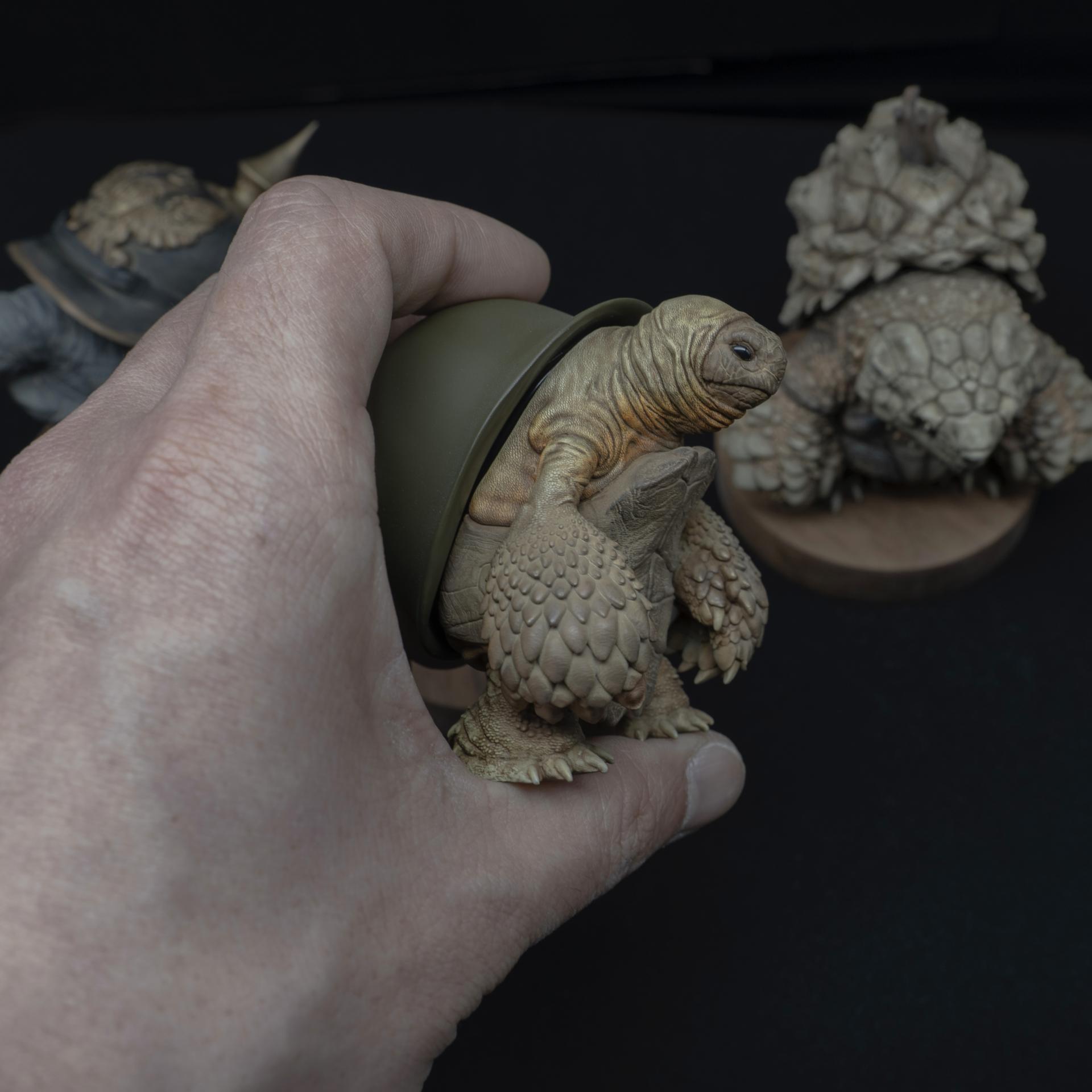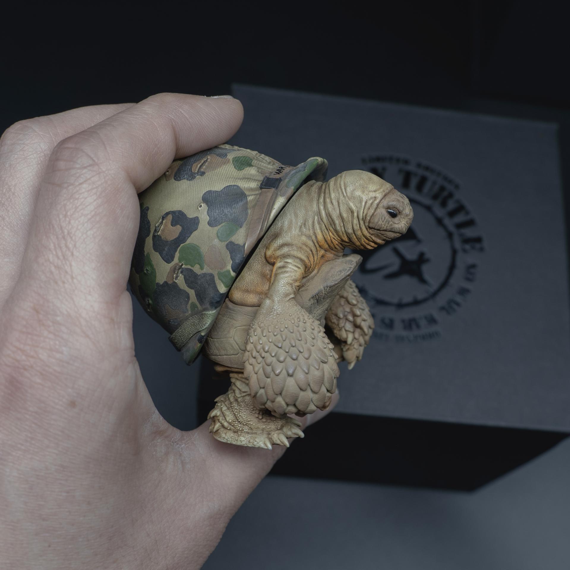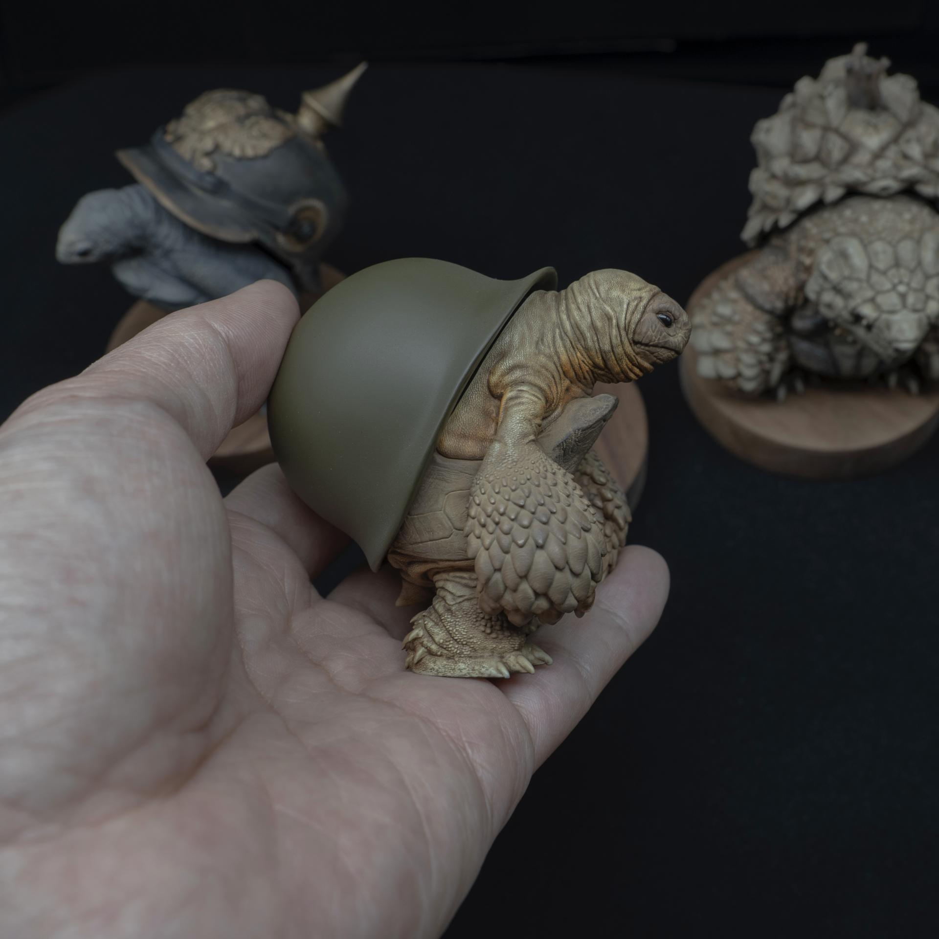 海龟佩戴的头盔象征着精神稳定和身体保护,但它们也传达了关于人类恐惧和焦虑的信息。