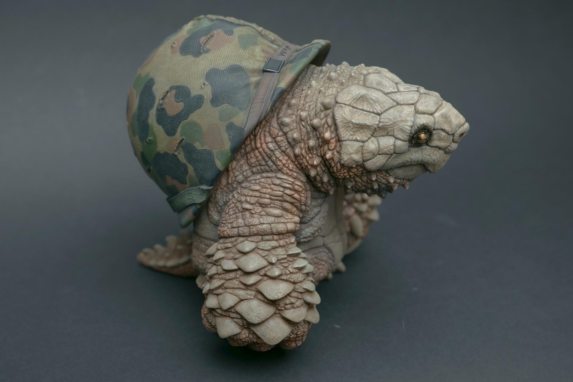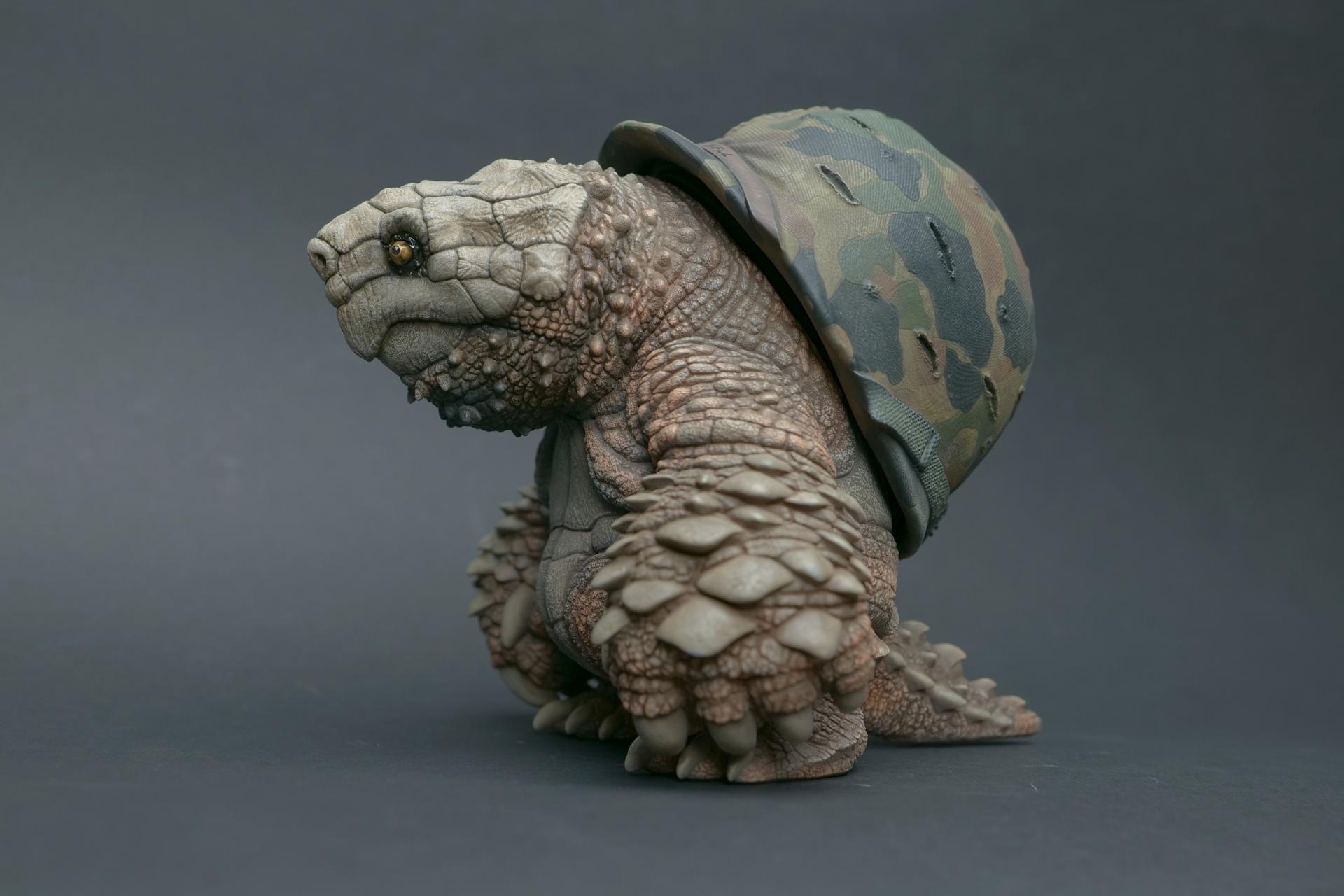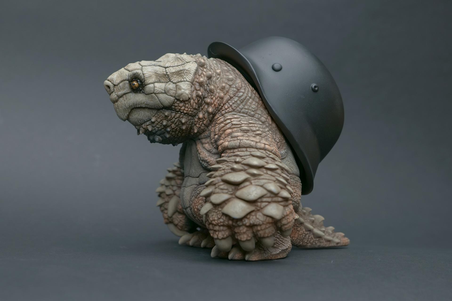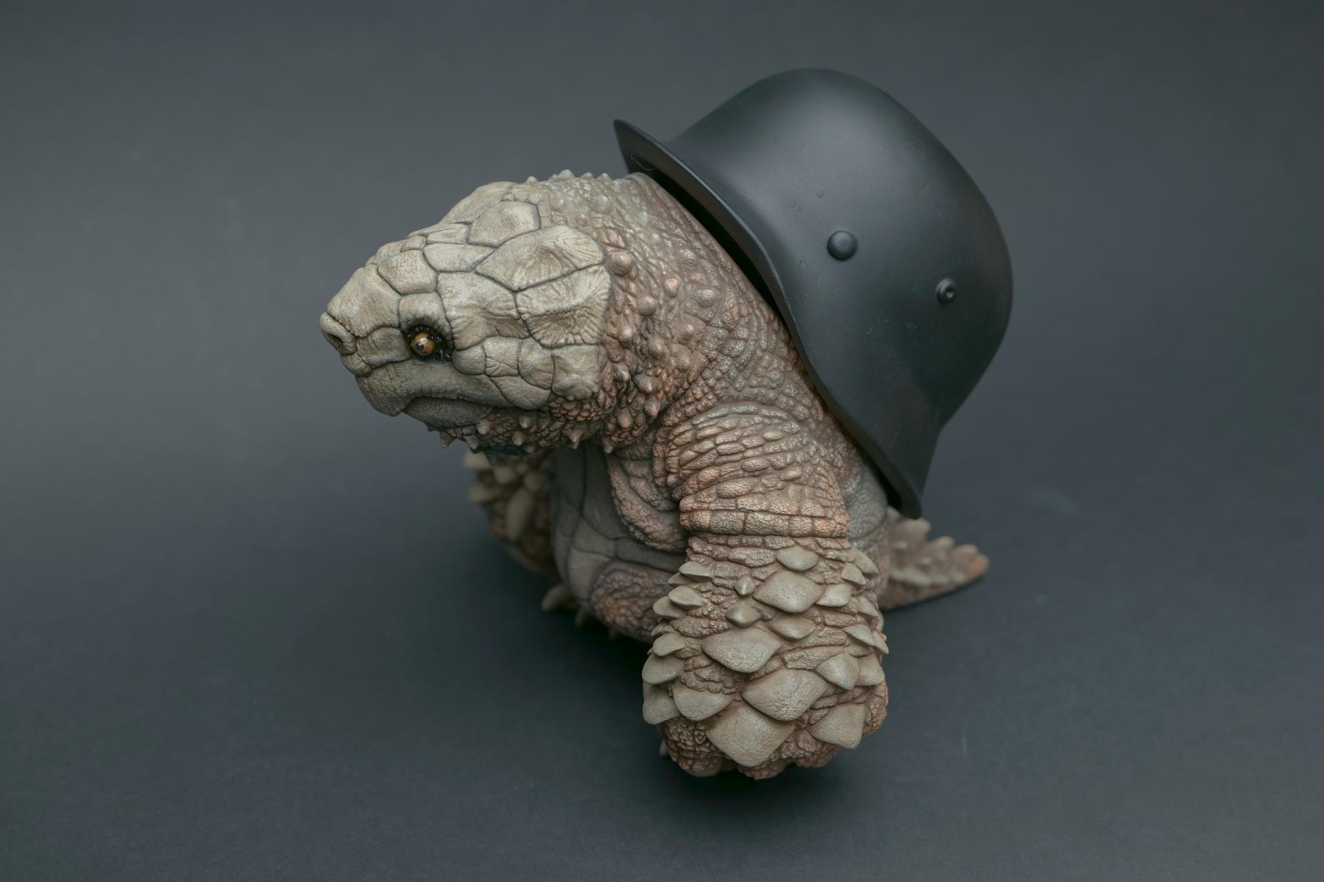 海龟佩戴的头盔象征着精神稳定和身体保护,但它们也传达了关于人类恐惧和焦虑的信息。