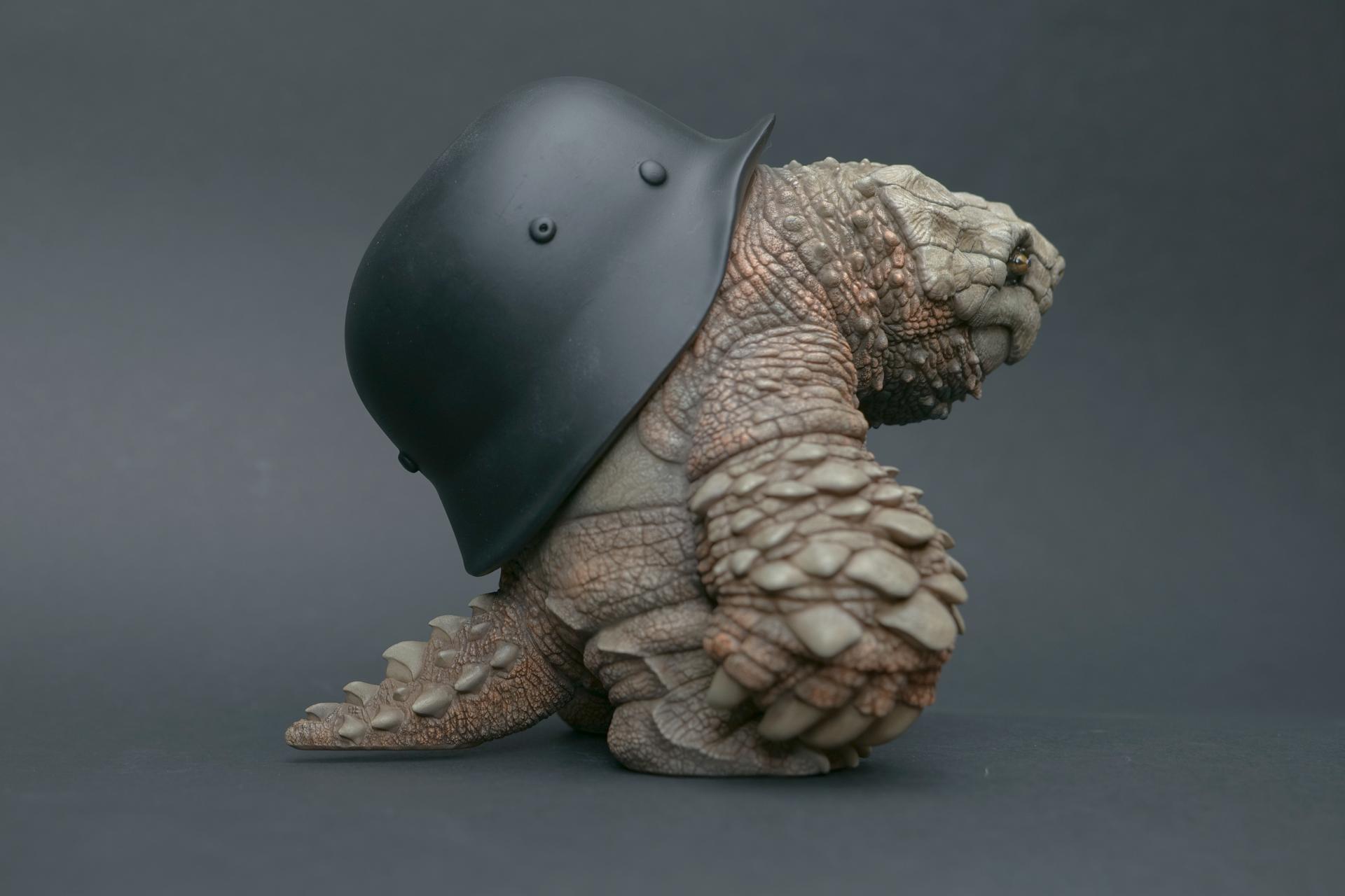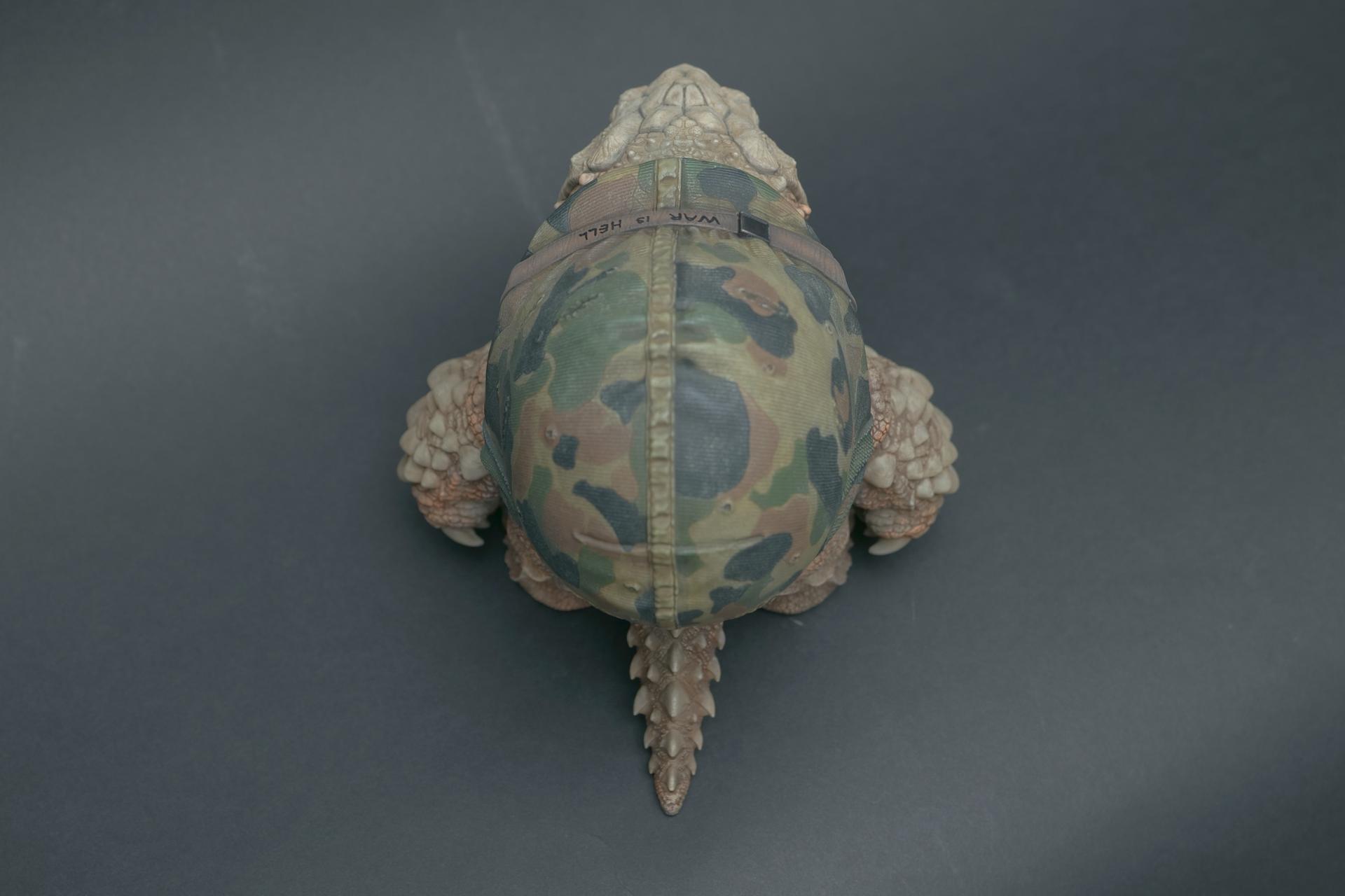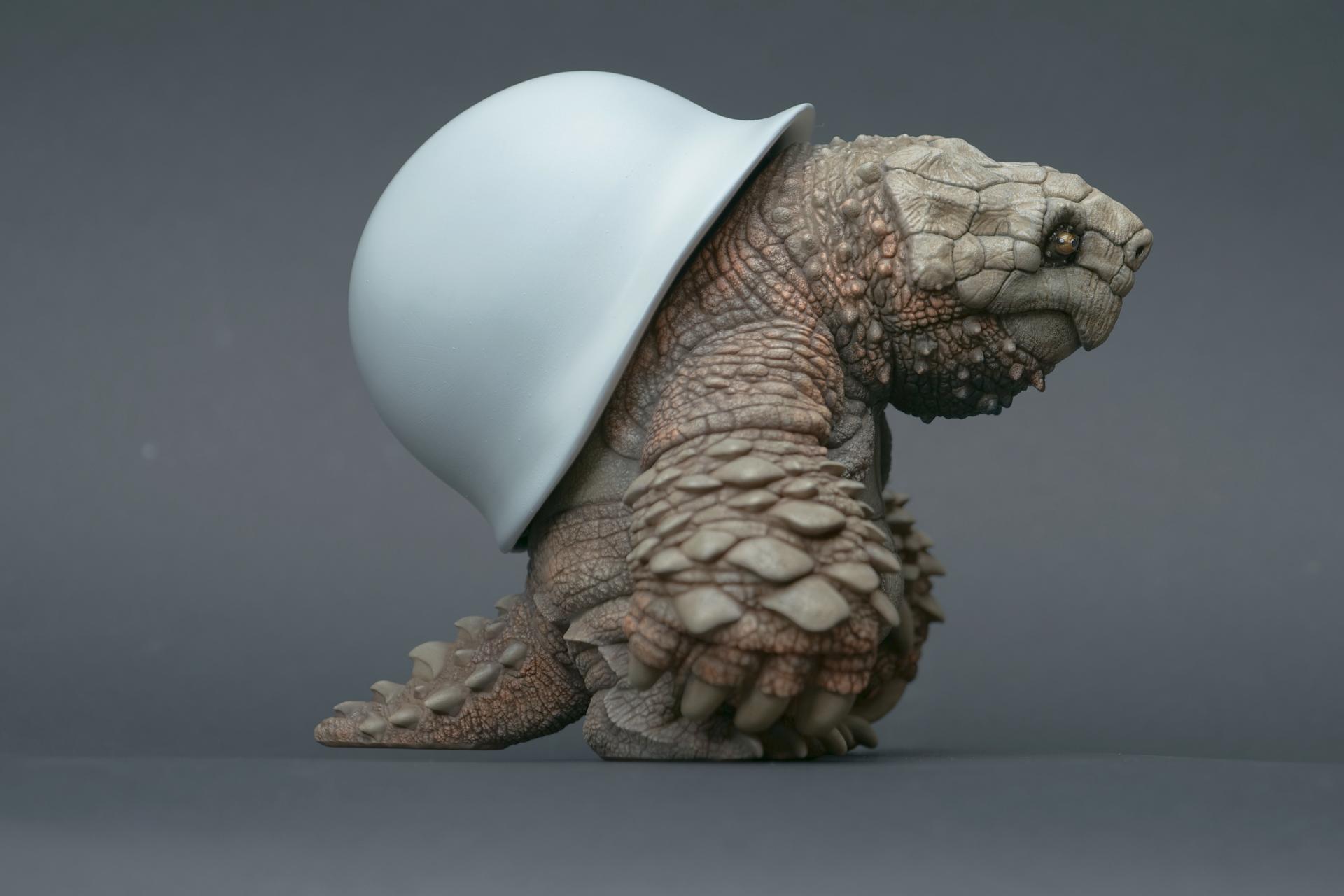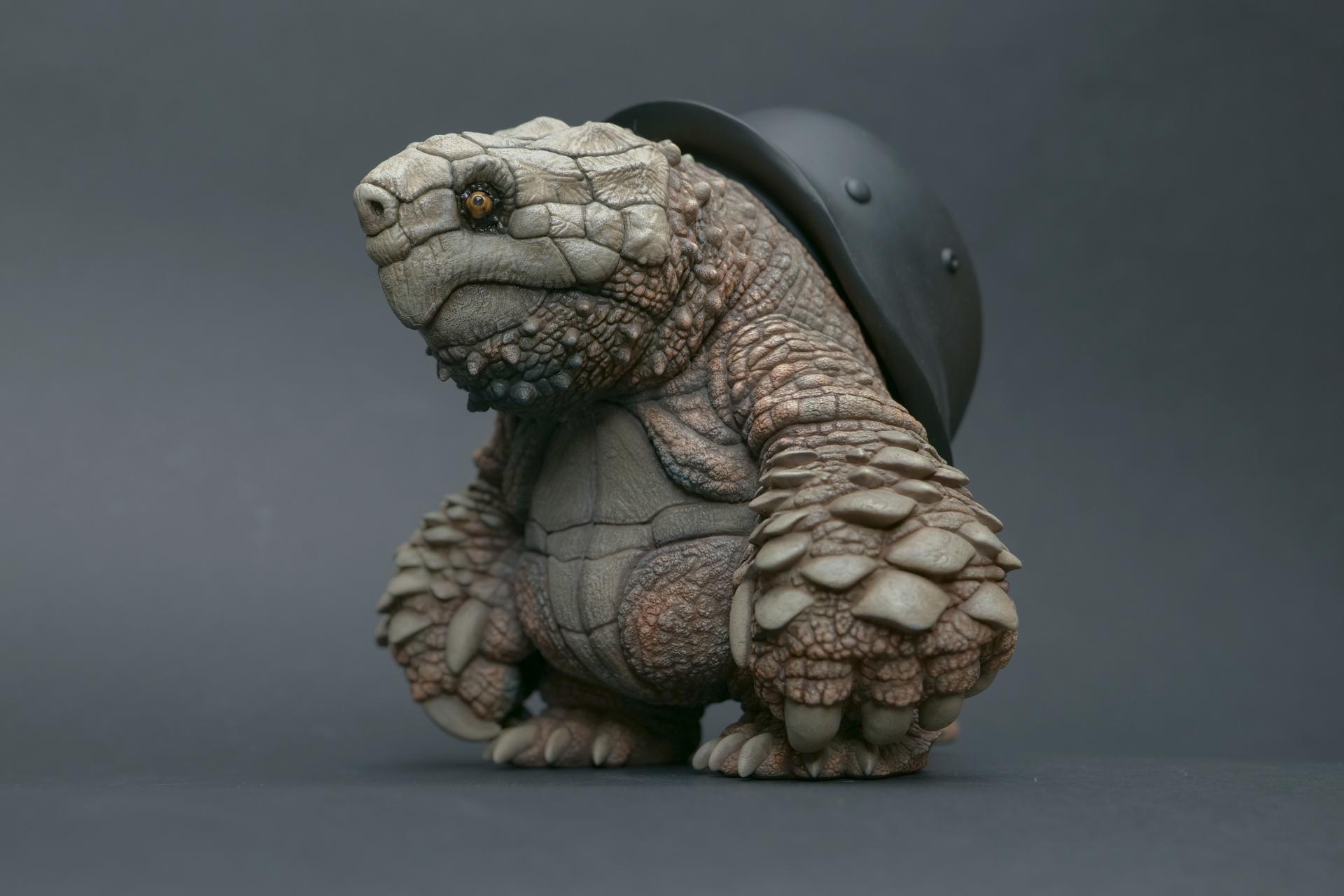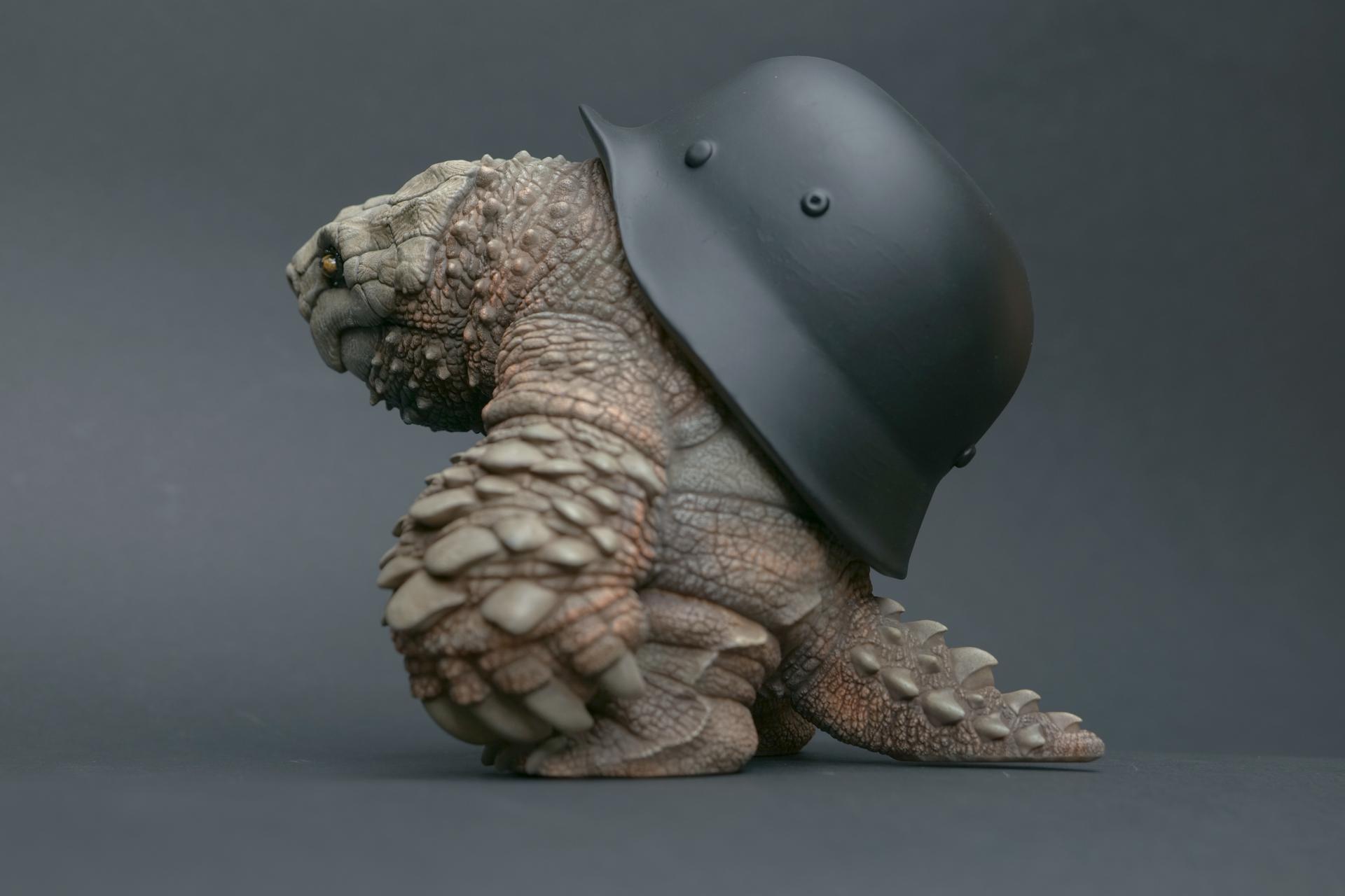 海龟佩戴的头盔象征着精神稳定和身体保护,但它们也传达了关于人类恐惧和焦虑的信息。