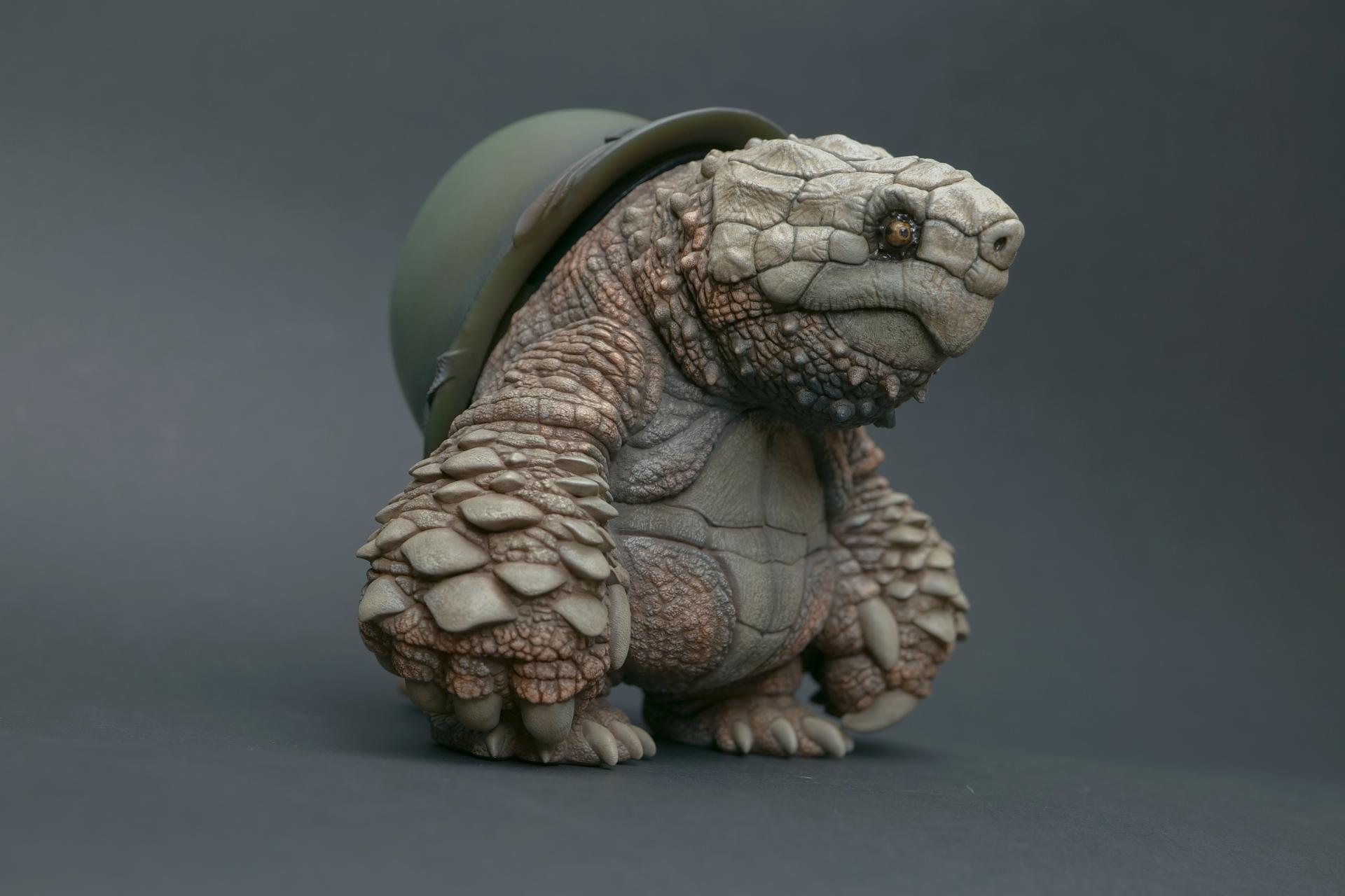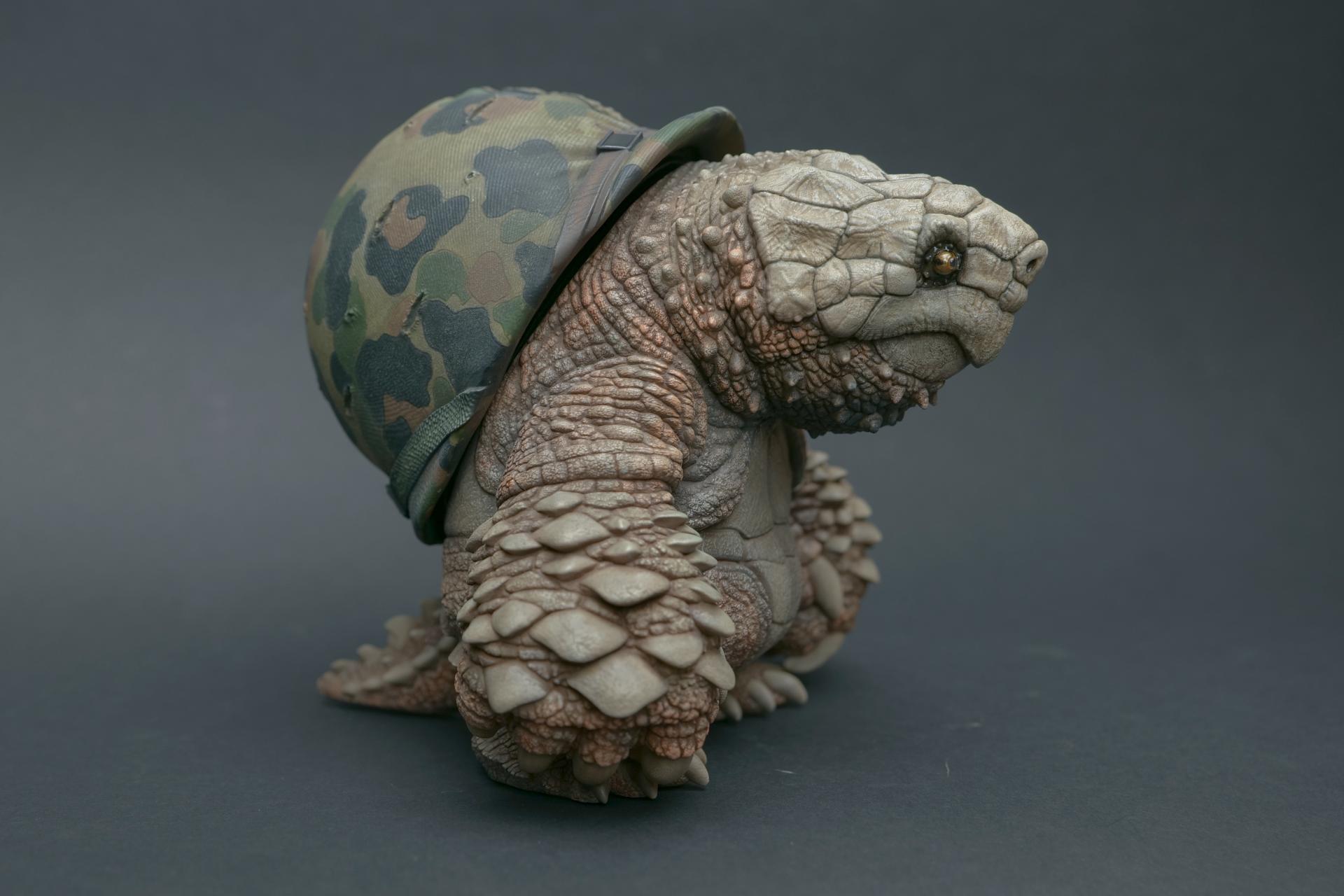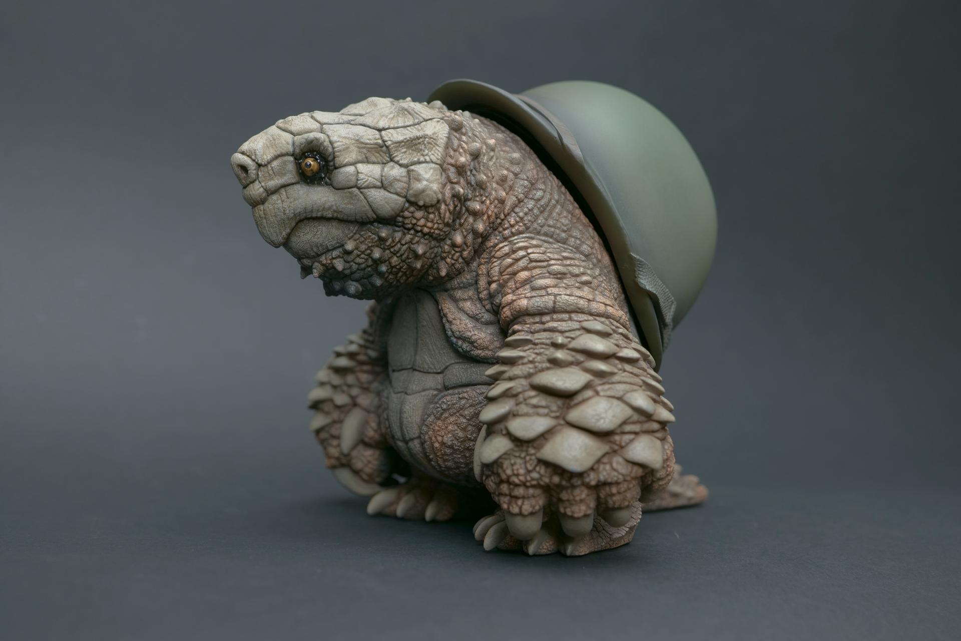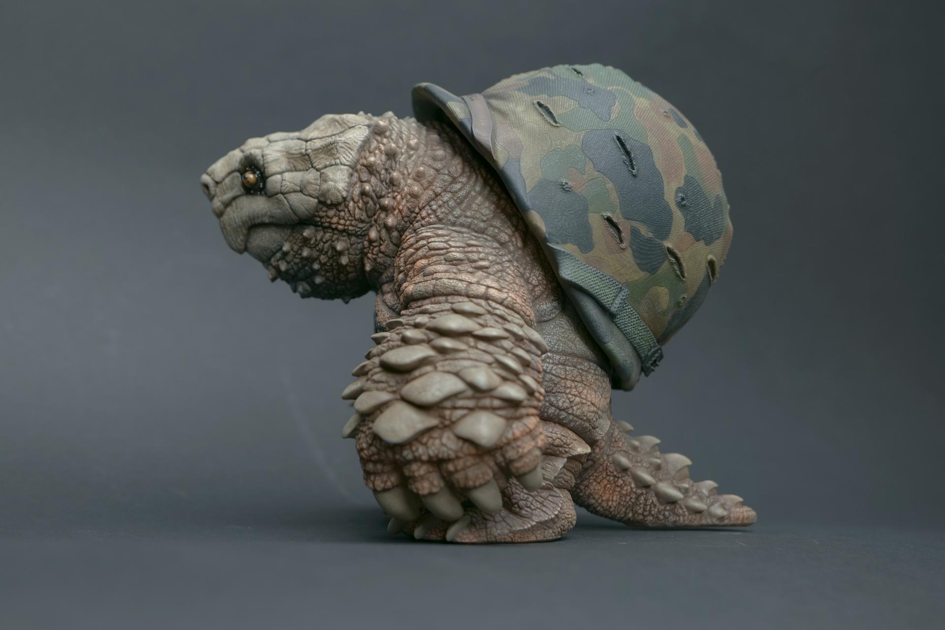 海龟佩戴的头盔象征着精神稳定和身体保护,但它们也传达了关于人类恐惧和焦虑的信息。