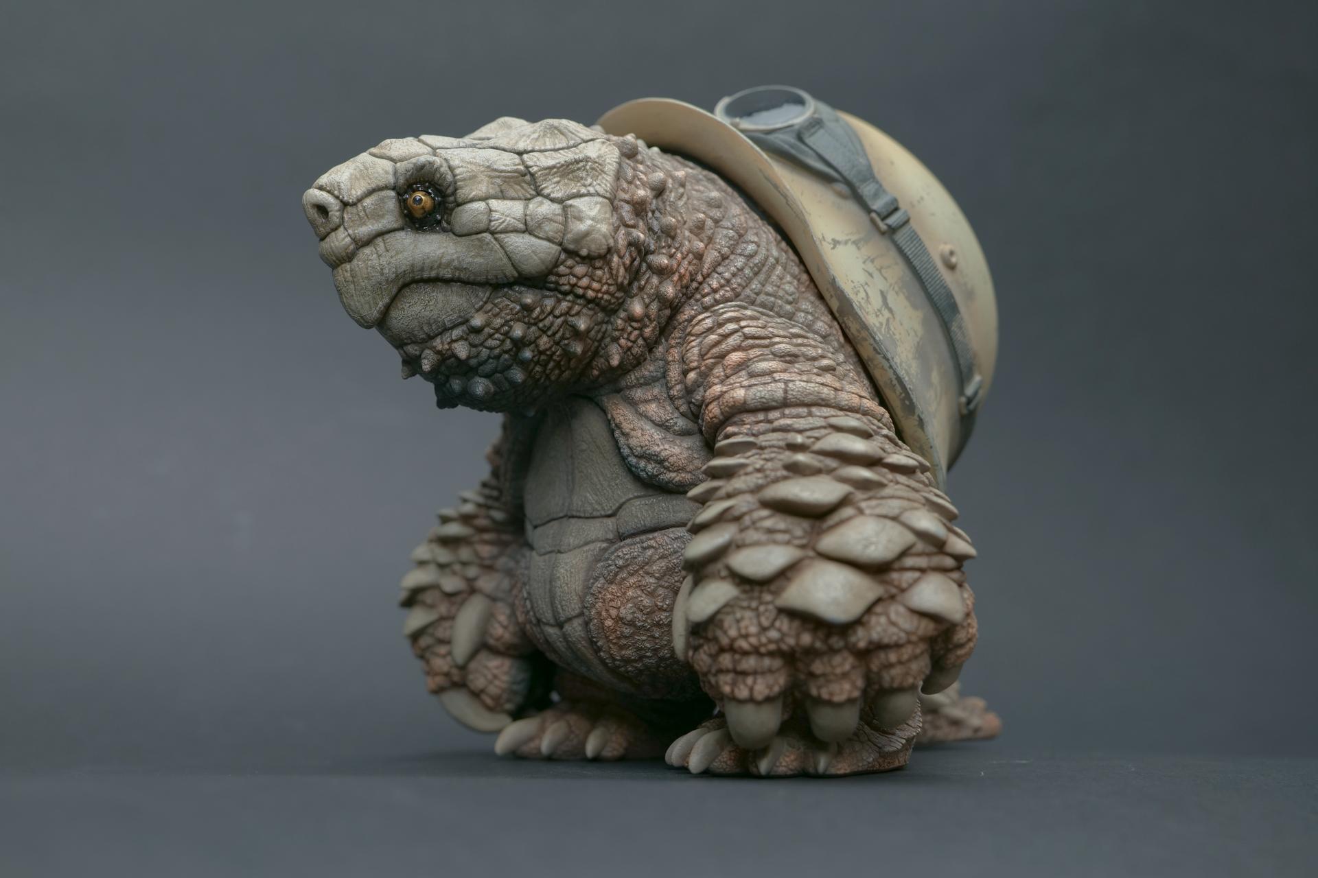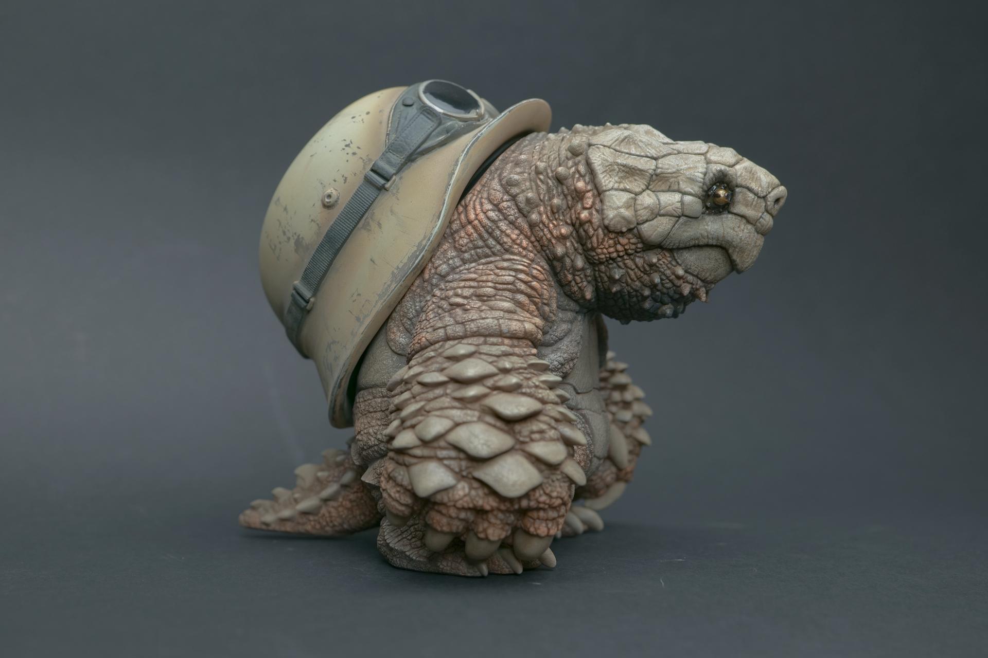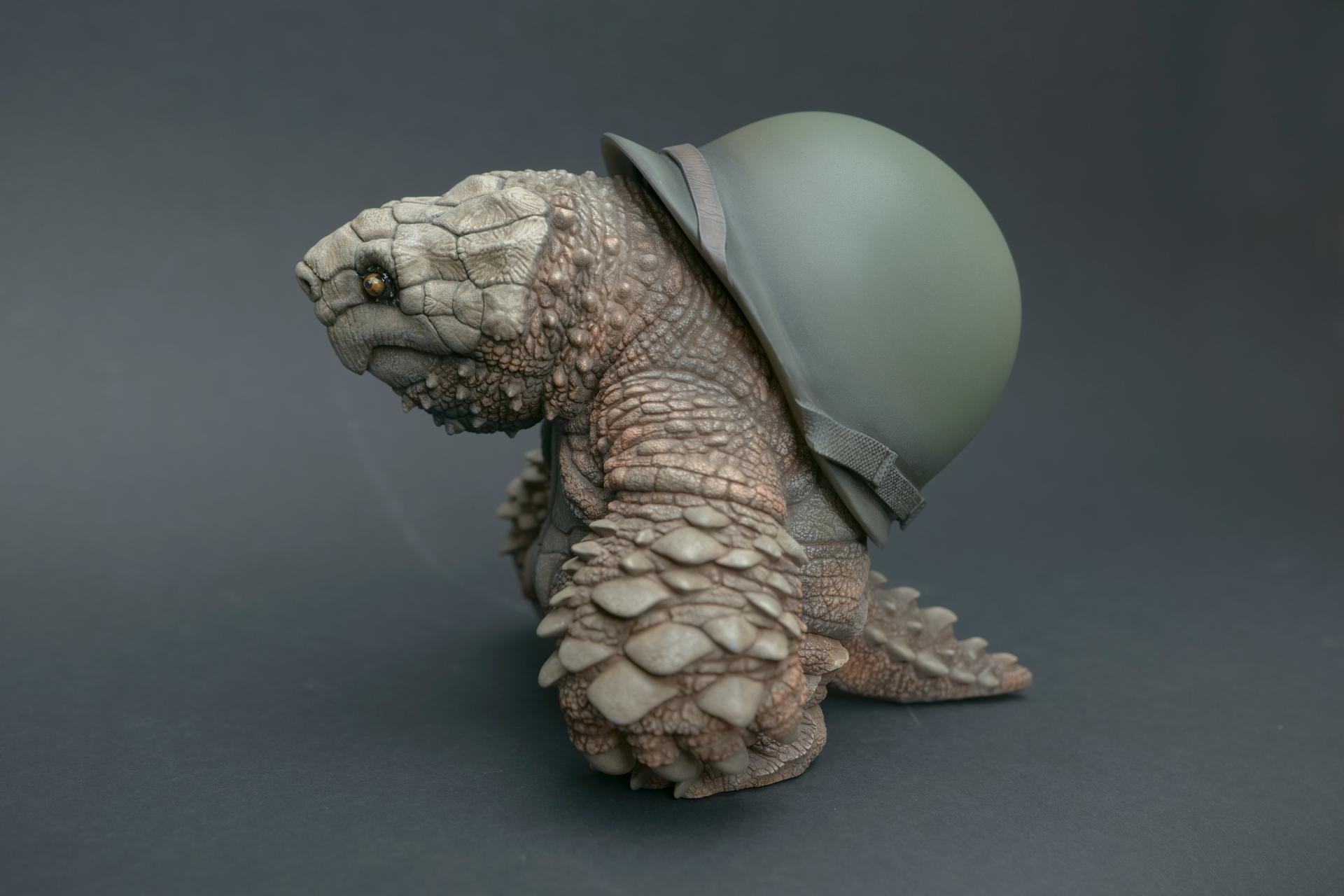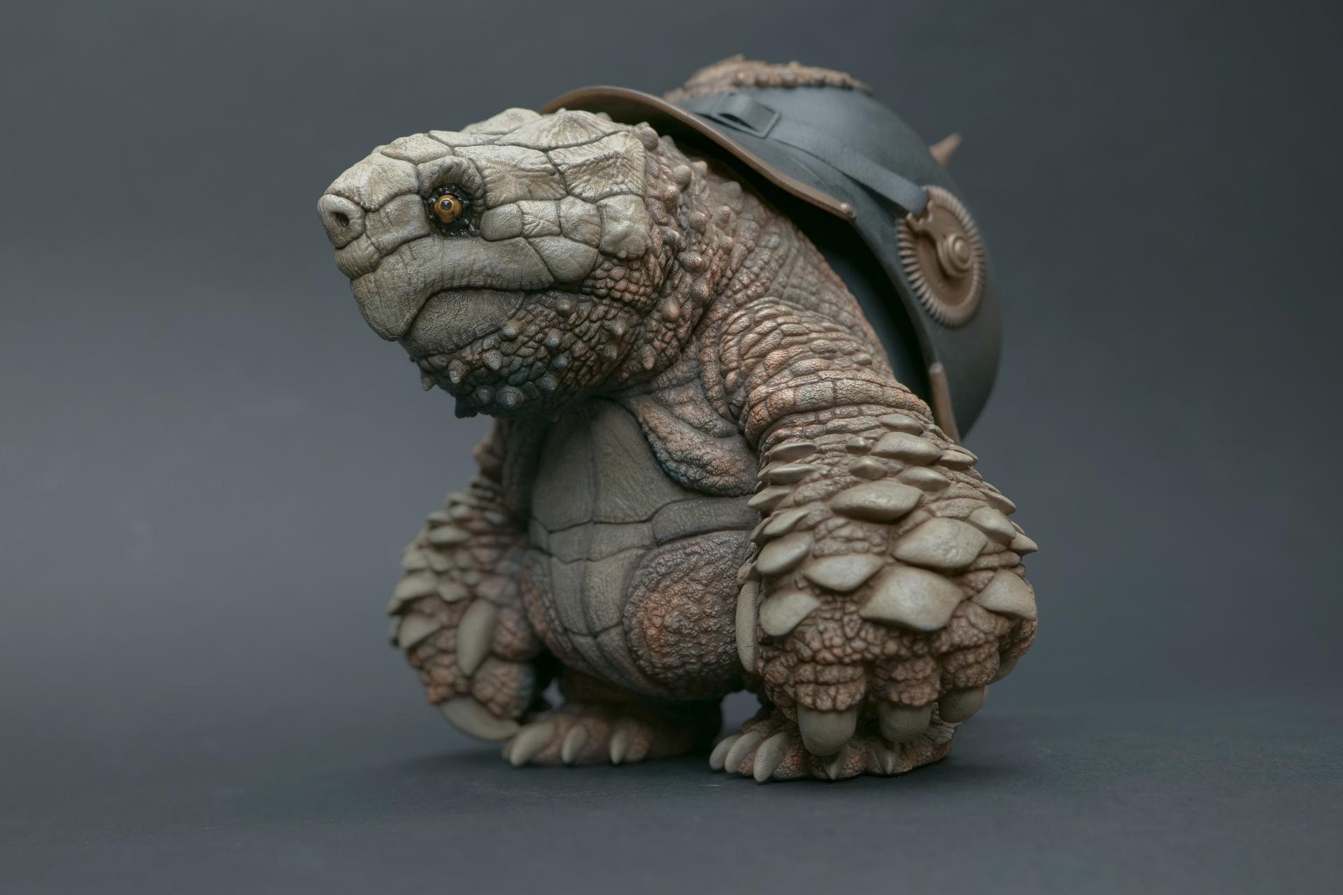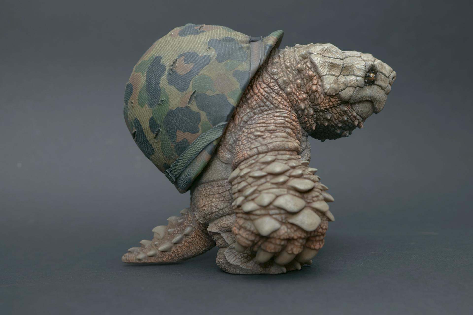 海龟佩戴的头盔象征着精神稳定和身体保护,但它们也传达了关于人类恐惧和焦虑的信息。