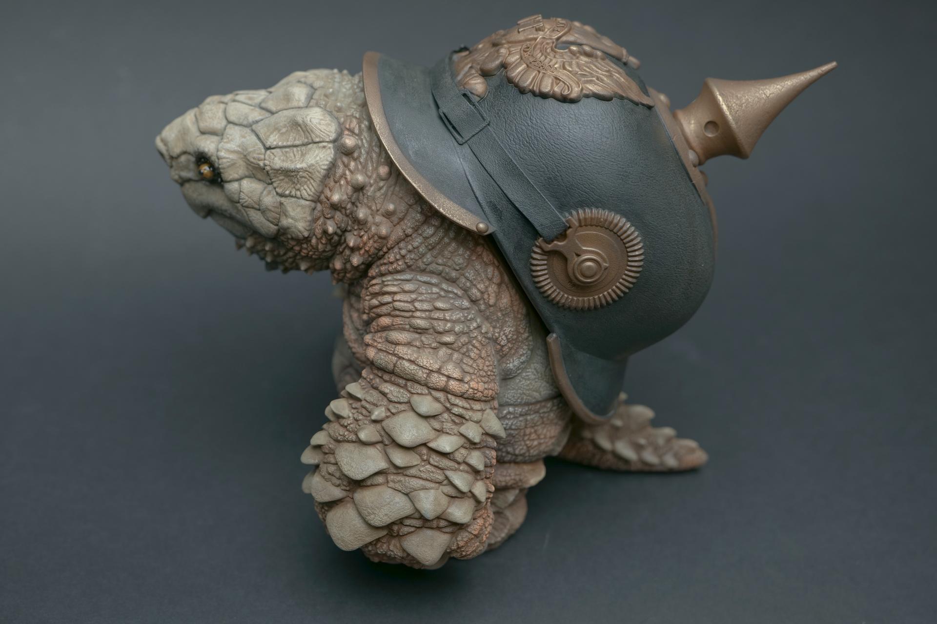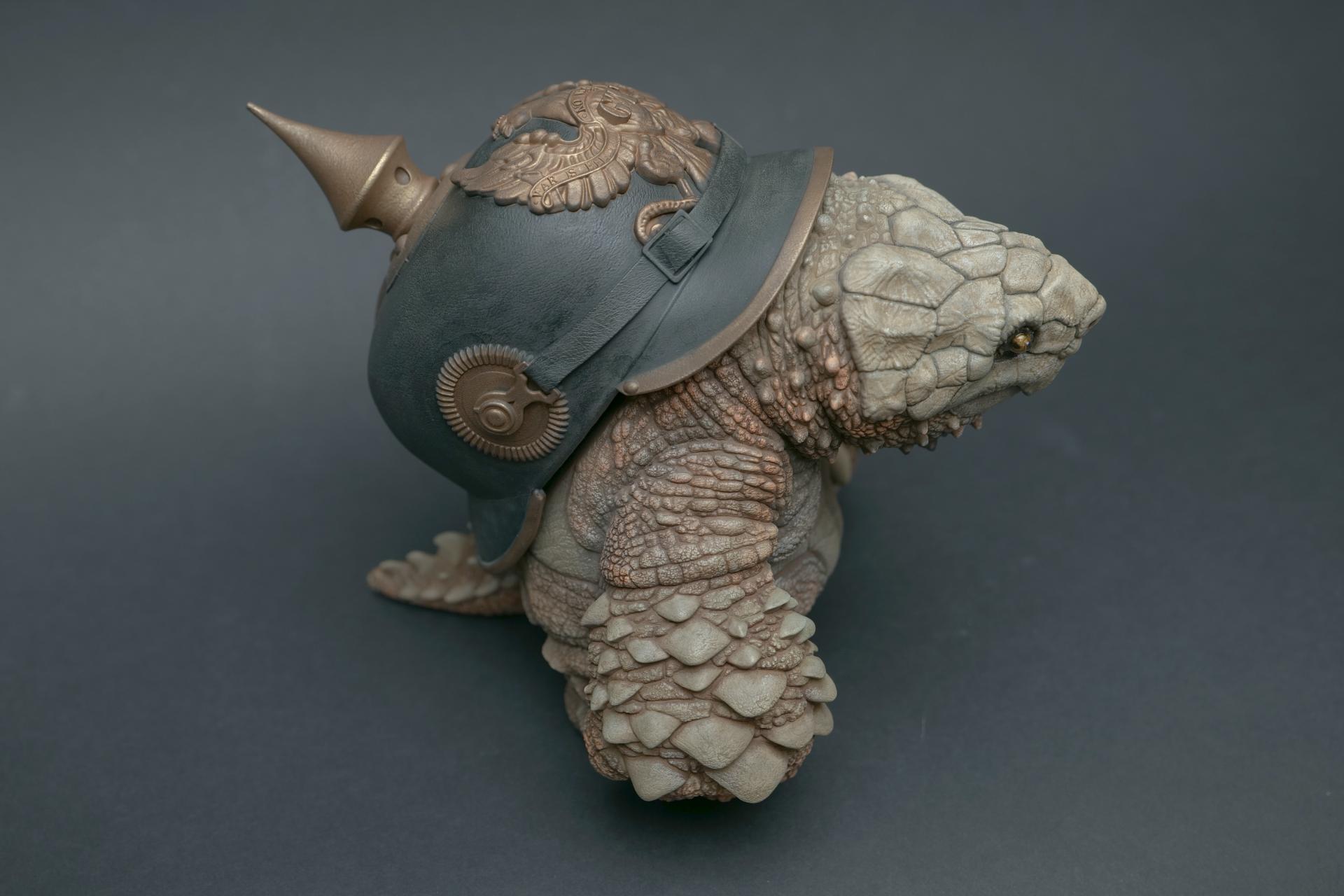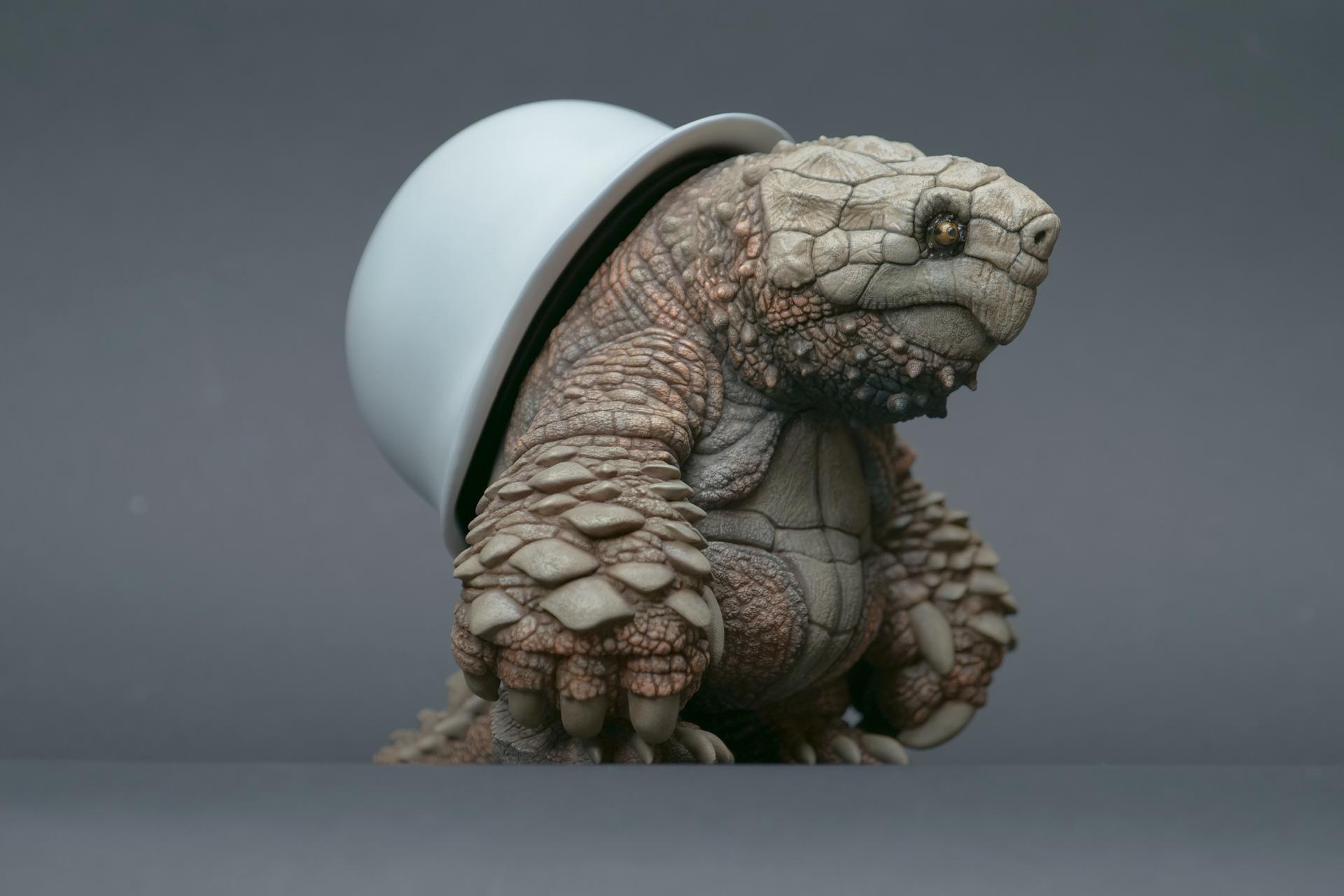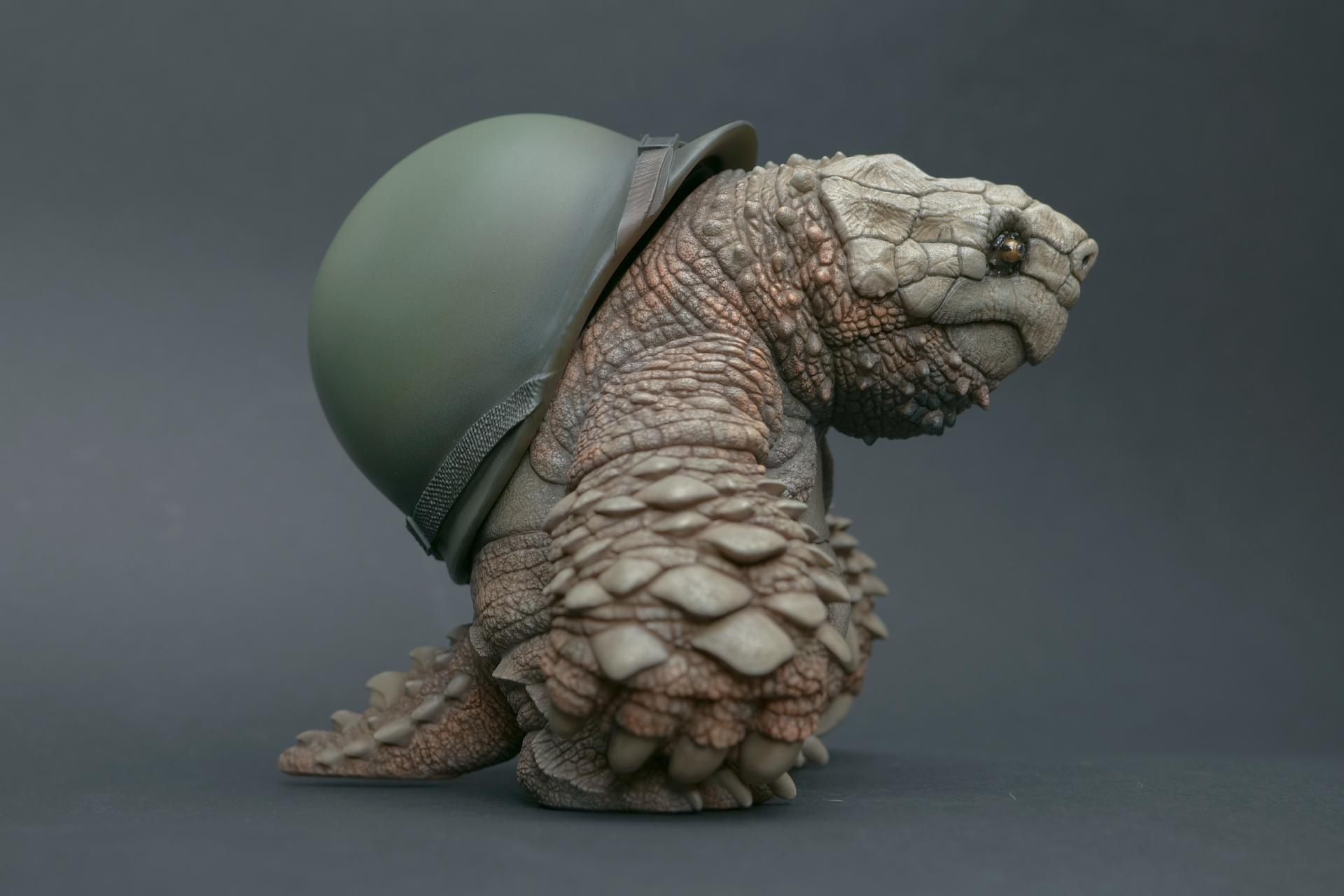 海龟佩戴的头盔象征着精神稳定和身体保护,但它们也传达了关于人类恐惧和焦虑的信息。