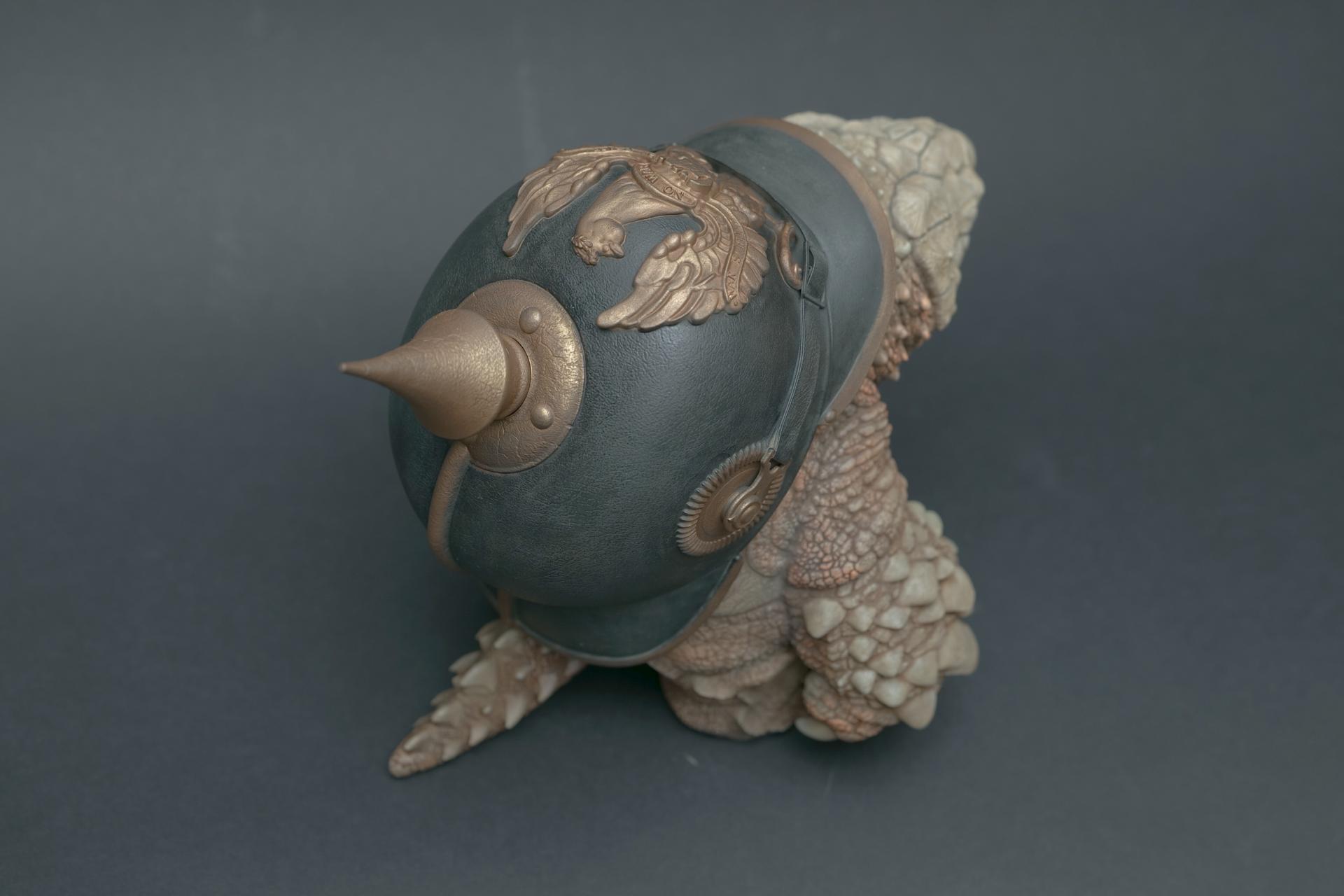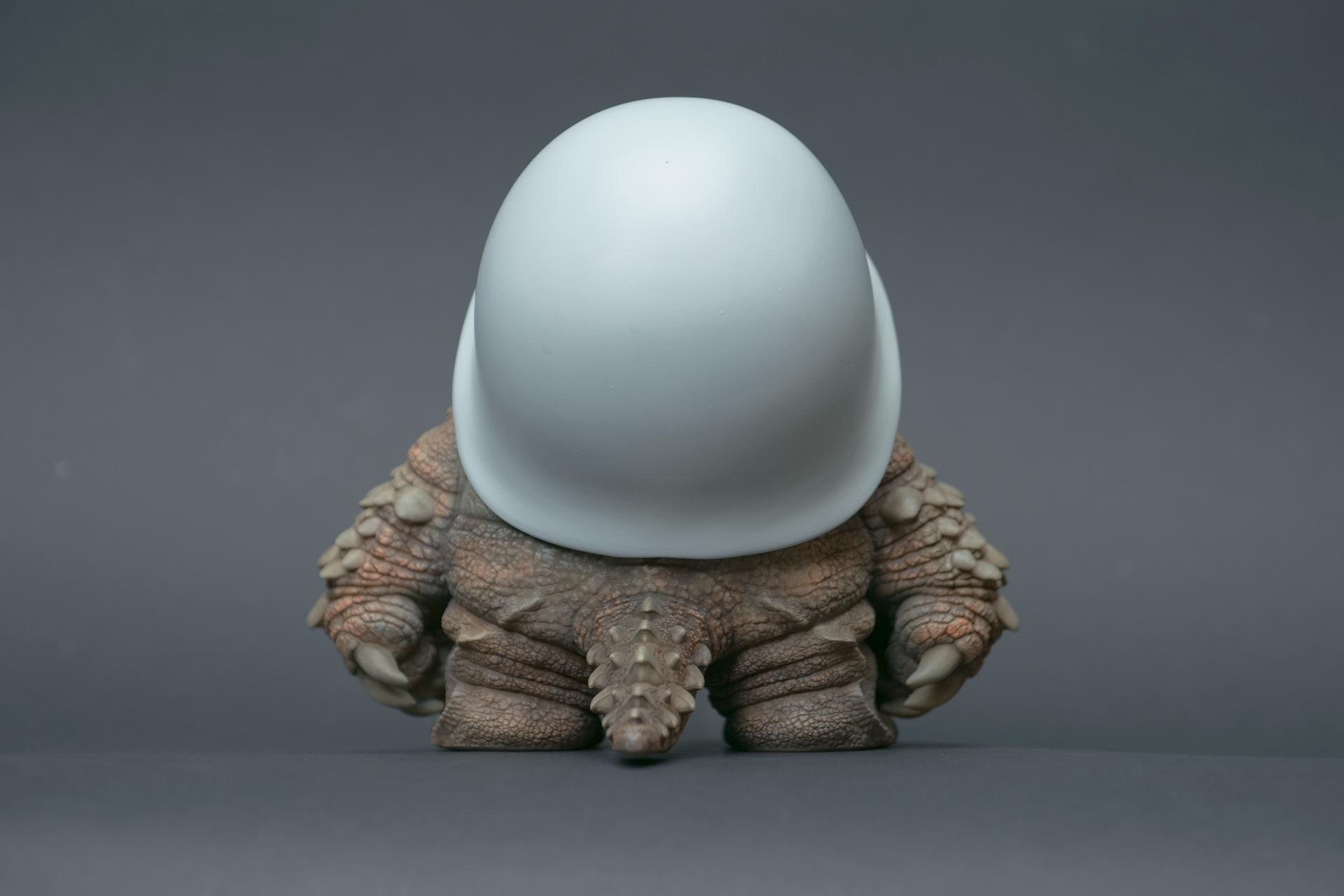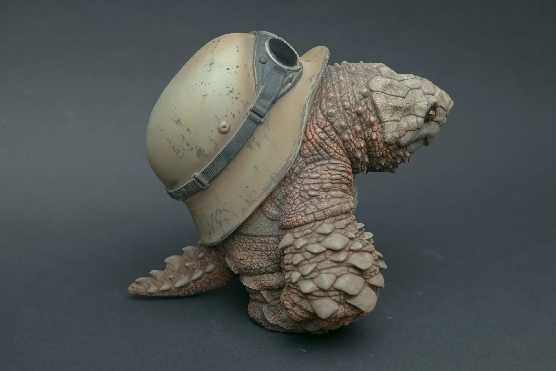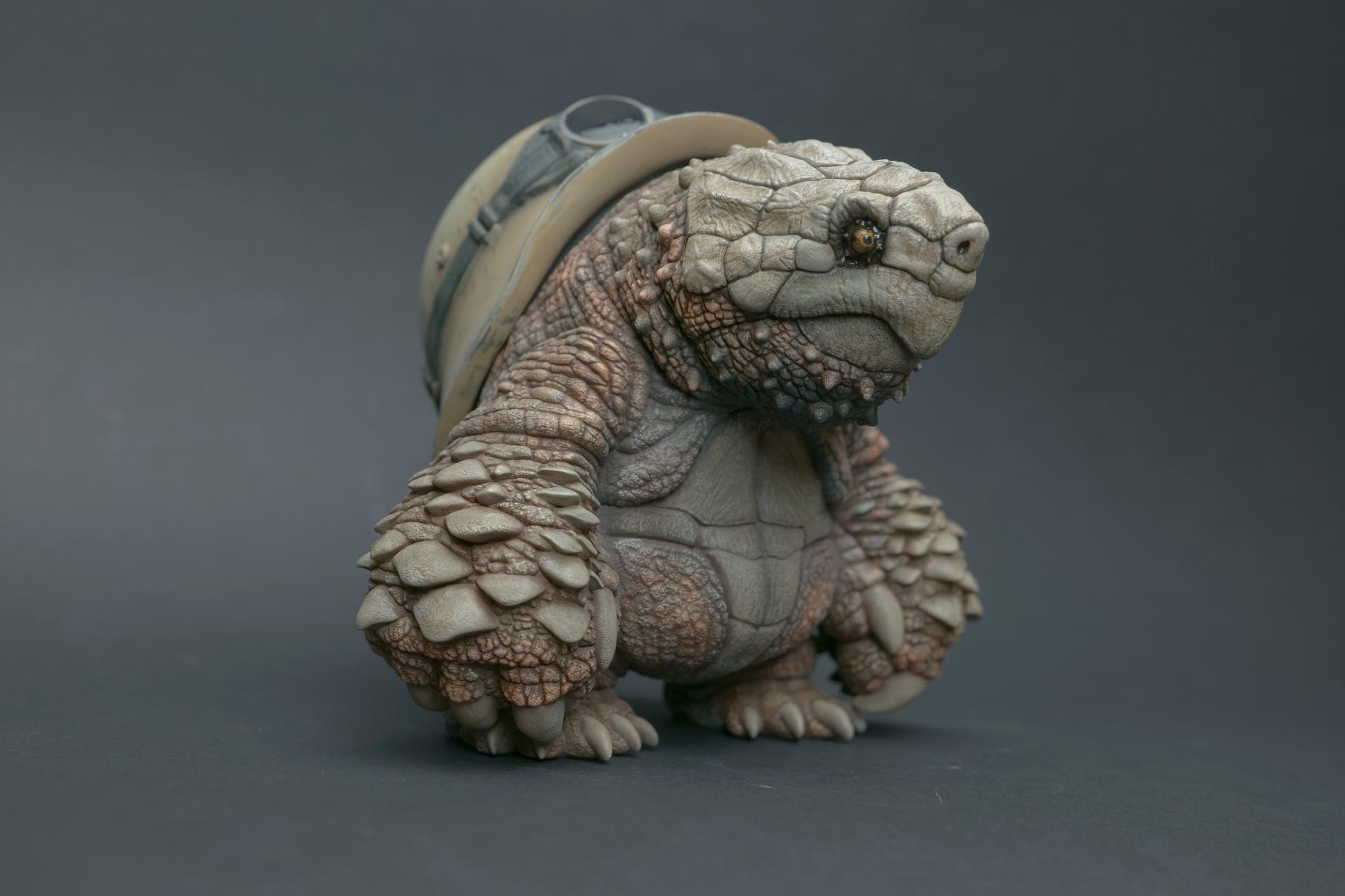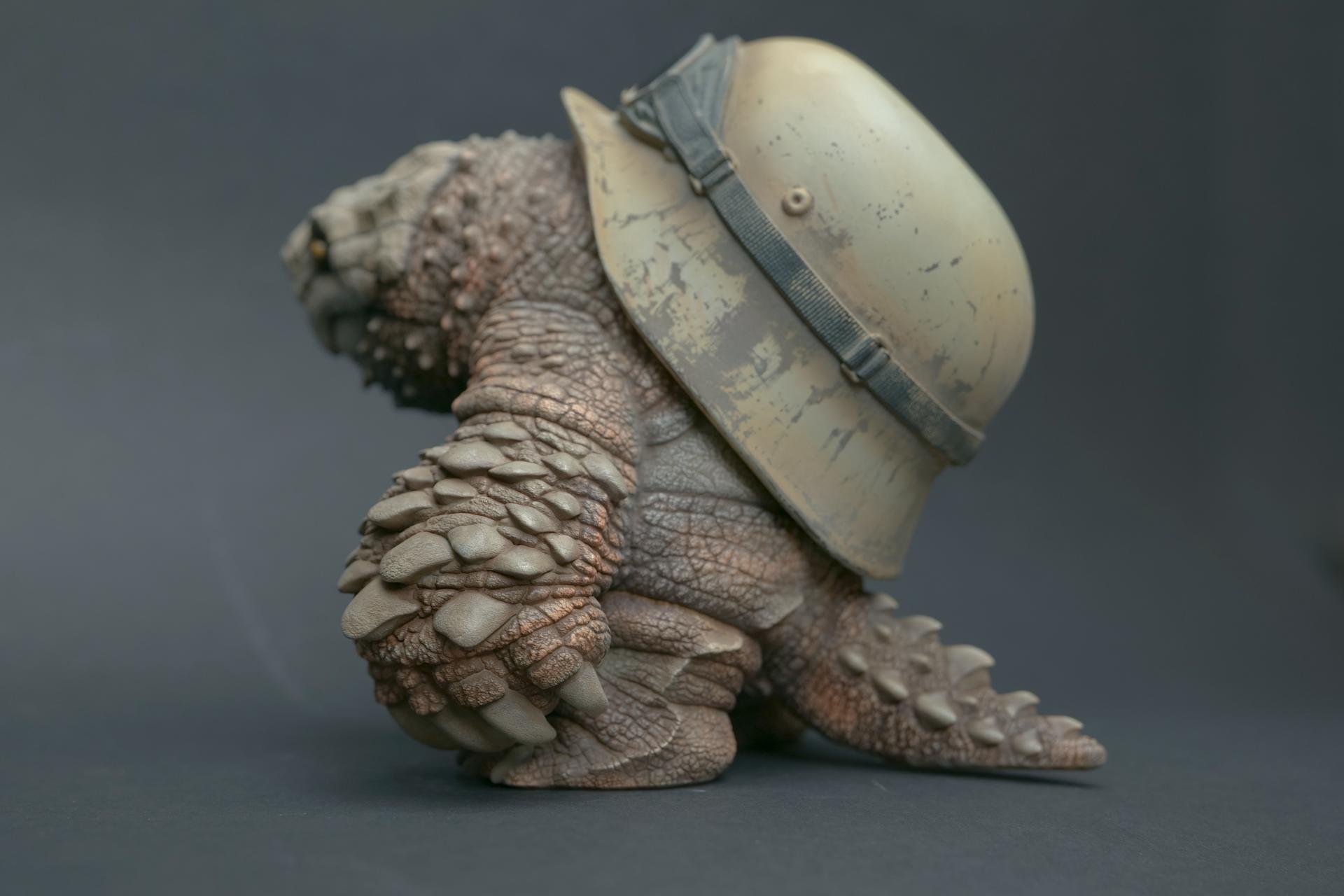 海龟佩戴的头盔象征着精神稳定和身体保护,但它们也传达了关于人类恐惧和焦虑的信息。