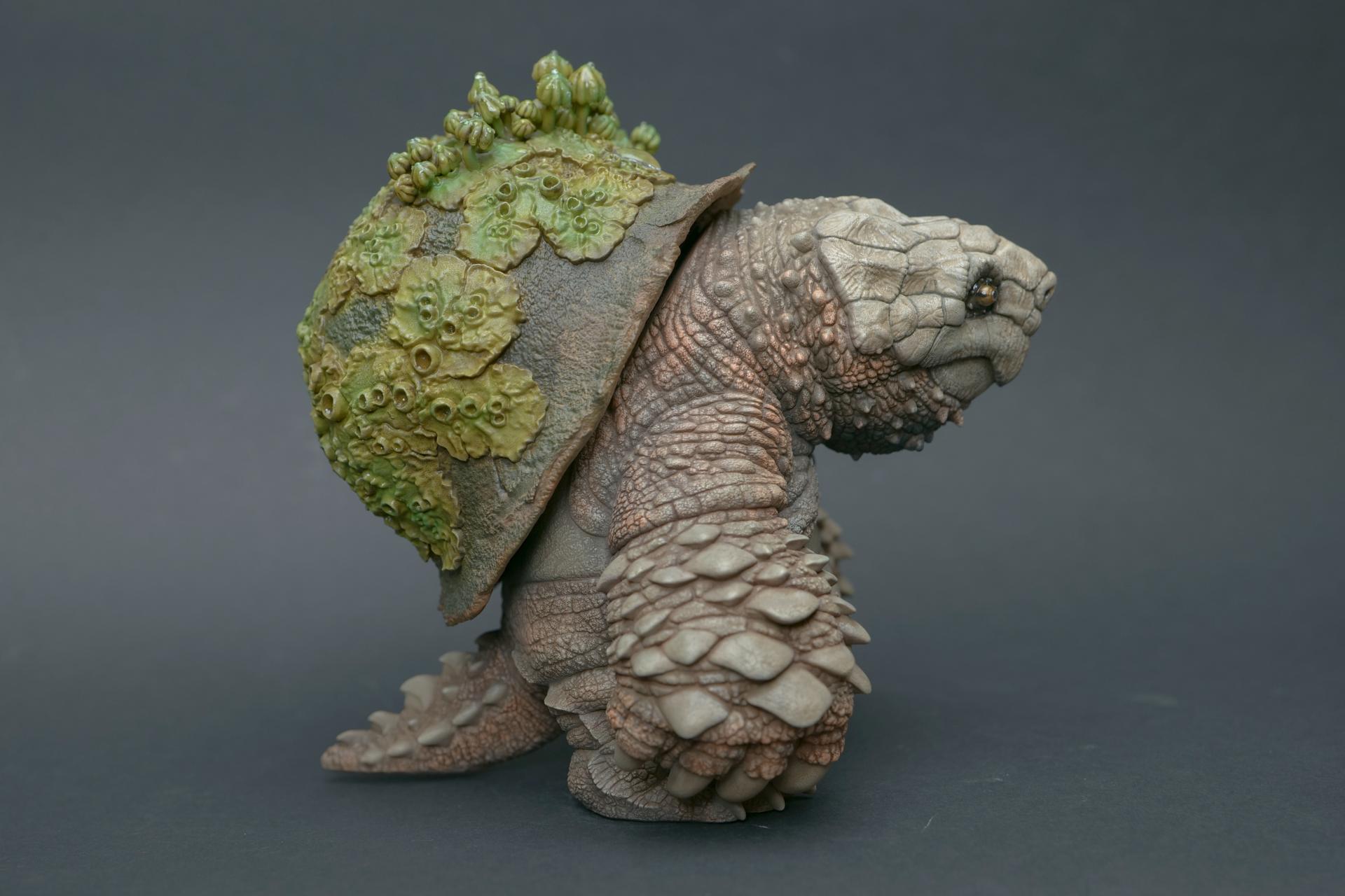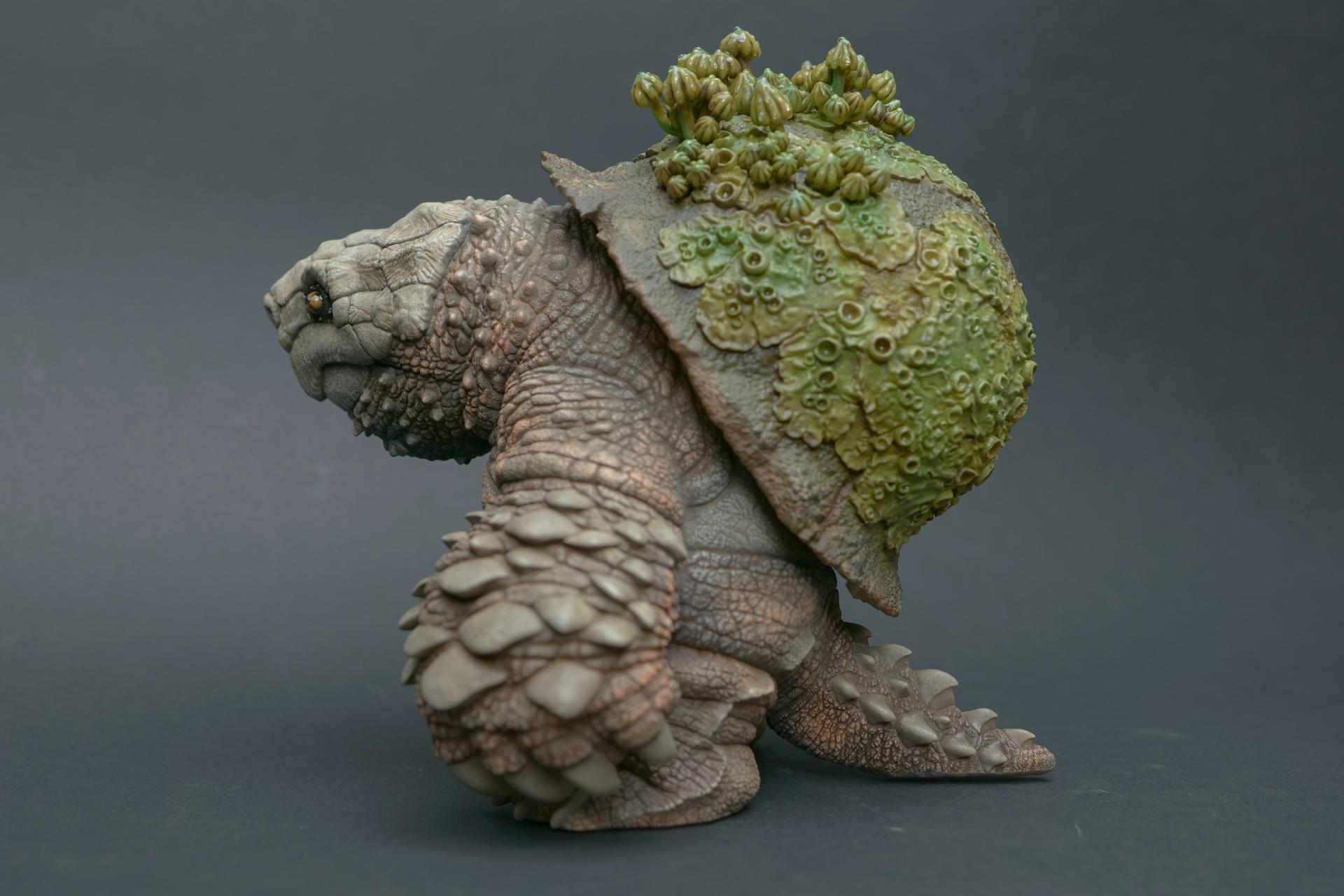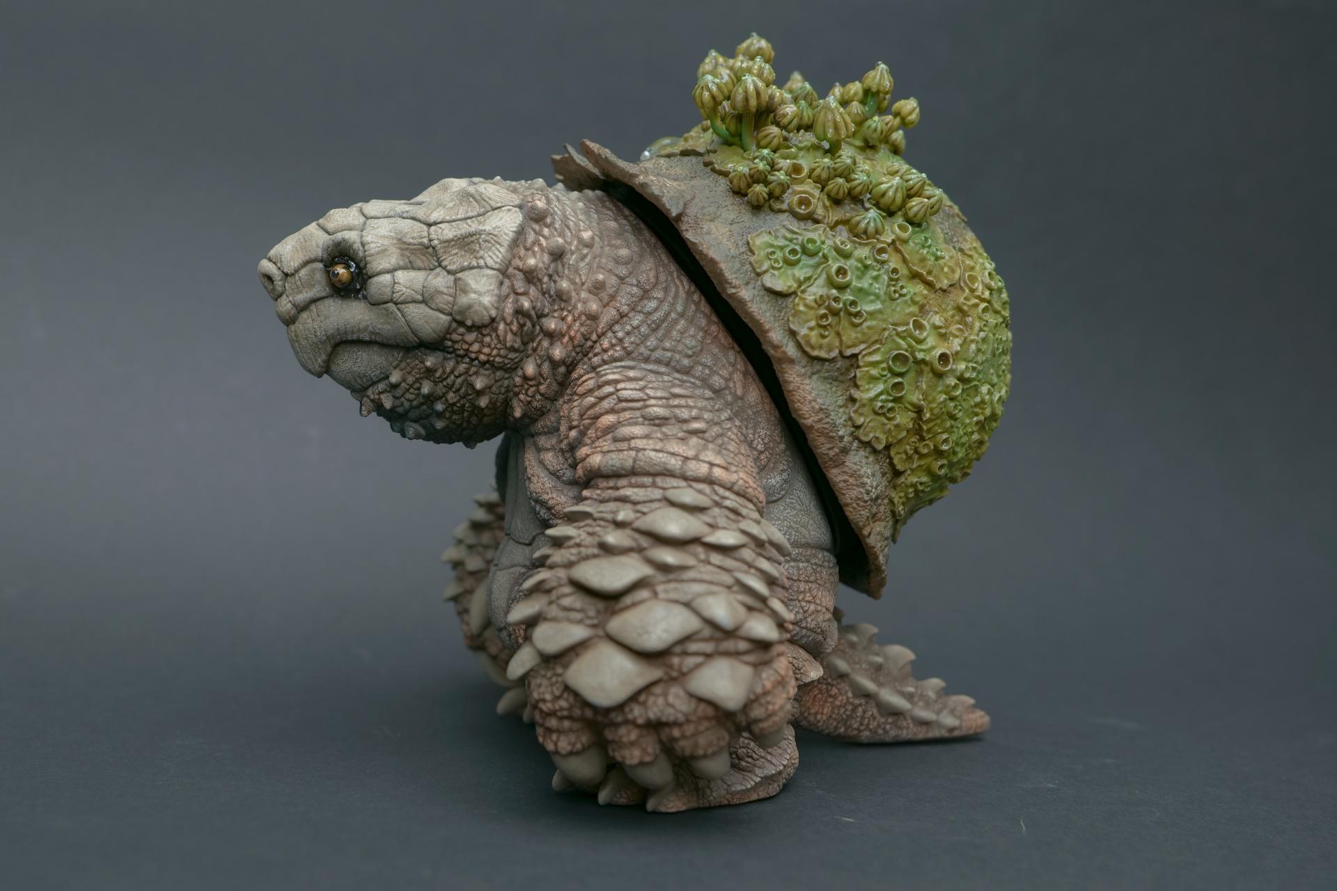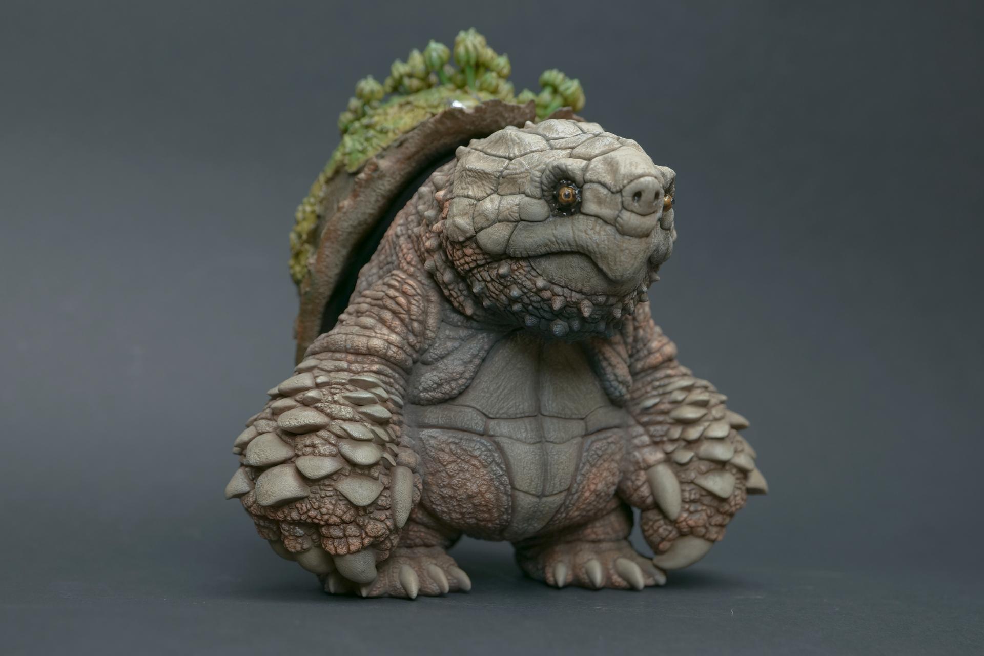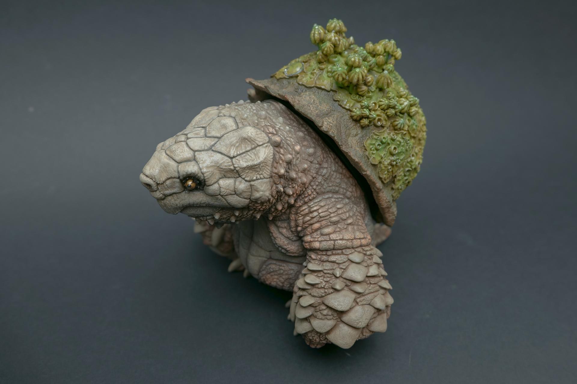 作品でカメが環境を回復させる姿は、希望と肯定的な変化に対する作家の信仰を表しています。