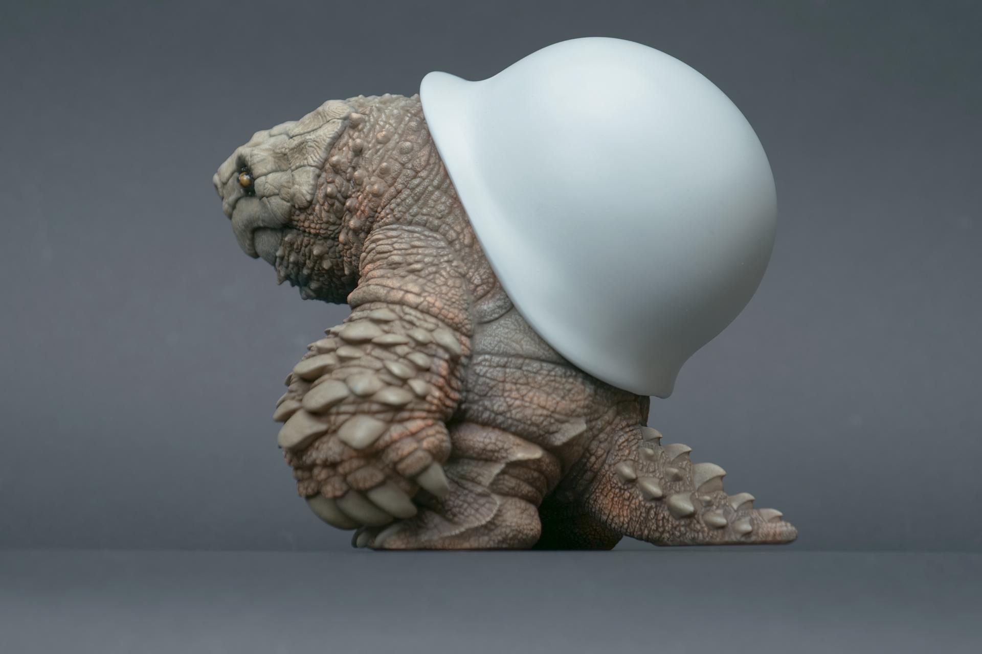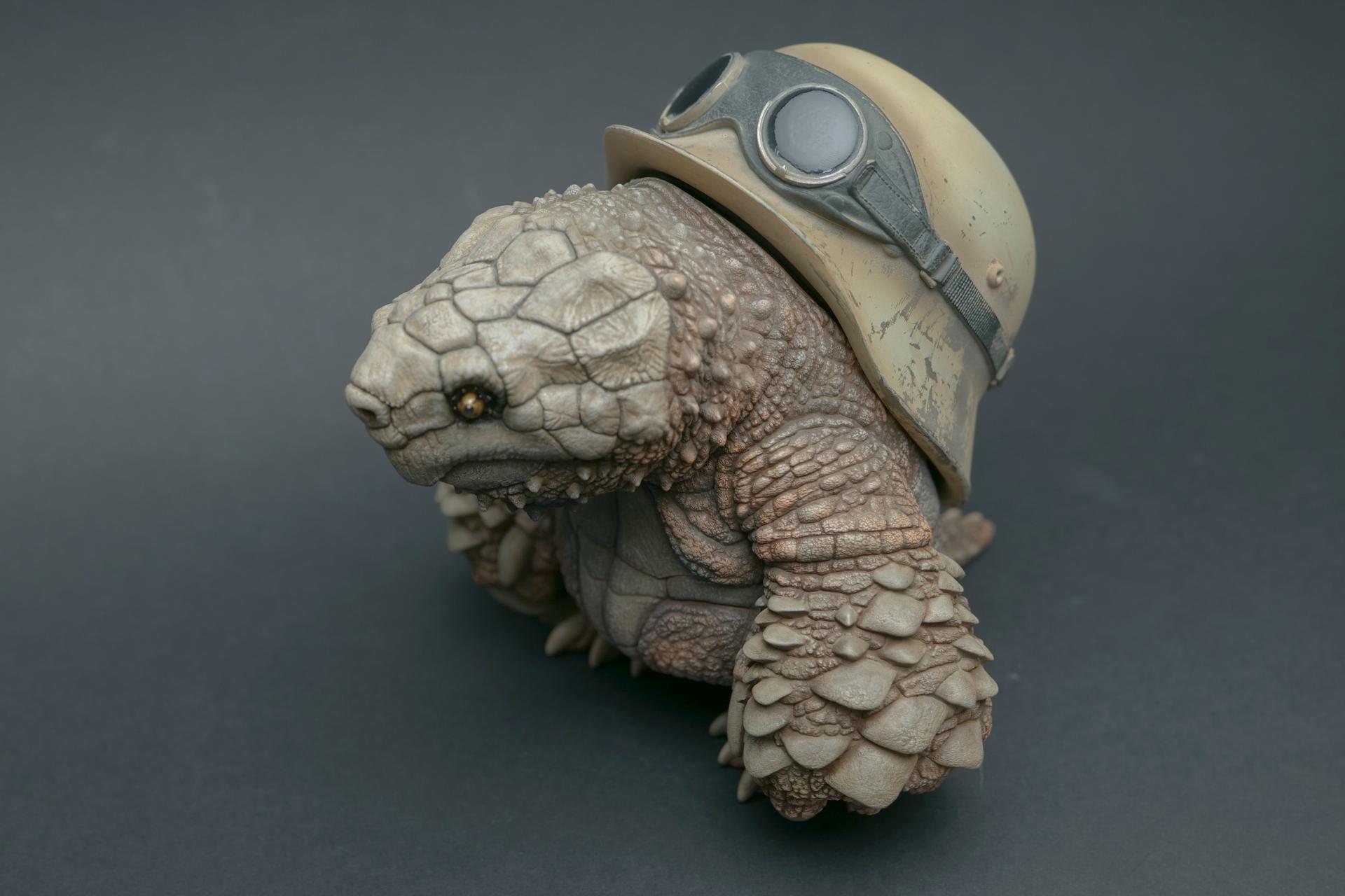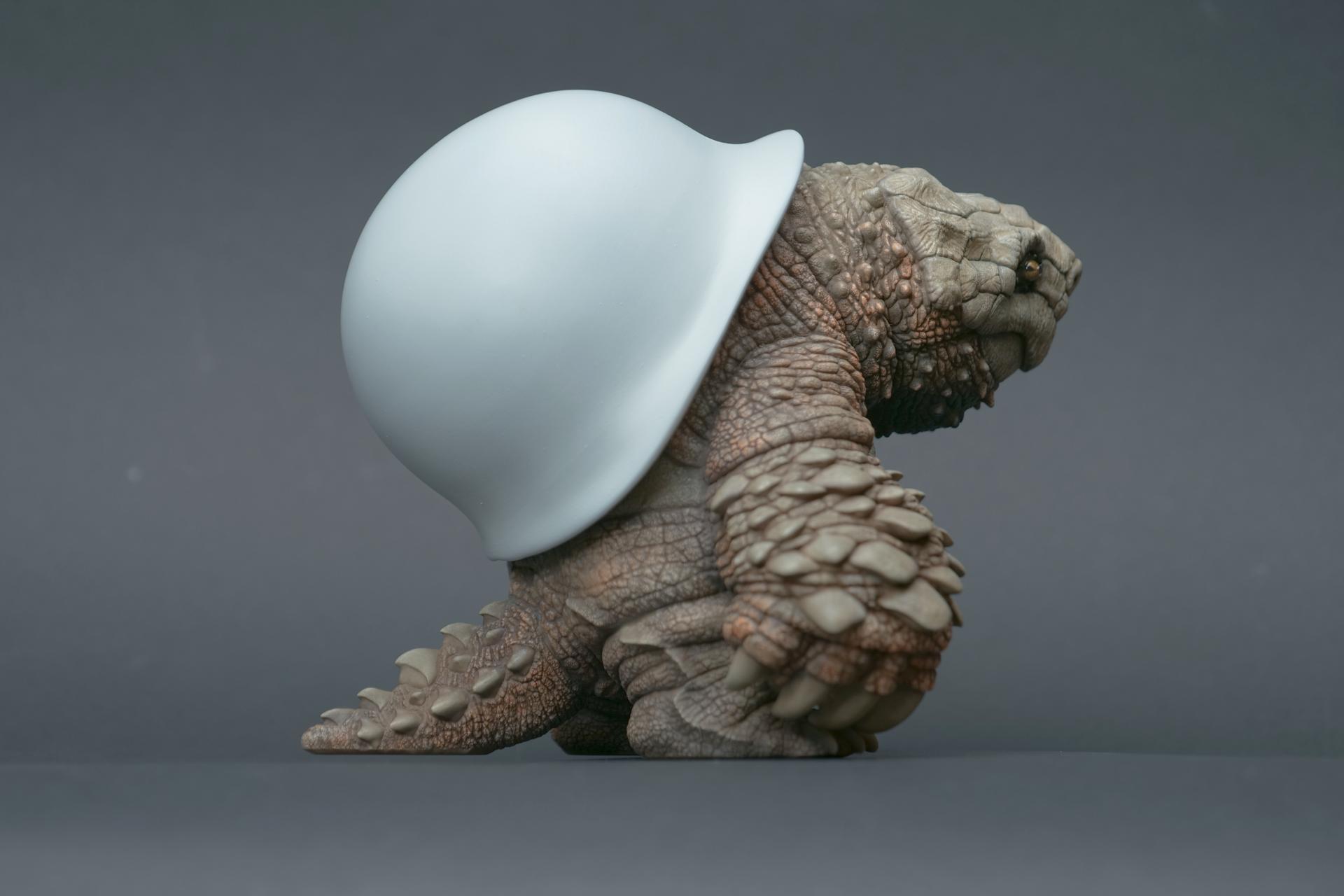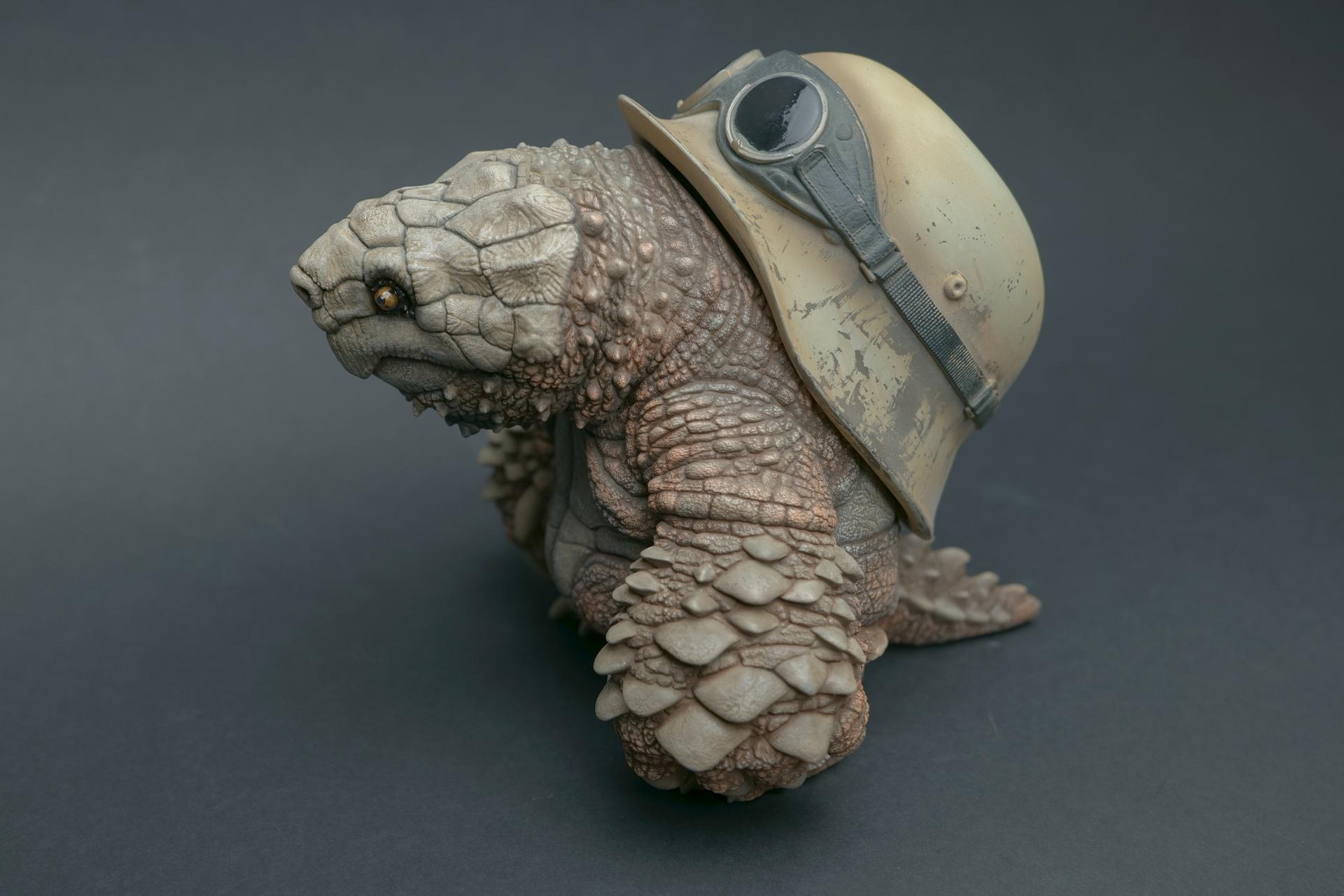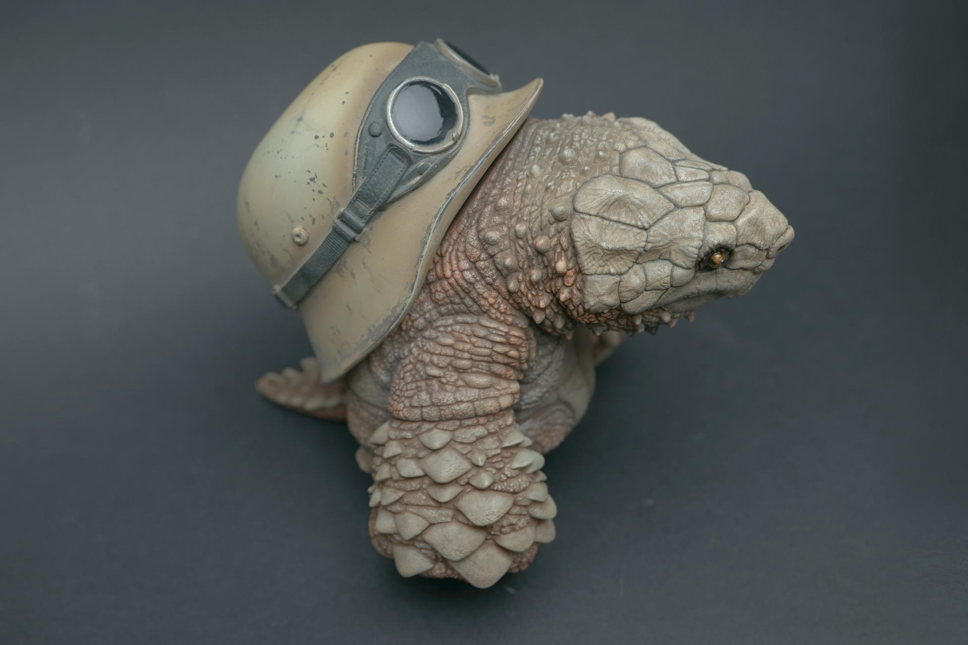 カメが身に着けているヘルメットは、物理的な保護とともに精神的安定を象徴しますが、同時に人間の恐怖や不安に対するメッセージを伝えることもあります。