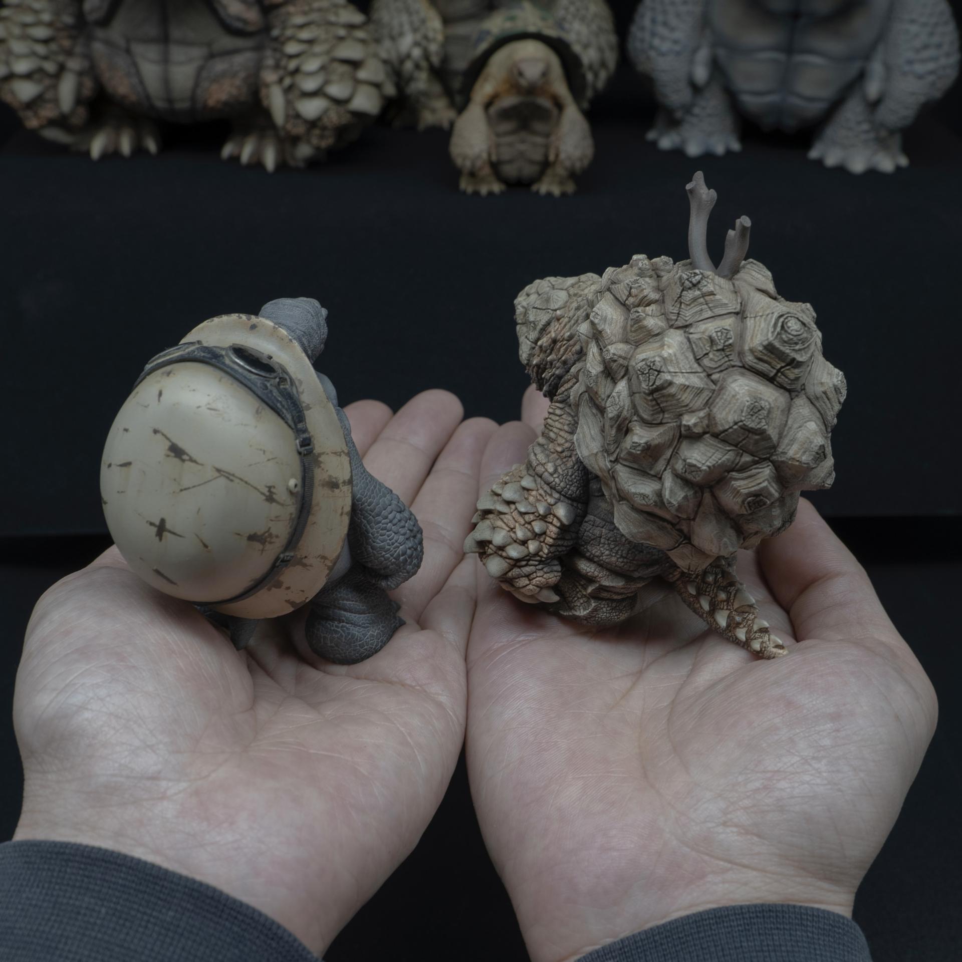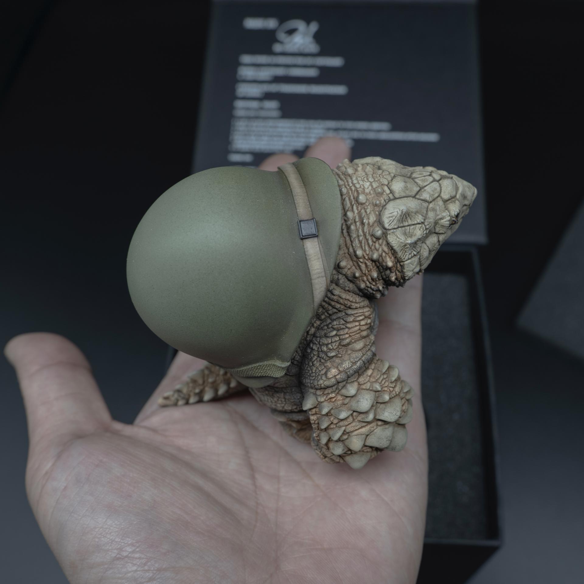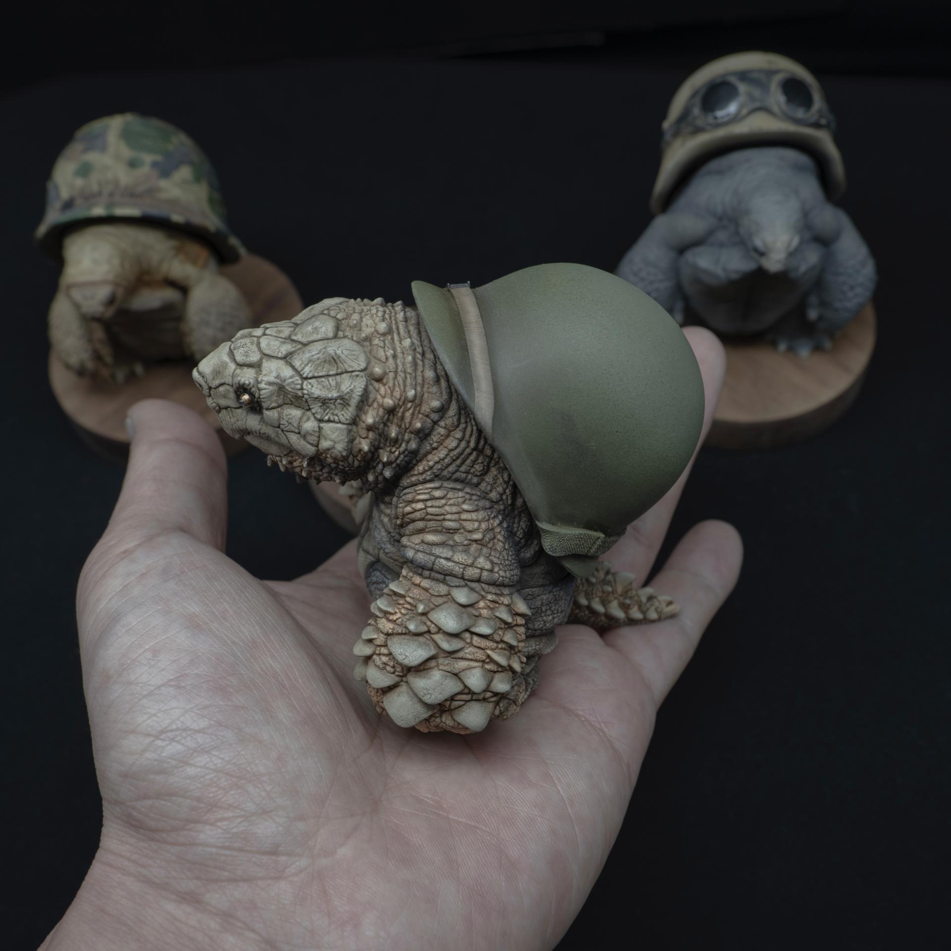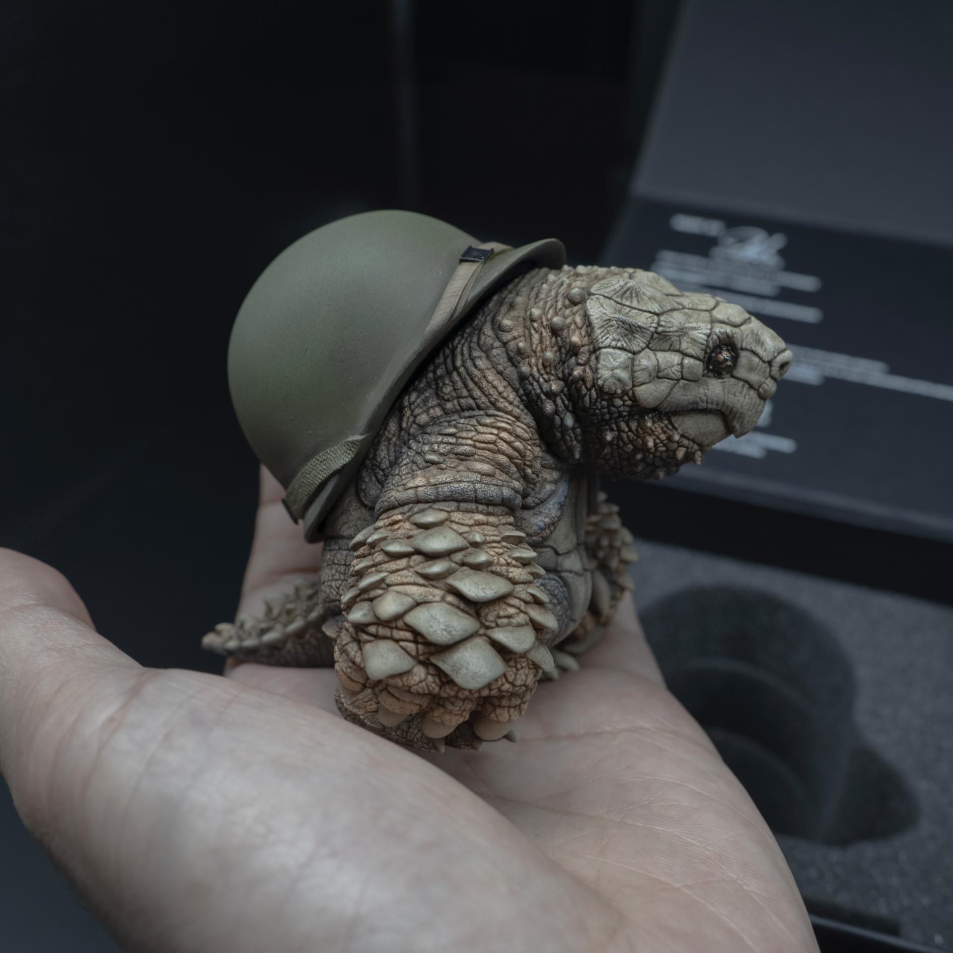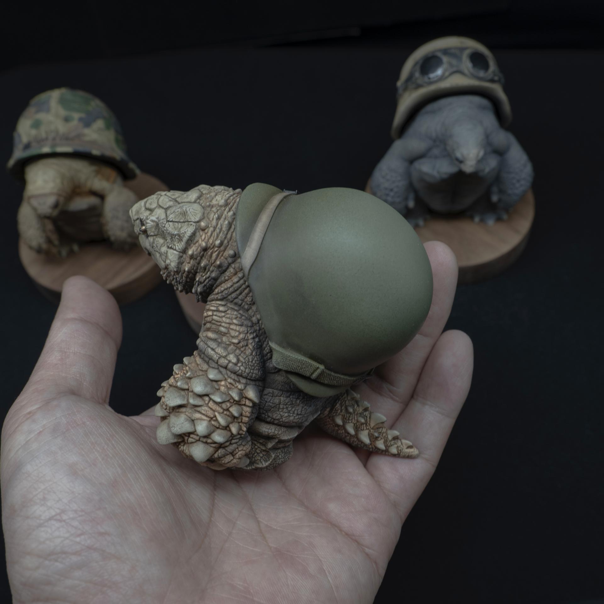 海龟佩戴的头盔象征着精神稳定和身体保护,但它们也传达了关于人类恐惧和焦虑的信息。