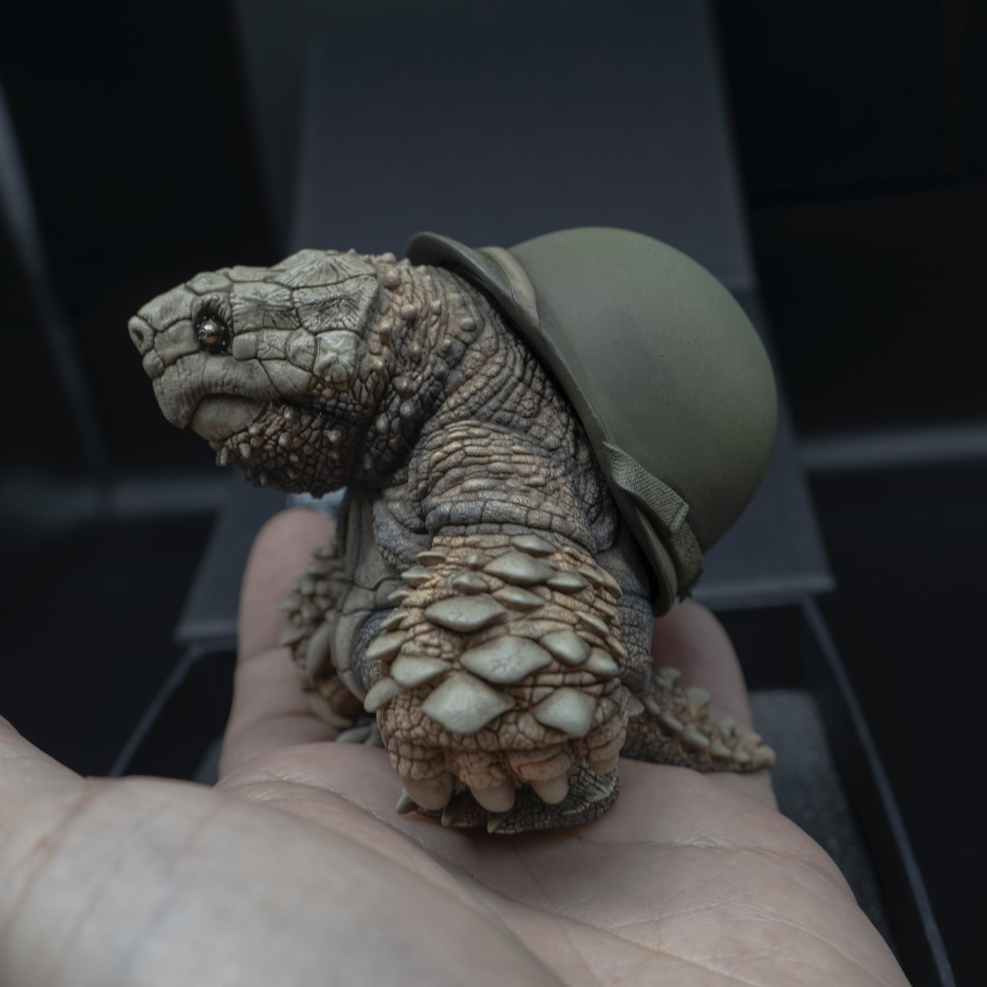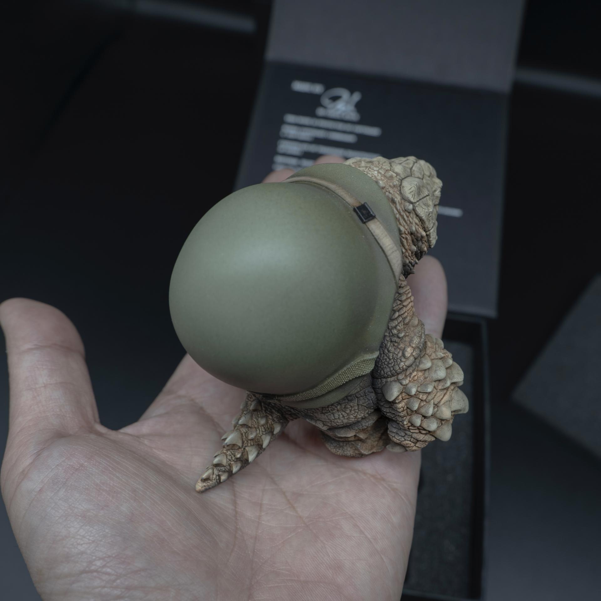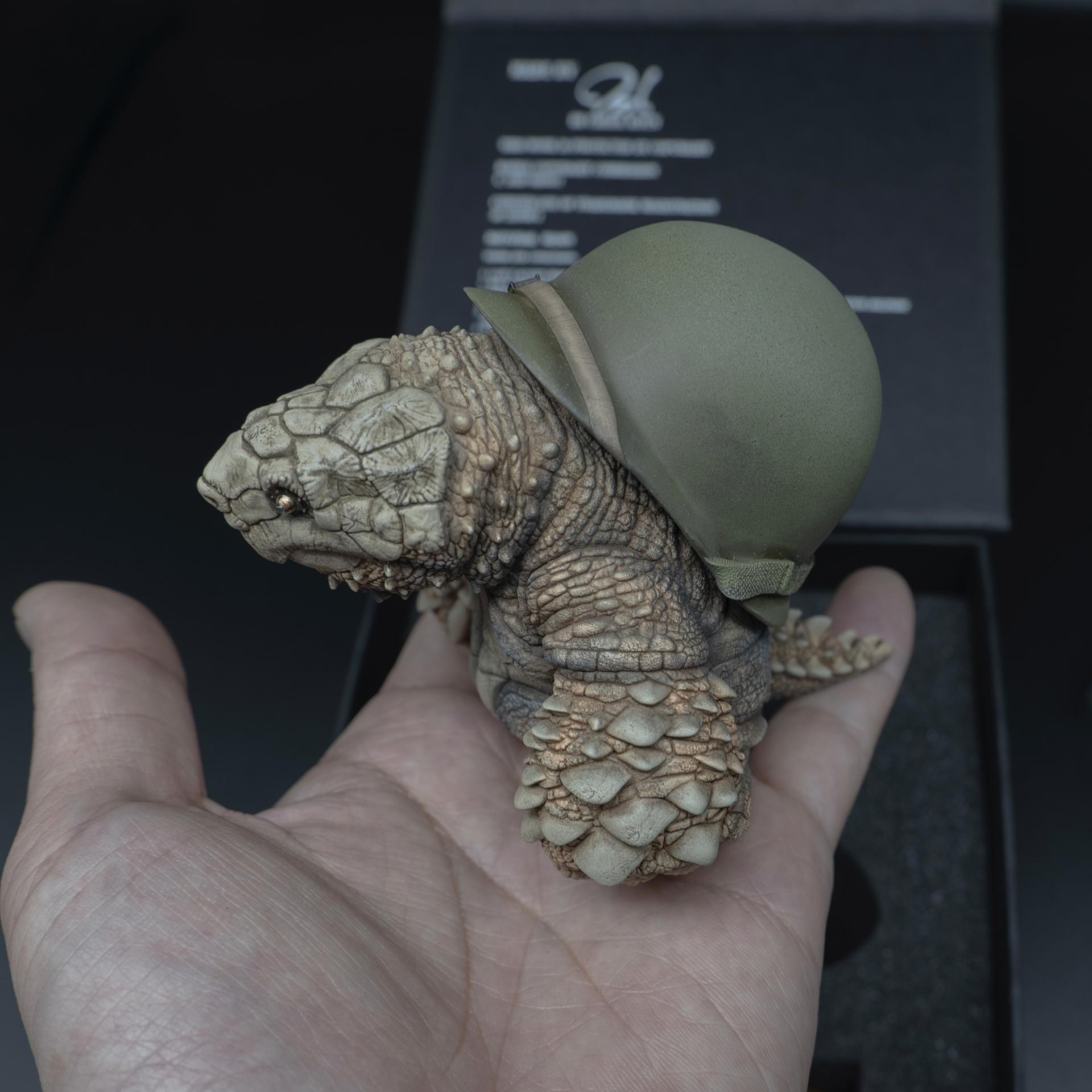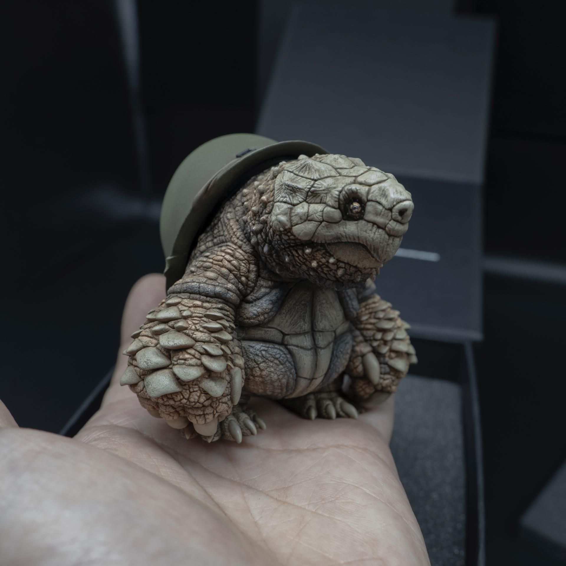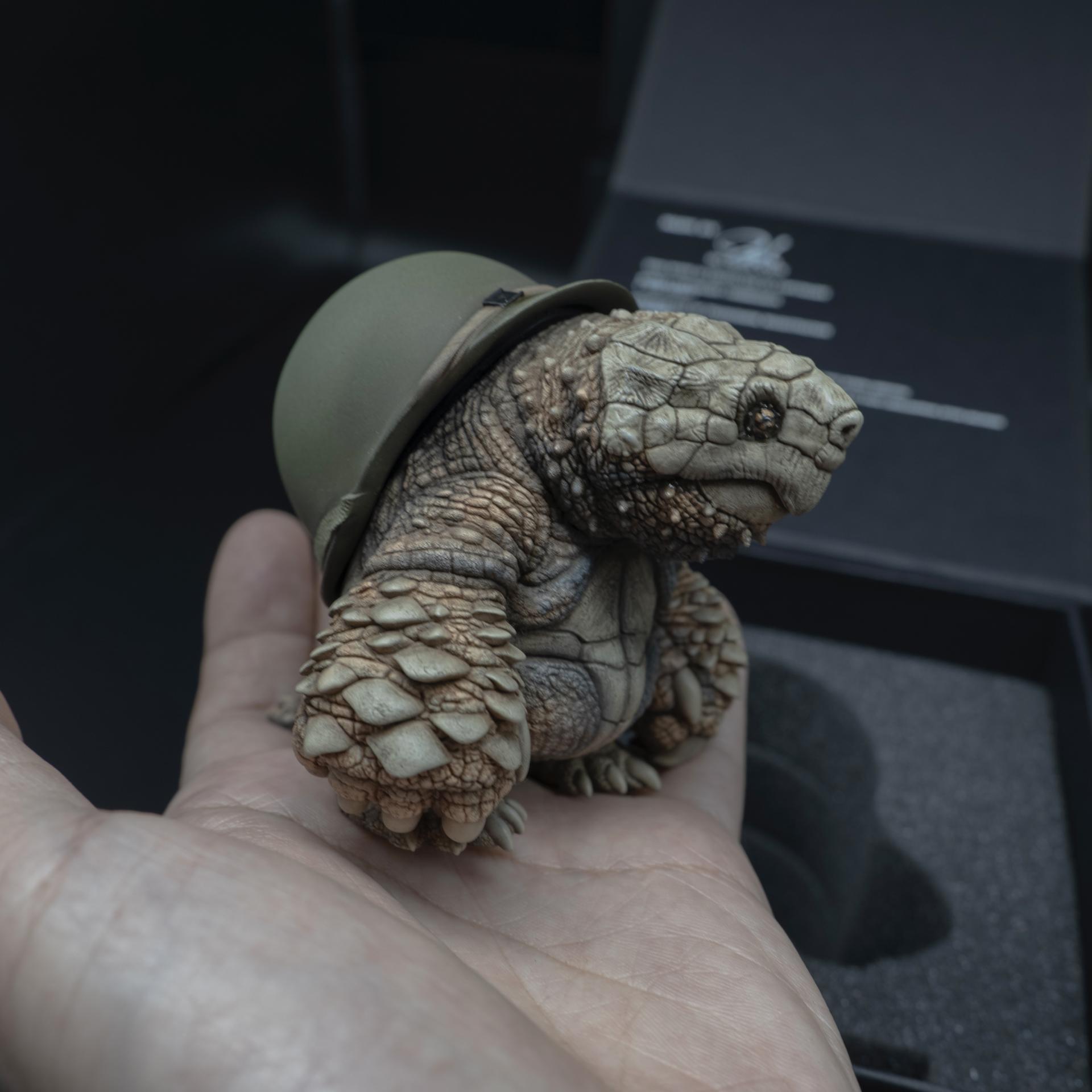海龟佩戴的头盔象征着精神稳定和身体保护,但它们也传达了关于人类恐惧和焦虑的信息。