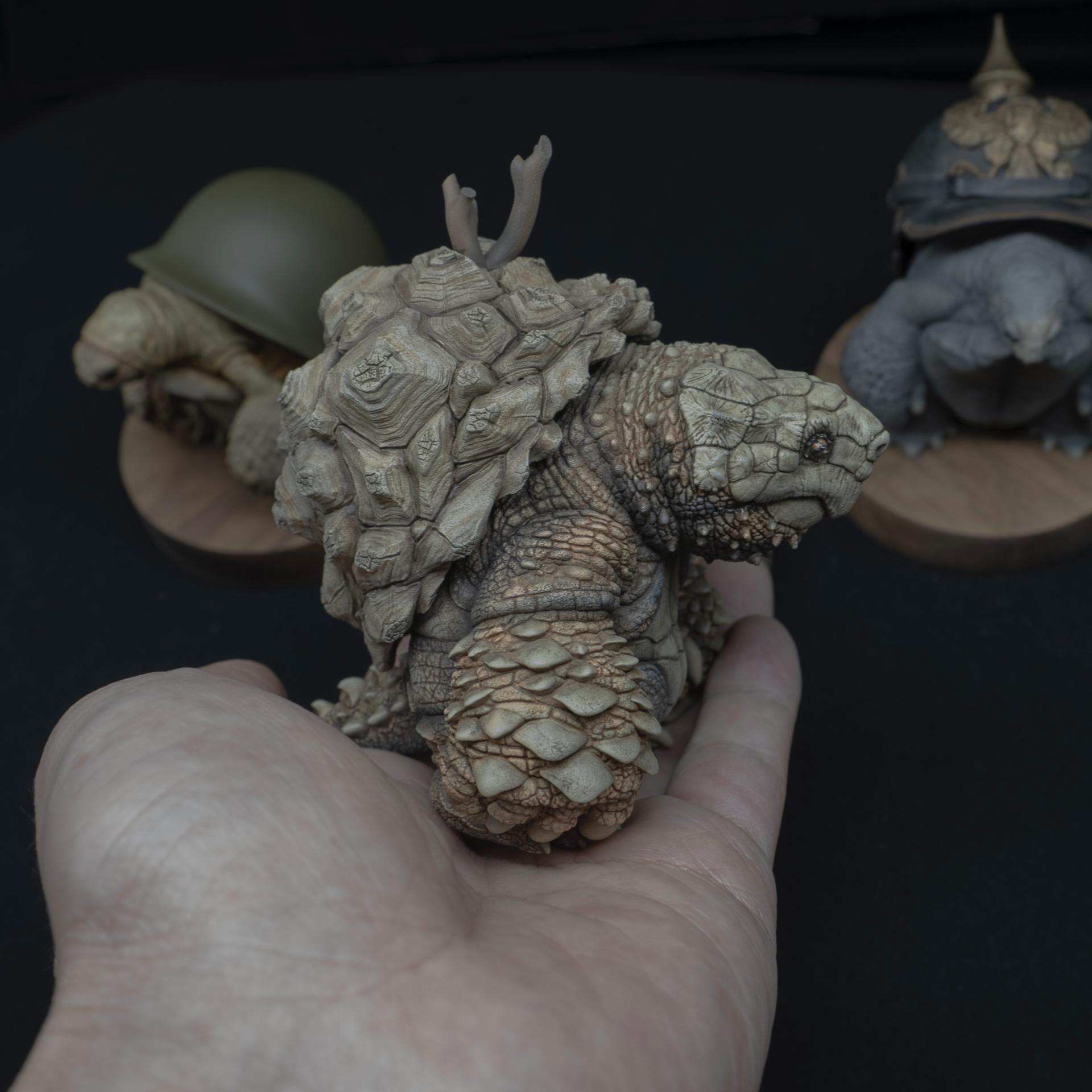 さまざまなヘルメットを着用し、他の動物と共存するカメは、社会的多様性と協力の重要性を強調しています。